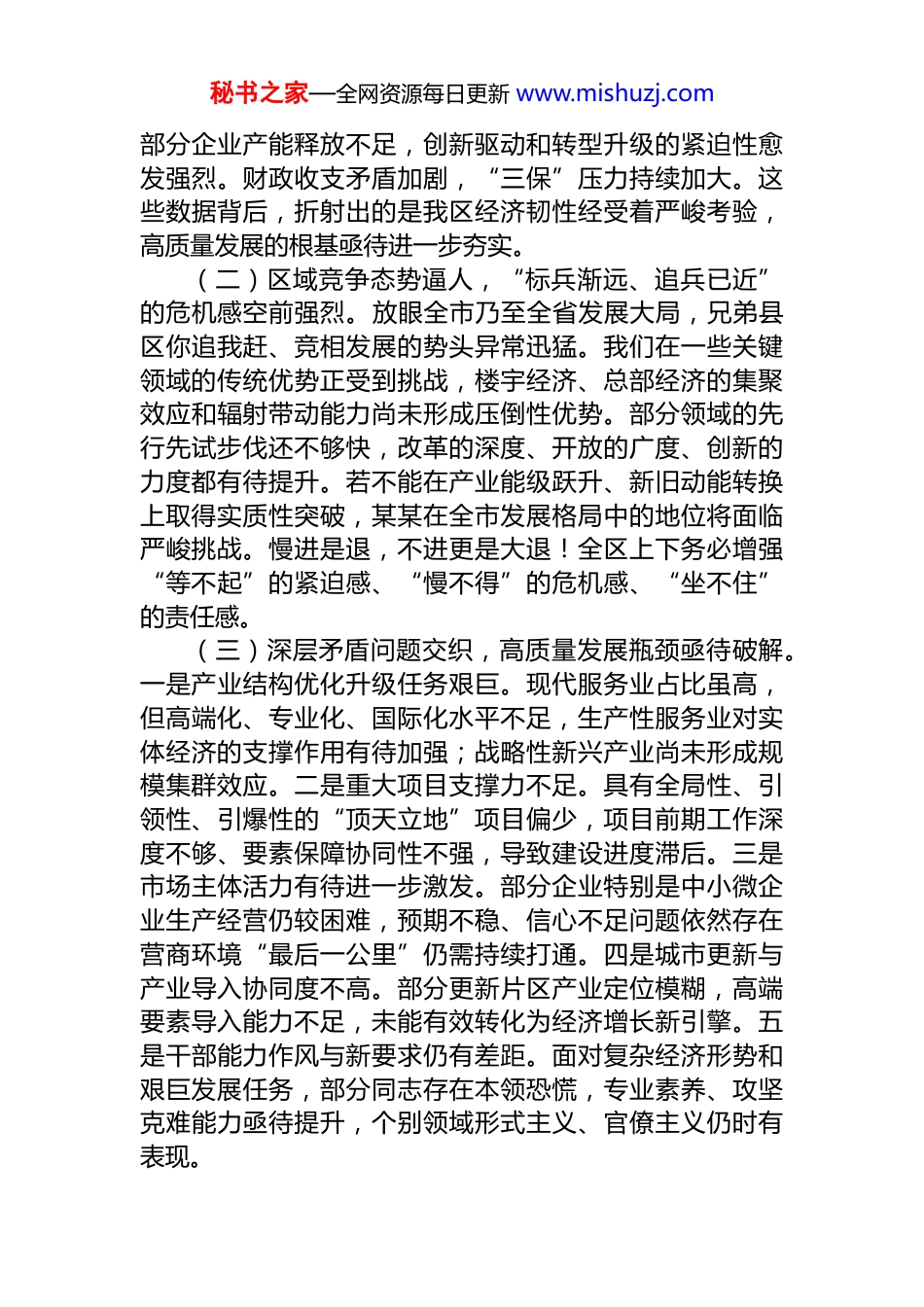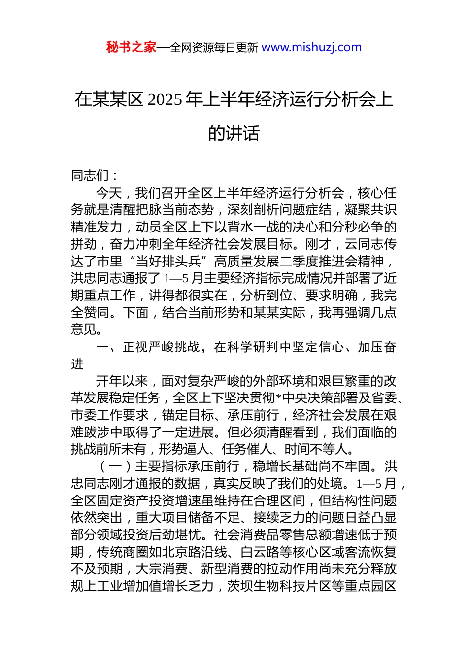 秘书之家—全网资源每日更新 www.mishuzj.com在某某区 2025 年上半年经济运行分析会上的讲话同志们:今天,我们召开全区上半年经济运行分析会,核心任务就是清醒把脉当前态势,深刻剖析问题症结,凝聚共识精准发力,动员全区上下以背水一战的决心和分秒必争的拼劲,奋力冲刺全年经济社会发展目标。刚才,云同志传达了市里“当好排头兵”高质量发展二季度推进会精神,洪忠同志通报了 1—5 月主要经济指标完成情况并部署了近期重点工作,讲得都很实在,分析到位、要求明确,我完全赞同。下面,结合当前形势和某某实际,我再强调几点意见。一、正视严峻挑战,在科学研判中坚定信心、加压奋进开年以来,面对复杂严峻的外部环境和艰巨繁重的改革发展稳定任务,全区上下坚决贯彻*中央决策部署及省委、市委工作要求,锚定目标、承压前行,经济社会发展在艰难跋涉中取得了一定进展。但必须清醒看到,我们面临的挑战前所未有,形势逼人、任务催人、时间不等人。(一)主要指标承压前行,稳增长基础尚不牢固。洪忠同志刚才通报的数据,真实反映了我们的处境。1—5 月,全区固定资产投资增速虽维持在合理区间,但结构性问题依然突出,重大项目储备不足、接续乏力的问题日益凸显部分领域投资后劲堪忧。社会消费品零售总额增速低于预期,传统商圈如北京路沿线、白云路等核心区域客流恢复不及预期,大宗消费、新型消费的拉动作用尚未充分释放规上工业增加值增长乏力,茨坝生物科技片区等重点园区秘书之家—全网资源每日更新 www.mishuzj.com部分企业产能释放不足,创新驱动和转型升级的紧迫性愈发强烈。财政收支矛盾加剧,“三保”压力持续加大。这些数据背后,折射出的是我区经济韧性经受着严峻考验,高质量发展的根基亟待进一步夯实。(二)区域竞争态势逼人,“标兵渐远、追兵已近”的危机感空前强烈。放眼全市乃至全省发展大局,兄弟县区你追我赶、竞相发展的势头异常迅猛。我们在一些关键领域的传统优势正受到挑战,楼宇经济、总部经济的集聚效应和辐射带动能力尚未形成压倒性优势。部分领域的先行先试步伐还不够快,改革的深度、开放的广度、创新的力度都有待提升。若不能在产业能级跃升、新旧动能转换上取得实质性突破,某某在全市发展格局中的地位将面临严峻挑战。慢进是退,不进更是大退!全区上下务必增强“等不起”的紧迫感、“慢不得”的危机感、“坐不住”的责任感。(三)深层矛盾问题交织,高质量发展瓶颈亟待破解。一是产业结构优化升级任务艰巨。现代服务业占比虽高,但高端化、专业化、国际化水平不足,生产性服务业对实体经济的支撑作用有待加强;战略性新兴产业尚未形成规模集群效应。二是重大项目支撑力不足。具有全局性、引领性、引爆性的“顶天立地”项目偏少,项目前期工作深度不够、要素保障协同性不强,导致建设进度滞后。三是市场主体活力有待进一步激发。部分企业特别是中小微企业生产经营仍较困难,预期不稳、信心不足问题依然存在营商环境“最后一公里”仍需持续打通。四是城市更新与产业导入协同度不高。部分更新片区产业定位模糊,高端要素导入能力不足,未能有效转化为经济增长新引擎。五是干部能力作风与新要求仍有差距。面对复杂经济形势和艰巨发展任务,部分同志存在本领恐慌,专业素养、攻坚克难能力亟待提升,个别领域形式主义、官僚主义仍时有表现。秘书之家—全网资源每日更新 www.mishuzj.com在正视困难挑战的同时,我们更要看到某某区发展的坚实基础和独特优势,坚定必胜信心。信心来自中央及省市宏观政策的持续发力,来自我区长期积累的坚实家底:中央商务区(cbd)的金融、总部集聚效应日益增强,楼宇经济持续提质增效;北京路、东风广场等传统商圈底蕴深厚,转型潜力巨大;茨坝生物科技特色产业基础扎实;北部山水新城、东白沙河等重点片区开发空间广阔;深厚的历史文化底蕴和丰富的生态资源(如松华坝水源保护区)是宝贵财富。特别是全区干部队伍在历次攻坚克难中锤炼出的过硬作风,是我们最可依靠的力量。关键是要把信心转化为决心,把优势转化为胜势,以超常规的力度和举措把失去的时间抢回来,把落下的进度赶上去!二、聚焦关键要害,...