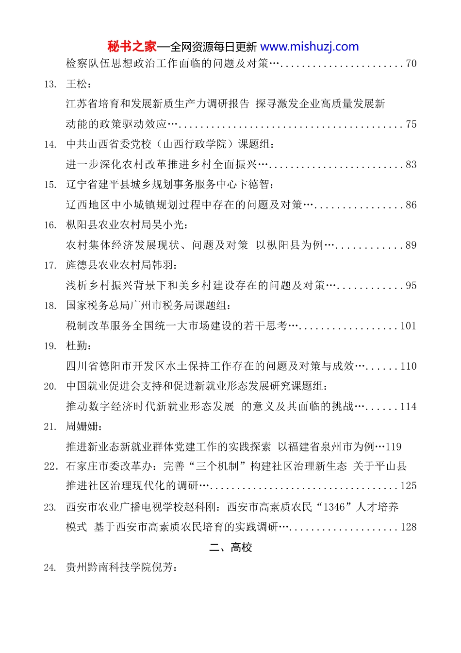 秘书之家—全网资源每日更新 www.mishuzj.com目 录一、党政机关1.浙江省财政厅农业处课题组:“大人才观”指引下 财政支持培育现代 “新农人”政策研究 以浙江省为例.................................1 2.六安社会科学创新发展研究课题组: 安徽六安对口合作视域下乡村产业振兴研究…........................8 3. 北京市农村经济研究中心课题组: 北京市“百千工程”.............................................13 4. 定远县农业农村局蒋士凯: 定远县农业产业发展存在的问题及对策…..........................23 5. 中华合作时报社社长曾峰: 多方联合破解农村物流困局 关于辽宁省法库县供销合作社三级物流体系打通快递进村“最后一公里”的调研...............................30 6. 河北省美丽乡村建设中心课题组: 关于加快推进河北省乡村建设的对策建议…........................35 7. 四平市政协调研组:关于深入实施“十百千万”工程推动和美乡村建设 提档升级的建言报告…...........................................40 8. 河南省滑县财政局索振强: 关于乡镇财政管理的研究与建议 基于对河南省 X 县的调研...........46 9. 积极破解基层工会经费保障难题 来自甘肃省天水市的调研报告........51 10. 中共三明市沙县区委党校阮伟强: 基层党建引领乡村振兴的实践探索 以福建省沙县区夏茂镇为例…....57 11. 峡江县巴邱镇政务服务中心朱建军: 吉安市林长制存在问题及对策….................................65 12. 江苏省徐州市人民检察院宣传教育处处长张志远: 秘书之家—全网资源每日更新 www.mishuzj.com检察队伍思想政治工作面临的问题及对策….......................70 13. 王松: 江苏省培育和发展新质生产力调研报告 探寻激发企业高质量发展新 动能的政策驱动效应….........................................75 14. 中共山西省委党校(山西行政学院)课题组: 进一步深化农村改革推进乡村全面振兴….........................83 15. 辽宁省建平县城乡规划事务服务中心卞德智: 辽西地区中小城镇规划过程中存在的问题及对策…................86 16. 枞阳县农业农村局吴小光: 农村集体经济发展现状、问题及对策 以枞阳县为例…............89 17. 旌德县农业农村局韩羽: 浅析乡村振兴背景下和美乡村建设存在的问题及对策…............95 18. 国家税务总局广州市税务局课题组: 税制改革服务全国统一大市场建设的若干思考…..................101 19. 杜勤: 四川省德阳市开发区水土保持工作存在的问题及对策与成效…......110 20. 中国就业促进会支持和促进新就业形态发展研究课题组: 推动数字经济时代新就业形态发展 的意义及其面临的挑战…......114 21. 周姗姗: 推进新业态新就业群体党建工作的实践探索 以福建省泉州市为例…119 22.石家庄市委改革办:完善“三个机制”构建社区治理新生态 关于平山县 推进社区治理现代化的调研…...................................125 23. 西安市农业广播电视学校赵科刚:西安市高素质农民“1346”人才培养 模式 基于西安市高素质农民培育的实践调研…....................128 二、高校24. 贵州黔南科技学院倪芳: 秘书之家—全网资源每日更新 www.mishuzj.com大学生村官制度存在问题及对策分析…..........................135 25. 空军军医大学刘慧: 大中小学思政课一体化建设现状与路径 基于 X 市调研数据分析……140 26.王娟、胡越:大中小学思政课一体化教学衔接现状与对策分析 基于 17 所 学校的调研….................................................151 27. 孔祥营: 东北地区地方高校人才引进工作存在的问题及对策分析…..........159 28. 北京化工大学宏德书院郭艺伟: 辅导员助力大学生 高质量就业的实践探索…....................166 29. 中央民族大学经济学院陈文欣: 甘肃省天祝藏族自治县 L 村发展现状、问题及对策研究...........171 30. 王仁亮、杨事武: 高职...