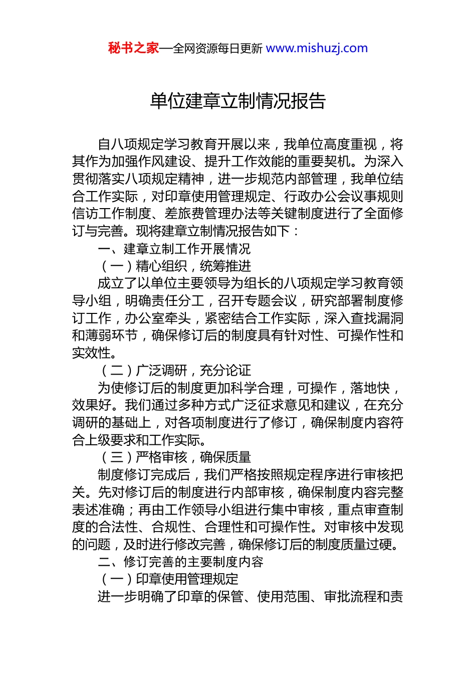 秘书之家—全网资源每日更新 www.mishuzj.com单位建章立制情况报告自八项规定学习教育开展以来,我单位高度重视,将其作为加强作风建设、提升工作效能的重要契机。为深入贯彻落实八项规定精神,进一步规范内部管理,我单位结合工作实际,对印章使用管理规定、行政办公会议事规则信访工作制度、差旅费管理办法等关键制度进行了全面修订与完善。现将建章立制情况报告如下:一、建章立制工作开展情况(一)精心组织,统筹推进成立了以单位主要领导为组长的八项规定学习教育领导小组,明确责任分工,召开专题会议,研究部署制度修订工作,办公室牵头,紧密结合工作实际,深入查找漏洞和薄弱环节,确保修订后的制度具有针对性、可操作性和实效性。(二)广泛调研,充分论证为使修订后的制度更加科学合理,可操作,落地快,效果好。我们通过多种方式广泛征求意见和建议,在充分调研的基础上,对各项制度进行了修订,确保制度内容符合上级要求和工作实际。(三)严格审核,确保质量制度修订完成后,我们严格按照规定程序进行审核把关。先对修订后的制度进行内部审核,确保制度内容完整表述准确;再由工作领导小组进行集中审核,重点审查制度的合法性、合规性、合理性和可操作性。对审核中发现的问题,及时进行修改完善,确保修订后的制度质量过硬。二、修订完善的主要制度内容(一)印章使用管理规定进一步明确了印章的保管、使用范围、审批流程和责秘书之家—全网资源每日更新 www.mishuzj.com任追溯等内容。规定印章必须由专人保管,严格履行审批手续,严禁在空白文件或介绍信上加盖印章。同时,建立了印章使用登记台账,对印章使用情况进行详细记录,确保印章使用安全、规范。(二)行政办公会议事规则完善了行政办公会的组织形式、议事范围、议事程序和决策执行等内容。明确了行政办公会的召开时间、参会人员和议题提交要求,规范了议题的讨论和决策程序,压缩会议时长和频率,进一步提高了行政办公会的决策效率和科学性。(三)信访工作制度细化了信访接待、登记、受理、办理、回复等环节的工作流程和标准。信访工作人员严格落实首接负责制,热情接待来访群众,认真倾听群众诉求,及时登记、受理和转办信访事项。同时,建立了信访事项办理跟踪反馈机制加强对信访事项办理情况的督促检查,确保群众反映的问题得到及时有效解决。(四)差旅费管理办法对差旅费的开支范围、标准、审批流程和报销要求等进行了明确规定。依据上级标准,制定了相应的差旅费标准,严格控制差旅费支出。同时,加强了对差旅费报销的审核把关,要求报销人员提供真实、完整的报销凭证,对不符合规定的费用一律不予报销。三、经验成效(一)作风建设得到加强通过修订完善各项制度,进一步规范了干部职工的工作行为,增强了纪律意识和规矩意识。干部职工能够自觉遵守制度规定,严格按照程序办事,工作作风更加严谨、务实,工作效率和服务质量得到了显著提升。(二)内部管理更加规范明确了工作流程和标准,使内部管理更加科学、规范、秘书之家—全网资源每日更新 www.mishuzj.com有序。特别是在印章使用、行政办公、信访处理和差旅费管理等方面,建立了严格的监督制约机制,有效降低了廉政风险等级。(三)群众满意度明显提高信访工作制度的完善,加强了群众沟通,积极回应群众关切,进一步密切了*群干群关系。四、制度的固化与长效机制建设(一)加强制度宣传教育为确保修订后的制度得到全面贯彻执行,我们将通过多种方式加强制度宣传教育。组织干部职工集中学习新修订的制度,使干部职工深刻理解制度的内容和要求。同时将制度汇编成册,发放到各内设机构,方便干部职工随时查阅学习。(二)强化制度执行监督建立健全制度执行监督检查机制,定期对制度执行情况进行检查评估。加强对重点领域、关键环节的监督检查还将依规处理发现的问题。(三)持续完善制度体系制度建设是一个动态的过程,需要随着形势任务的变化和工作实际的需要不断进行调整和完善。我们将定期对各项制度进行评估和修订,及时清理过时、失效的制度,补充完善新的制度,确保制度体系始终适应工作发展的需要。五、下一步工作计划(一)深化制度...