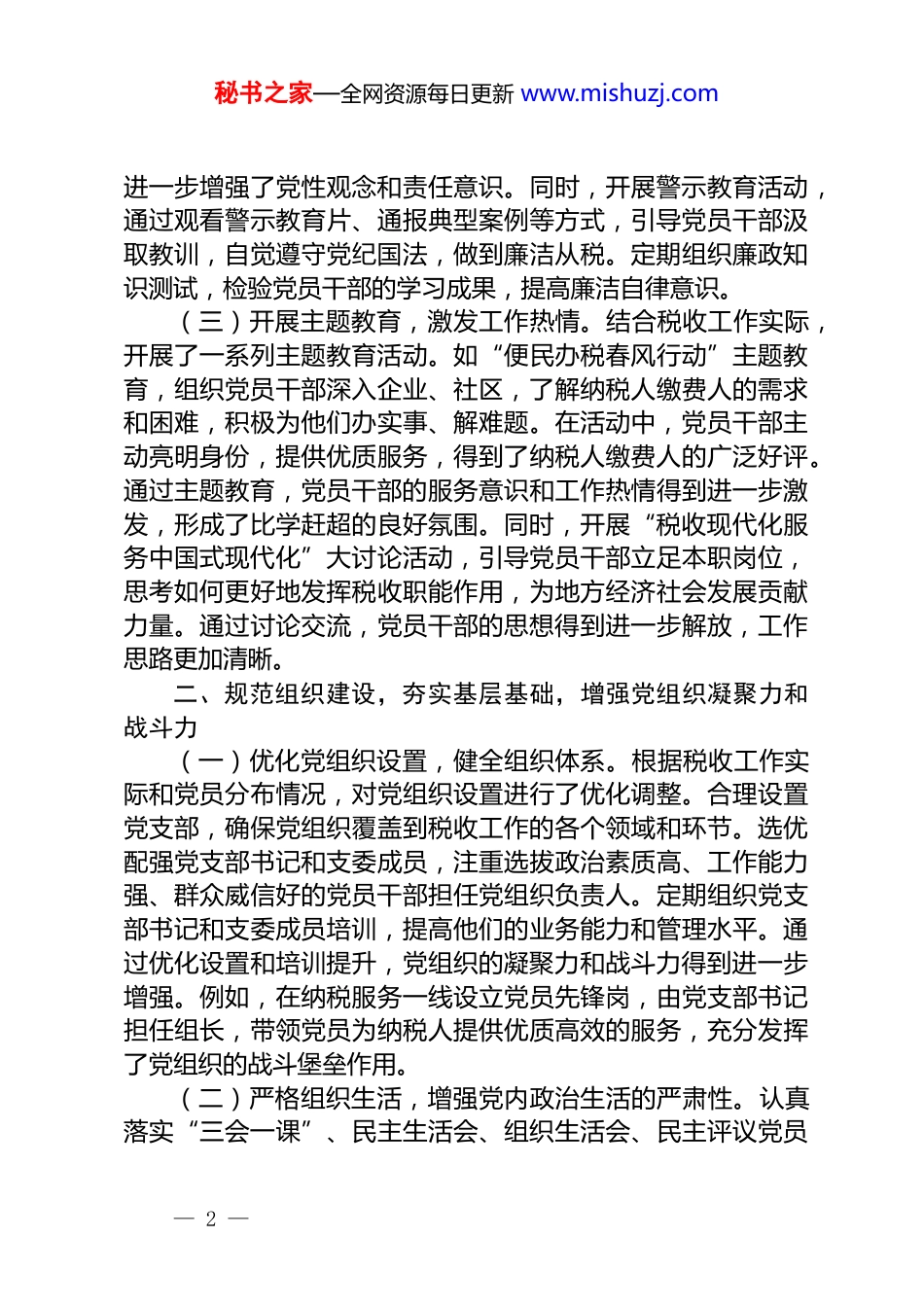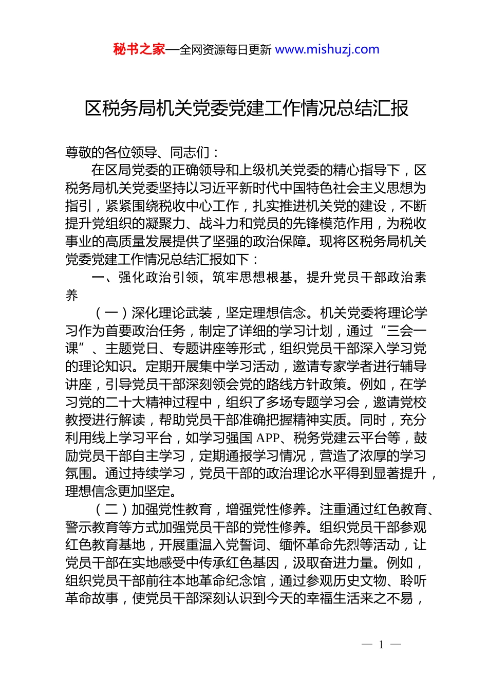 秘书之家—全网资源每日更新 www.mishuzj.com区税务局机关党委党建工作情况总结汇报尊敬的各位领导、同志们:在区局党委的正确领导和上级机关党委的精心指导下,区税务局机关党委坚持以习近平新时代中国特色社会主义思想为指引,紧紧围绕税收中心工作,扎实推进机关党的建设,不断提升党组织的凝聚力、战斗力和党员的先锋模范作用,为税收事业的高质量发展提供了坚强的政治保障。现将区税务局机关党委党建工作情况总结汇报如下:一、强化政治引领,筑牢思想根基,提升党员干部政治素养(一)深化理论武装,坚定理想信念。机关党委将理论学习作为首要政治任务,制定了详细的学习计划,通过“三会一课”、主题党日、专题讲座等形式,组织党员干部深入学习党的理论知识。定期开展集中学习活动,邀请专家学者进行辅导讲座,引导党员干部深刻领会党的路线方针政策。例如,在学习党的二十大精神过程中,组织了多场专题学习会,邀请党校教授进行解读,帮助党员干部准确把握精神实质。同时,充分利用线上学习平台,如学习强国 APP、税务党建云平台等,鼓励党员干部自主学习,定期通报学习情况,营造了浓厚的学习氛围。通过持续学习,党员干部的政治理论水平得到显著提升,理想信念更加坚定。(二)加强党性教育,增强党性修养。注重通过红色教育、警示教育等方式加强党员干部的党性修养。组织党员干部参观红色教育基地,开展重温入党誓词、缅怀革命先烈等活动,让党员干部在实地感受中传承红色基因,汲取奋进力量。例如,组织党员干部前往本地革命纪念馆,通过参观历史文物、聆听革命故事,使党员干部深刻认识到今天的幸福生活来之不易,— 1 —秘书之家—全网资源每日更新 www.mishuzj.com进一步增强了党性观念和责任意识。同时,开展警示教育活动,通过观看警示教育片、通报典型案例等方式,引导党员干部汲取教训,自觉遵守党纪国法,做到廉洁从税。定期组织廉政知识测试,检验党员干部的学习成果,提高廉洁自律意识。(三)开展主题教育,激发工作热情。结合税收工作实际,开展了一系列主题教育活动。如“便民办税春风行动”主题教育,组织党员干部深入企业、社区,了解纳税人缴费人的需求和困难,积极为他们办实事、解难题。在活动中,党员干部主动亮明身份,提供优质服务,得到了纳税人缴费人的广泛好评。通过主题教育,党员干部的服务意识和工作热情得到进一步激发,形成了比学赶超的良好氛围。同时,开展“税收现代化服务中国式现代化”大讨论活动,引导党员干部立足本职岗位,思考如何更好地发挥税收职能作用,为地方经济社会发展贡献力量。通过讨论交流,党员干部的思想得到进一步解放,工作思路更加清晰。二、规范组织建设,夯实基层基础,增强党组织凝聚力和战斗力(一)优化党组织设置,健全组织体系。根据税收工作实际和党员分布情况,对党组织设置进行了优化调整。合理设置党支部,确保党组织覆盖到税收工作的各个领域和环节。选优配强党支部书记和支委成员,注重选拔政治素质高、工作能力强、群众威信好的党员干部担任党组织负责人。定期组织党支部书记和支委成员培训,提高他们的业务能力和管理水平。通过优化设置和培训提升,党组织的凝聚力和战斗力得到进一步增强。例如,在纳税服务一线设立党员先锋岗,由党支部书记担任组长,带领党员为纳税人提供优质高效的服务,充分发挥了党组织的战斗堡垒作用。(二)严格组织生活,增强党内政治生活的严肃性。认真落实“三会一课”、民主生活会、组织生活会、民主评议党员— 2 —秘书之家—全网资源每日更新 www.mishuzj.com等制度,确保党内政治生活正常化、规范化。定期召开支部党员大会、支部委员会和党小组会,开展党课教育,及时传达上级党组织的决策部署,研究解决党内重要问题。在民主生活会和组织生活会上,党员干部认真开展批评与自我批评,查找自身存在的问题和不足,明确整改方向和措施。民主评议党员工作坚持标准、严格程序,确保评议结果客观公正。通过严格组织生活,党员干部的党性观念得到进一步增强,党内政治生活的严肃性得到进一步提升。(三)加强党员管理,激发党员活力。建立健全党员管理机制,加强...