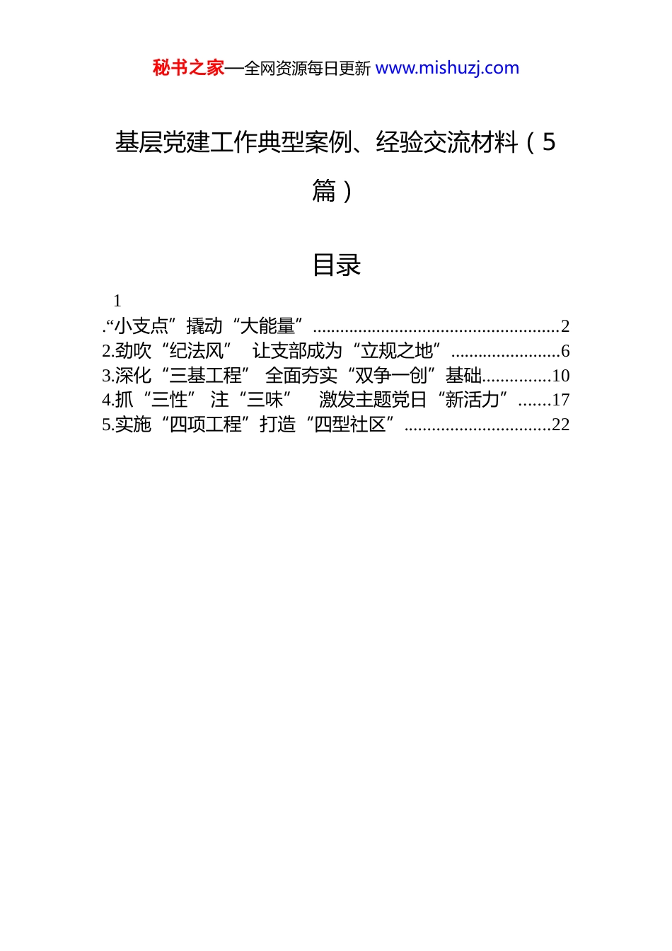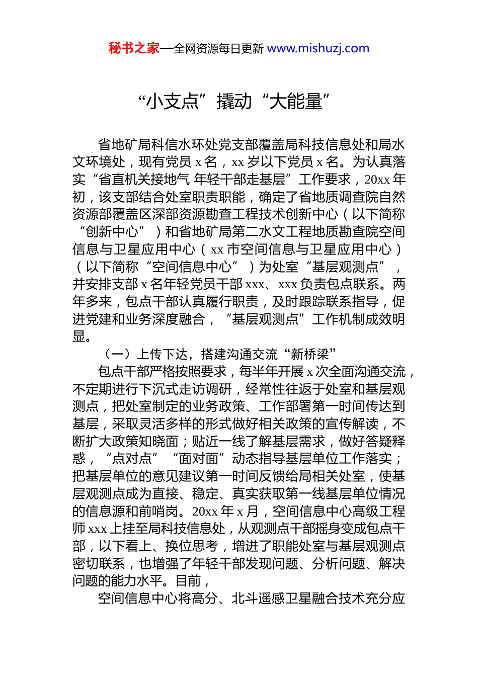 秘书之家—全网资源每日更新 www.mishuzj.com基层党建工作典型案例、经验交流材料(5篇)目录1.“小支点”撬动“大能量”......................................................22.劲吹“纪法风” 让支部成为“立规之地”........................63.深化“三基工程” 全面夯实“双争一创”基础...............104.抓“三性” 注“三味” 激发主题党日“新活力”.......175.实施“四项工程”打造“四型社区”................................22秘书之家—全网资源每日更新 www.mishuzj.com“小支点”撬动“大能量”省地矿局科信水环处党支部覆盖局科技信息处和局水文环境处,现有党员 x 名,xx 岁以下党员 x 名。为认真落实“省直机关接地气 年轻干部走基层”工作要求,20xx 年初,该支部结合处室职责职能,确定了省地质调查院自然资源部覆盖区深部资源勘查工程技术创新中心(以下简称“创新中心”)和省地矿局第二水文工程地质勘查院空间信息与卫星应用中心(xx 市空间信息与卫星应用中心)(以下简称“空间信息中心”)为处室“基层观测点”,并安排支部 x 名年轻党员干部 xxx、xxx 负责包点联系。两年多来,包点干部认真履行职责,及时跟踪联系指导,促进党建和业务深度融合,“基层观测点”工作机制成效明显。(一)上传下达,搭建沟通交流“新桥梁”包点干部严格按照要求,每半年开展 x 次全面沟通交流,不定期进行下沉式走访调研,经常性往返于处室和基层观测点,把处室制定的业务政策、工作部署第一时间传达到基层,采取灵活多样的形式做好相关政策的宣传解读,不断扩大政策知晓面;贴近一线了解基层需求,做好答疑释惑,“点对点”“面对面”动态指导基层单位工作落实;把基层单位的意见建议第一时间反馈给局相关处室,使基层观测点成为直接、稳定、真实获取第一线基层单位情况的信息源和前哨岗。20xx 年 x 月,空间信息中心高级工程师 xxx 上挂至局科技信息处,从观测点干部摇身变成包点干部,以下看上、换位思考,增进了职能处室与基层观测点密切联系,也增强了年轻干部发现问题、分析问题、解决问题的能力水平。目前,空间信息中心将高分、北斗遥感卫星融合技术充分应秘书之家—全网资源每日更新 www.mishuzj.com用于社会生产、大众生活和国家的新基建工程中,所取得的成果已经广泛运用到 xx 市的智慧长江、智慧环保、智慧城管、智慧水利、防汛抗旱、环境保护等诸多领域,进一步拓宽了城市治理和产业发展的深度与维度。20xx 年,空间信息中心党支部获评“省地矿局先进基层党组织”和“xx 市住房和城乡建设系统‘双应’示范基层党组织”。(二)真帮实扶,携手共绘发展“同心圆”包点干部采取电话沟通、面谈交流、实地查看、信息直报、蹲点调研等多种形式,与“基层观测点”建立起经常性联系。包点干部 xxx 同志创新建立问题直报制度,对于包保单位创新中心遇到的工作难题第一时间掌握、第一时间通报、第一时间协办、第一时间反馈,积极协助该中心申报省自然资源厅、省科技厅等地质科技项目,推动创新中心科技项目稳步开展。两年来,陆续指导创新中心成功申报《xx》《xx》《xx》等 5 个科技项目,为基层单位创收项目经费 xxx.xx 万元。目前,创新中心已获“省直机关优秀青年理论学习小组”“省地矿局科技创新团队”等荣誉称号。x 人荣获中国地质学会“xx”,x 人获评 20xx 年度“xx 省最美科技工作者”。(三)联学联建,做深做实融合“大文章”坚持党建引领,深度融合业务。该支部每季度听取 x 次包点党员干部关于“基层观测点”工作情况汇报,把了解到的“第一手资料”充分地运用到处室政策完善、措施跟进、工作改进上。两年来,结合“不忘初心、牢记使命”主题教育、学习贯彻习近平新时代中国特色社会主义思想主题教育等,该支部与创新中心党支部、空间信息中心党支部多次联合开展党支部主题党日活动,参观陈独秀纪念园、赴野外项目点开展党的二十大精神宣讲,共同学习习近平总书记给山东省地矿局第六地质大队全体地质工作者重要回信等,也注重以学促干、以干践学,在 xx 市 xx 区xx 生态环境修复项目和矿山地质...
