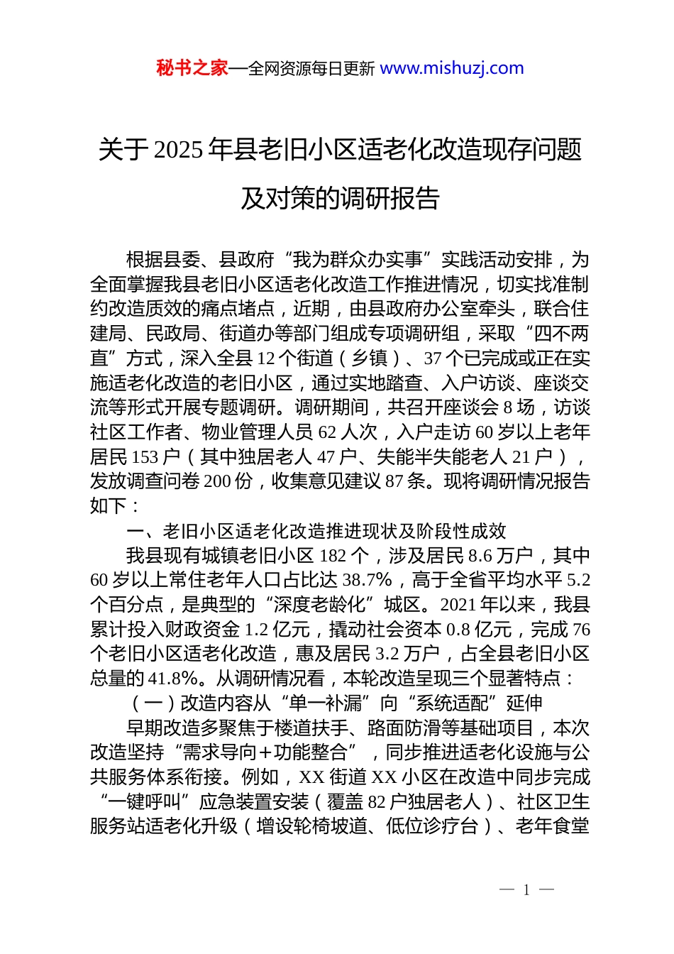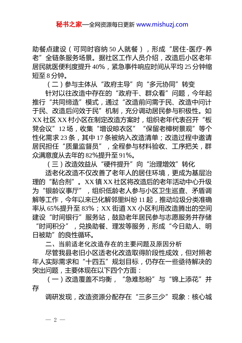 秘书之家—全网资源每日更新 www.mishuzj.com关于 2025 年县老旧小区适老化改造现存问题及对策的调研报告根据县委、县政府“我为群众办实事”实践活动安排,为全面掌握我县老旧小区适老化改造工作推进情况,切实找准制约改造质效的痛点堵点,近期,由县政府办公室牵头,联合住建局、民政局、街道办等部门组成专项调研组,采取“四不两直”方式,深入全县 12 个街道(乡镇)、37 个已完成或正在实施适老化改造的老旧小区,通过实地踏查、入户访谈、座谈交流等形式开展专题调研。调研期间,共召开座谈会 8 场,访谈社区工作者、物业管理人员 62 人次,入户走访 60 岁以上老年居民 153 户(其中独居老人 47 户、失能半失能老人 21 户),发放调查问卷 200 份,收集意见建议 87 条。现将调研情况报告如下:一、老旧小区适老化改造推进现状及阶段性成效我县现有城镇老旧小区 182 个,涉及居民 8.6 万户,其中60 岁以上常住老年人口占比达 38.7%,高于全省平均水平 5.2个百分点,是典型的“深度老龄化”城区。2021 年以来,我县累计投入财政资金 1.2 亿元,撬动社会资本 0.8 亿元,完成 76个老旧小区适老化改造,惠及居民 3.2 万户,占全县老旧小区总量的 41.8%。从调研情况看,本轮改造呈现三个显著特点:(一)改造内容从“单一补漏”向“系统适配”延伸早期改造多聚焦于楼道扶手、路面防滑等基础项目,本次改造坚持“需求导向+功能整合”,同步推进适老化设施与公共服务体系衔接。例如,XX 街道 XX 小区在改造中同步完成“一键呼叫”应急装置安装(覆盖 82 户独居老人)、社区卫生服务站适老化升级(增设轮椅坡道、低位诊疗台)、老年食堂— 1 —秘书之家—全网资源每日更新 www.mishuzj.com助餐点建设(可同时容纳 50 人就餐),形成“居住-医疗-养老”全链条服务场景。据社区工作人员介绍,改造后小区老年居民就医便利度提升 40%,紧急事件响应时间从平均 25 分钟缩短至 8 分钟。(二)参与主体从“政府主导”向“多元协同”转变针对以往改造中存在的“政府干、群众看”问题,今年起推行“共同缔造”模式,通过“改造前问需于民、改造中问计于民、改造后问效于民”机制,充分调动居民参与积极性。如XX 社区 XX 村小区在制定改造方案时,组织老年代表召开“板凳会议”12 场,收集“增设晾衣区”“保留老樟树景观”等个性化需求 23 条,其中 17 条被纳入改造清单;改造过程中邀请居民担任“质量监督员”,全程参与材料验收、工序把关,群众满意度从去年的 82%提升至 91%。(三)改造效益从“硬件提升”向“治理增效”转化适老化改造不仅改善了老年人的居住环境,更成为基层治理的“黏合剂”。XX 镇 XX 社区将改造后的老年活动中心升级为“银龄议事厅”,组织低龄老人参与小区卫生巡查、矛盾调解等工作,今年以来已化解邻里纠纷 11 起,推动垃圾分类准确率从 65%提升至 83%;XX 街道 XX 小区利用改造腾出的空间建设“时间银行”服务站,鼓励老年居民参与志愿服务并存储“时间积分”,兑换助餐、理发等服务,形成“今日助人、明日被助”的良性循环。二、当前适老化改造存在的主要问题及原因分析尽管我县老旧小区适老化改造取得阶段性成效,但对照老年人实际需求和“十四五”规划目标,仍存在一些亟待解决的突出问题,主要体现在以下四个方面:(一)改造覆盖不均衡,“急难愁盼”与“锦上添花”并存调研发现,改造资源分配存在“三多三少”现象:核心城— 2 —秘书之家—全网资源每日更新 www.mishuzj.com区小区改造多、城乡结合部小区改造少(12 个街道中,老城区7 个街道改造覆盖率达 52%,而城郊 3 个街道仅 28%);房龄长、设施差的小区改造多、房龄较短但存在局部短板的小区改造少(37 个改造小区中,房龄超 30 年的占 68%,房龄 20-30 年的仅占 12%);基础类改造(如路面防滑、扶手安装)推进快、提升类改造(如智能监测、适老化文体设施)落地慢(调查问卷显示,73%的老年居民认为“智能养老设备缺失”是最大遗憾)。某社区干部坦言:“不是不想改,主要是上级资金按‘户数’‘面积...
