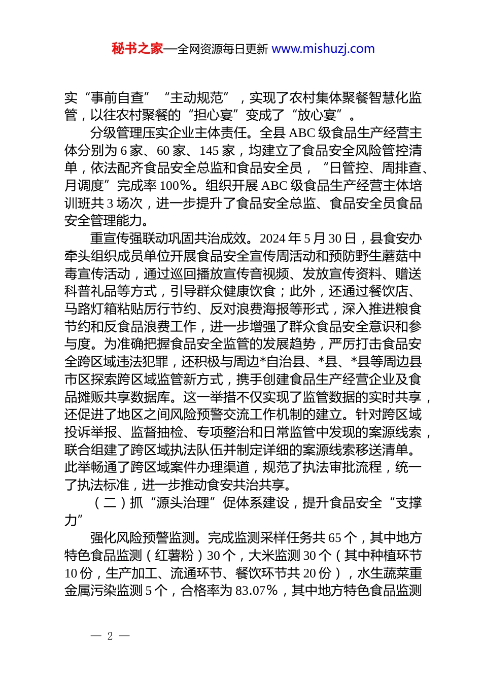 秘书之家—全网资源每日更新 www.mishuzj.com自治县食品安全工作调研报告根据县人大常委会 2025 年“一要点六计划”安排,县人大社会建设委在分管领导的带领下,对全县食品安全工作情况进行了调研。调研组重点听取了县市监局、县农业农村局、县卫健局等食品安全工作情况介绍,同时通过召开座谈会,走访人大代表、食品安全监管单位、相关企业、学校食堂、超市等形式,征求多方意见和建议。现将有关情况报告如下:一、工作开展情况近年来,*坚持“五抓五促五提升”,抓重点、攻难点、创亮点,不断提高食品安全治理能力和保障水平,严防严管严控食品安全风险,防范食用野生蘑菇中毒工作继续保持“双降归零”(中毒件数、中毒人数双下降,中毒死亡人数归零)目标,未发生一起食品安全事故,食品安全形势稳中向好。(一)抓“统筹部署”促责任落实,提升食品安全“引领力”高位推动压实属地管理责任。聚焦“党政同责”关键核心逐级压实工作责任。县政府把食品安全工作纳入重要议事日程和年度重点工作安排,县政府常务会议专题研究食品安全工作。县长带头落实食品安全第一责任人责任,深入一线检查调研督导食品安全工作,推动解决食品安全监管的难点问题 6 个。县食药安办通过开展乡镇食品安全工作督查、组织召开食品安全领域风险隐患会商会、调度会等,着力解决校园食品安全、农村集体聚餐及野生蘑菇中毒防控等食品安全突出问题,推动形成了一级带一级、层层抓落实的工作格局。积极探索“互联网+”,通过“建立一套机制、建成一个平台、建好一个标准”,对全县 200 名乡厨团队人员、320 名村(社区)食品安全协管员、16 名乡镇食安办人员的信息进行了登记备案,倒逼乡厨严格落— 1 —秘书之家—全网资源每日更新 www.mishuzj.com实“事前自查”“主动规范”,实现了农村集体聚餐智慧化监管,以往农村聚餐的“担心宴”变成了“放心宴”。分级管理压实企业主体责任。全县 ABC 级食品生产经营主体分别为 6 家、60 家、145 家,均建立了食品安全风险管控清单,依法配齐食品安全总监和食品安全员,“日管控、周排查、月调度”完成率 100%。组织开展 ABC 级食品生产经营主体培训班共 3 场次,进一步提升了食品安全总监、食品安全员食品安全管理能力。重宣传强联动巩固共治成效。2024 年 5 月 30 日,县食安办牵头组织成员单位开展食品安全宣传周活动和预防野生蘑菇中毒宣传活动,通过巡回播放宣传音视频、发放宣传资料、赠送科普礼品等方式,引导群众健康饮食;此外,还通过餐饮店、马路灯箱粘贴厉行节约、反对浪费海报等形式,深入推进粮食节约和反食品浪费工作,进一步增强了群众食品安全意识和参与度。为准确把握食品安全监管的发展趋势,严厉打击食品安全跨区域违法犯罪,还积极与周边*自治县、*县、*县等周边县市区探索跨区域监管新方式,携手创建食品生产经营企业及食品摊贩共享数据库。这一举措不仅实现了监管数据的实时共享,还促进了地区之间风险预警交流工作机制的建立。针对跨区域投诉举报、监督抽检、专项整治和日常监管中发现的案源线索,联合组建了跨区域执法队伍并制定详细的案源线索移送清单。此举畅通了跨区域案件办理渠道,规范了执法审批流程,统一了执法标准,进一步推动食安共治共享。(二)抓“源头治理”促体系建设,提升食品安全“支撑力”强化风险预警监测。完成监测采样任务共 65 个,其中地方特色食品监测(红薯粉)30 个,大米监测 30 个(其中种植环节10 份,生产加工、流通环节、餐饮环节共 20 份),水生蔬菜重金属污染监测 5 个,合格率为 83.07%,其中地方特色食品监测— 2 —秘书之家—全网资源每日更新 www.mishuzj.com(红薯粉)不合格样品 11 个,相关监测信息已通报相关单位。2024 年评价工作共发放调查问卷 48 份,召开座谈会及现场调查1 场次。共收集有效调查问卷 3 份,收到常态评价合理建议 1 条,专项评价意见建议 2 条,并均上报到“食品安全国家标准跟踪评价及意见反馈平台”。健全粮油标准体系。通过粮食科技宣传周和粮食安全宣传周活动,对粮食质量安全标准和粮油健康消费知识进行...