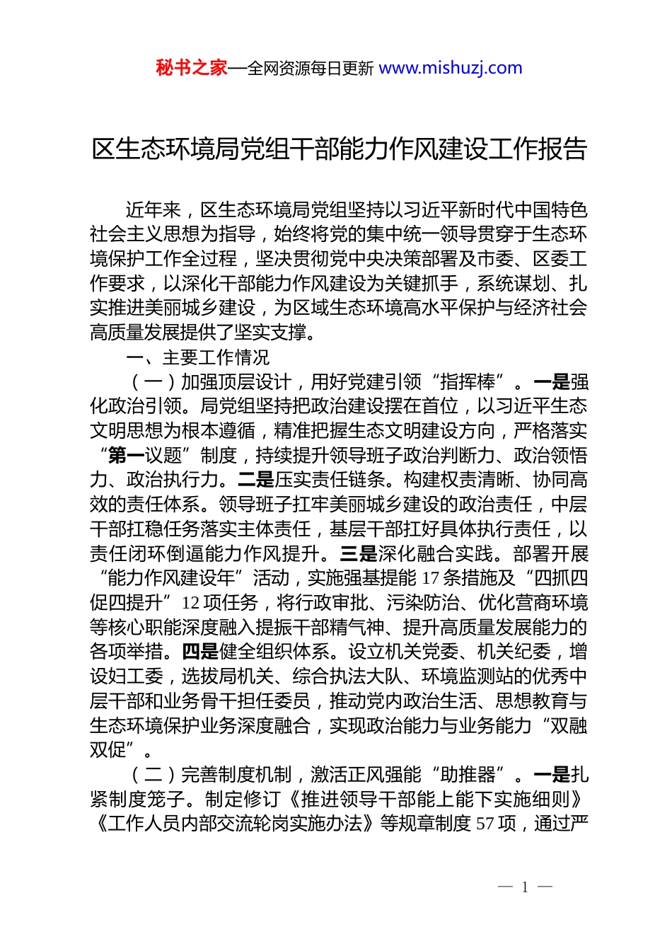 秘书之家—全网资源每日更新 www.mishuzj.com区生态环境局党组干部能力作风建设工作报告近年来,区生态环境局党组坚持以习近平新时代中国特色社会主义思想为指导,始终将党的集中统一领导贯穿于生态环境保护工作全过程,坚决贯彻党中央决策部署及市委、区委工作要求,以深化干部能力作风建设为关键抓手,系统谋划、扎实推进美丽城乡建设,为区域生态环境高水平保护与经济社会高质量发展提供了坚实支撑。一、主要工作情况(一)加强顶层设计,用好党建引领“指挥棒”。一是强化政治引领。局党组坚持把政治建设摆在首位,以习近平生态文明思想为根本遵循,精准把握生态文明建设方向,严格落实“第一议题”制度,持续提升领导班子政治判断力、政治领悟力、政治执行力。二是压实责任链条。构建权责清晰、协同高效的责任体系。领导班子扛牢美丽城乡建设的政治责任,中层干部扛稳任务落实主体责任,基层干部扛好具体执行责任,以责任闭环倒逼能力作风提升。三是深化融合实践。部署开展“能力作风建设年”活动,实施强基提能 17 条措施及“四抓四促四提升”12 项任务,将行政审批、污染防治、优化营商环境等核心职能深度融入提振干部精气神、提升高质量发展能力的各项举措。四是健全组织体系。设立机关党委、机关纪委,增设妇工委,选拔局机关、综合执法大队、环境监测站的优秀中层干部和业务骨干担任委员,推动党内政治生活、思想教育与生态环境保护业务深度融合,实现政治能力与业务能力“双融双促”。(二)完善制度机制,激活正风强能“助推器”。一是扎紧制度笼子。制定修订《推进领导干部能上能下实施细则》《工作人员内部交流轮岗实施办法》等规章制度 57 项,通过严— 1 —秘书之家—全网资源每日更新 www.mishuzj.com抓制度执行,规范干部言行,激发干事热情,提升队伍素质,保障生态环保政策精准落地。二是发挥中坚作用。实行中层干部月度例会制度,强化其承上启下、联动内外、整合资源的关键作用,推动中层干部在常态化理论学习和业务研讨中提升能力、落实责任,达成“强中层、带队伍、激活力”目标。三是鲜明考核导向。严格实施考核制度,细化季度考核指标,优化考核权重比例,旗帜鲜明地为实干者撑腰、为担当者鼓劲,营造务实高效、奋发有为的工作氛围。(三)抓好作风建设,筑牢拒腐防变“高压线”。一是践行群众路线。主动靠前服务,针对科技园区企业关切的项目准入、环评审批等事项,深入园区企业开展“送政策、送法律、送培训”活动,2024 年累计普法宣传、帮扶指导单位超千家,切实解决发展难题。二是优化营商环境。探索推行“微改革”“微创新”等惠企利民举措,提升市场主体和人民群众满意度、获得感。制定《构建亲清新型政商关系实施办法》,明确 14 项政商交往正负面清单,为干部与企业交往划清界限、提供遵循。三是强化监督执纪。构建“机关纪委—各科室—各队、站”三级监督链条。机关纪委严格履行监督执纪职责,落实党纪党规要求及企业回访检查制度。对执行不力、违规违纪行为及时警告、通报、督促整改;对苗头性问题抓早抓小、教育纠正,严把干部廉洁自律关口。(四)拓宽实践渠道,打好能力提升“组合拳”。一是实战锤炼本领。将污染防治攻坚、绿色低碳转型、“接诉即办”等重大任务作为提升能力的实战平台,坚持学干结合、边干边提升。2024 年通过急难险重任务选拔任用 11 名党员干部至关键岗位,形成能力提升与岗位锻炼的良性循环。二是专业赋能强基。针对生态环境工作政策、专业性强特点,连续五年系统开展生态环境法律法规培训、环评审批实战实训、环境监测技术比武等 16 项重点领域岗位建功活动,为干部职工搭建展示才华、— 2 —秘书之家—全网资源每日更新 www.mishuzj.com比拼技艺的广阔舞台。三是协同联动增效。落实“围着基层转”“大家商量着办”机制,在处理污染防治、低碳转型、噪声油烟等“接诉即办”案件时,协同区职能部门、街镇、社会组织和群众力量共商共治,提出务实解决方案。“接诉即办”解决率与满意率连续两年位居全市同行业首位。(五)建强干部队伍,深耕人才培养“试验田”。一是培育青年力量。加强年轻干部教...