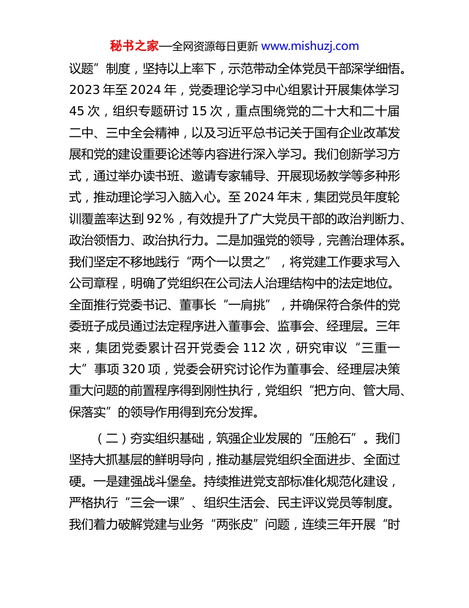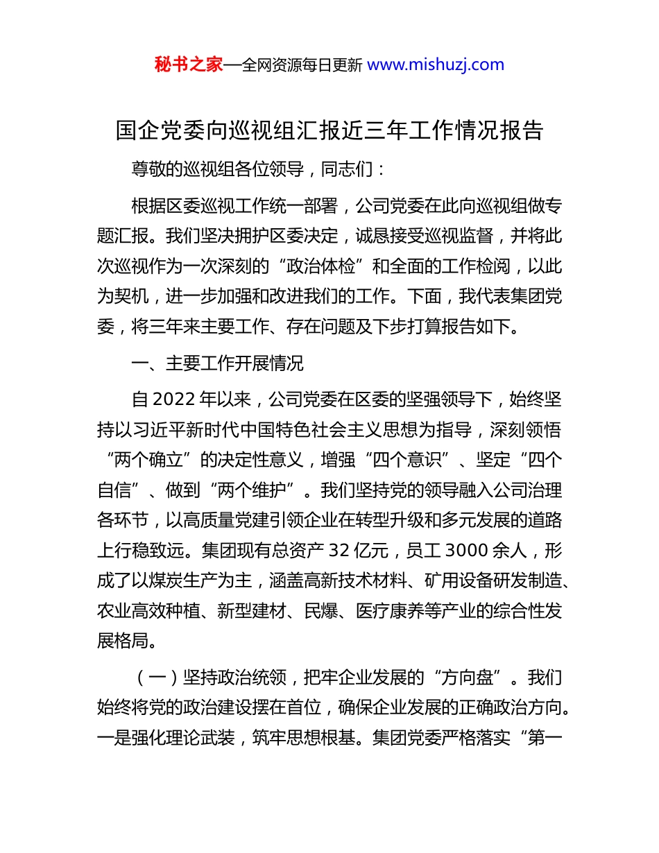 秘书之家—全网资源每日更新 www.mishuzj.com国企党委向巡视组汇报近三年工作情况报告尊敬的巡视组各位领导,同志们:根据区委巡视工作统一部署,公司党委在此向巡视组做专题汇报。我们坚决拥护区委决定,诚恳接受巡视监督,并将此次巡视作为一次深刻的“政治体检”和全面的工作检阅,以此为契机,进一步加强和改进我们的工作。下面,我代表集团党委,将三年来主要工作、存在问题及下步打算报告如下。一、主要工作开展情况自 2022 年以来,公司党委在区委的坚强领导下,始终坚持以习近平新时代中国特色社会主义思想为指导,深刻领悟“两个确立”的决定性意义,增强“四个意识”、坚定“四个自信”、做到“两个维护”。我们坚持党的领导融入公司治理各环节,以高质量党建引领企业在转型升级和多元发展的道路上行稳致远。集团现有总资产 32 亿元,员工 3000 余人,形成了以煤炭生产为主,涵盖高新技术材料、矿用设备研发制造、农业高效种植、新型建材、民爆、医疗康养等产业的综合性发展格局。(一)坚持政治统领,把牢企业发展的“方向盘”。我们始终将党的政治建设摆在首位,确保企业发展的正确政治方向。一是强化理论武装,筑牢思想根基。集团党委严格落实“第一秘书之家—全网资源每日更新 www.mishuzj.com议题”制度,坚持以上率下,示范带动全体党员干部深学细悟。2023 年至 2024 年,党委理论学习中心组累计开展集体学习45 次,组织专题研讨 15 次,重点围绕党的二十大和二十届二中、三中全会精神,以及习近平总书记关于国有企业改革发展和党的建设重要论述等内容进行深入学习。我们创新学习方式,通过举办读书班、邀请专家辅导、开展现场教学等多种形式,推动理论学习入脑入心。至 2024 年末,集团党员年度轮训覆盖率达到 92%,有效提升了广大党员干部的政治判断力、政治领悟力、政治执行力。二是加强党的领导,完善治理体系。我们坚定不移地践行“两个一以贯之”,将党建工作要求写入公司章程,明确了党组织在公司法人治理结构中的法定地位。全面推行党委书记、董事长“一肩挑”,并确保符合条件的党委班子成员通过法定程序进入董事会、监事会、经理层。三年来,集团党委累计召开党委会 112 次,研究审议“三重一大”事项 320 项,党委会研究讨论作为董事会、经理层决策重大问题的前置程序得到刚性执行,党组织“把方向、管大局、保落实”的领导作用得到充分发挥。(二)夯实组织基础,筑强企业发展的“压舱石”。我们坚持大抓基层的鲜明导向,推动基层党组织全面进步、全面过硬。一是建强战斗堡垒。持续推进党支部标准化规范化建设,严格执行“三会一课”、组织生活会、民主评议党员等制度。我们着力破解党建与业务“两张皮”问题,连续三年开展“时秘书之家—全网资源每日更新 www.mishuzj.com代先锋”党员攻坚项目大赛,设立“党员责任区”120 个,“党员先锋岗”285 个。在 XX 煤矿智能化工作面建设、新材料公司技术攻关等急难险重任务中,党员干部冲锋在前,先后有 15 个基层党组织、150 余名党员因此受到集团及以上表彰,党组织的战斗堡垒作用和党员的先锋模范作用在生产经营一线熠熠生辉。二是锻造过硬队伍。坚持党管干部、党管人才原则,树立重实干、重实绩、重担当的选人用人导向。近三年来,我们选拔任用中层干部 58 人,其中 70%以上来自生产一线和关键技术岗位。同时,加大年轻干部培养力度,建立后备干部库,对 35 名优秀年轻干部实行“导师制”培养,为企业长远发展储备了有生力量。(三)深化正风肃纪,筑牢企业发展的“防火墙”。我们坚定不移推进全面从严治党,持续营造风清气正的政治生态。一是压实“两个责任”。集团党委切实担负起主体责任,每年至少两次专题研究党风廉政建设工作,制定年度责任清单,层层传导压力。集团纪委聚焦主责主业,履行监督责任,运用“四种形态”处理 68 人次,其中第一、第二种形态占比超过95%,做到了抓早抓小、防微杜渐。二是深化廉洁教育。我们坚持教育在先、预防为主,组织关键岗位人员、新提任干部等到我区廉政教育基地接受警示教育 20 余场次,观看警示教育片 30 余部。组...