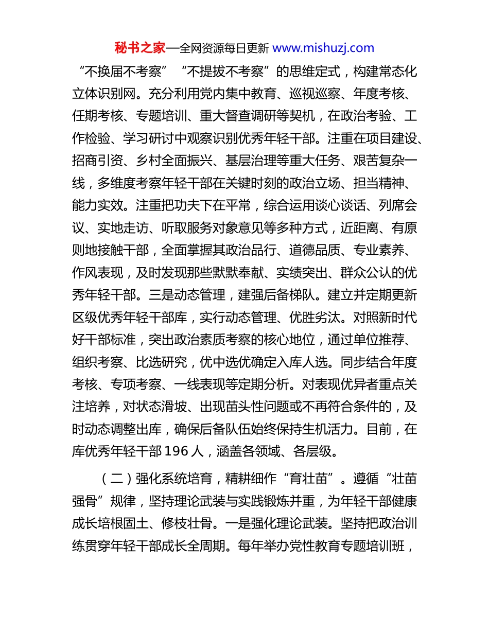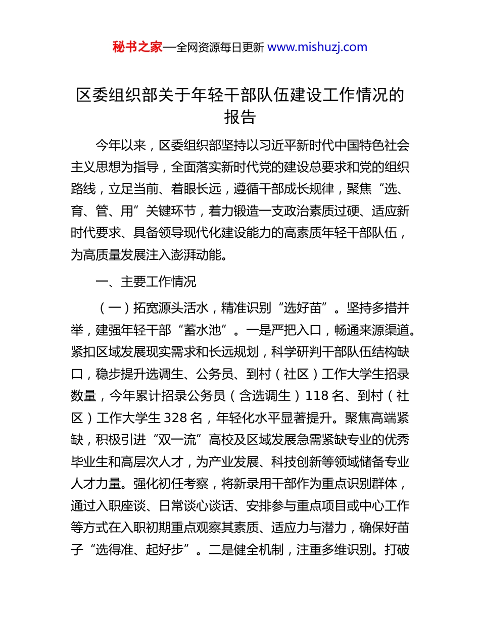 秘书之家—全网资源每日更新 www.mishuzj.com区委组织部关于年轻干部队伍建设工作情况的报告今年以来,区委组织部坚持以习近平新时代中国特色社会主义思想为指导,全面落实新时代党的建设总要求和党的组织路线,立足当前、着眼长远,遵循干部成长规律,聚焦“选、育、管、用”关键环节,着力锻造一支政治素质过硬、适应新时代要求、具备领导现代化建设能力的高素质年轻干部队伍,为高质量发展注入澎湃动能。一、主要工作情况(一)拓宽源头活水,精准识别“选好苗”。坚持多措并举,建强年轻干部“蓄水池”。一是严把入口,畅通来源渠道。紧扣区域发展现实需求和长远规划,科学研判干部队伍结构缺口,稳步提升选调生、公务员、到村(社区)工作大学生招录数量,今年累计招录公务员(含选调生)118 名、到村(社区)工作大学生 328 名,年轻化水平显著提升。聚焦高端紧缺,积极引进“双一流”高校及区域发展急需紧缺专业的优秀毕业生和高层次人才,为产业发展、科技创新等领域储备专业人才力量。强化初任考察,将新录用干部作为重点识别群体,通过入职座谈、日常谈心谈话、安排参与重点项目或中心工作等方式在入职初期重点观察其素质、适应力与潜力,确保好苗子“选得准、起好步”。二是健全机制,注重多维识别。打破秘书之家—全网资源每日更新 www.mishuzj.com“不换届不考察”“不提拔不考察”的思维定式,构建常态化立体识别网。充分利用党内集中教育、巡视巡察、年度考核、任期考核、专题培训、重大督查调研等契机,在政治考验、工作检验、学习研讨中观察识别优秀年轻干部。注重在项目建设、招商引资、乡村全面振兴、基层治理等重大任务、艰苦复杂一线,多维度考察年轻干部在关键时刻的政治立场、担当精神、能力实效。注重把功夫下在平常,综合运用谈心谈话、列席会议、实地走访、听取服务对象意见等多种方式,近距离、有原则地接触干部,全面掌握其政治品行、道德品质、专业素养、作风表现,及时发现那些默默奉献、实绩突出、群众公认的优秀年轻干部。三是动态管理,建强后备梯队。建立并定期更新区级优秀年轻干部库,实行动态管理、优胜劣汰。对照新时代好干部标准,突出政治素质考察的核心地位,通过单位推荐、组织考察、比选研究,优中选优确定入库人选。同步结合年度考核、专项考察、一线表现等定期分析。对表现优异者重点关注培养,对状态滑坡、出现苗头性问题或不再符合条件的,及时动态调整出库,确保后备队伍始终保持生机活力。目前,在库优秀年轻干部 196 人,涵盖各领域、各层级。(二)强化系统培育,精耕细作“育壮苗”。遵循“壮苗强骨”规律,坚持理论武装与实践锻炼并重,为年轻干部健康成长培根固土、修枝壮骨。一是强化理论武装。坚持把政治训练贯穿年轻干部成长全周期。每年举办党性教育专题培训班,秘书之家—全网资源每日更新 www.mishuzj.com确保区管优秀年轻干部每 3 年至少参加一次为期不少于一周的脱产政治训练。已连续十年举办优秀中青年干部培训班(每年 1 期,每期 30 天),累计从全区精选 500 余名优秀学员进行全脱产、封闭式培训。二是做实跟踪管理。根据年轻干部特点、潜力及发展需求,“一人一策”个性化明确阶段管理目标与路径。通过谈心谈话、工作汇报、导师反馈等,实时掌握其在思想动态、理论学习、德才表现、实践成效、廉洁自律等方面的情况,并将跟踪结果作为培养使用、评优评先、教育资源配置的重要依据。三是深化实践磨炼。坚持把实践作为最好课堂、最厚沃土。有计划地将年轻干部放到基层一线、重大任务、重点工作和关键岗位经受锻炼,让其在直面群众、解决具体问题中锤炼党性、增长才干。遵循干部成长规律,对扎实历练、表现突出、潜力大的干部,及时放到更高更关键岗位进行交流、压担考验。(三)坚持严管厚爱,悉心护航“管护苗”。坚持严管和厚爱结合、激励和约束并重,加强全方位管理和经常性监督,帮助年轻干部扣好廉洁从政的“第一粒扣子”,护航健康成长、行稳致远。一是固本培元,健全制度体系。立足区域实际,系统构建年轻干部培养管理使用制度体系。出台并严格执行《选调生培养管理使用实施办法(试行)...