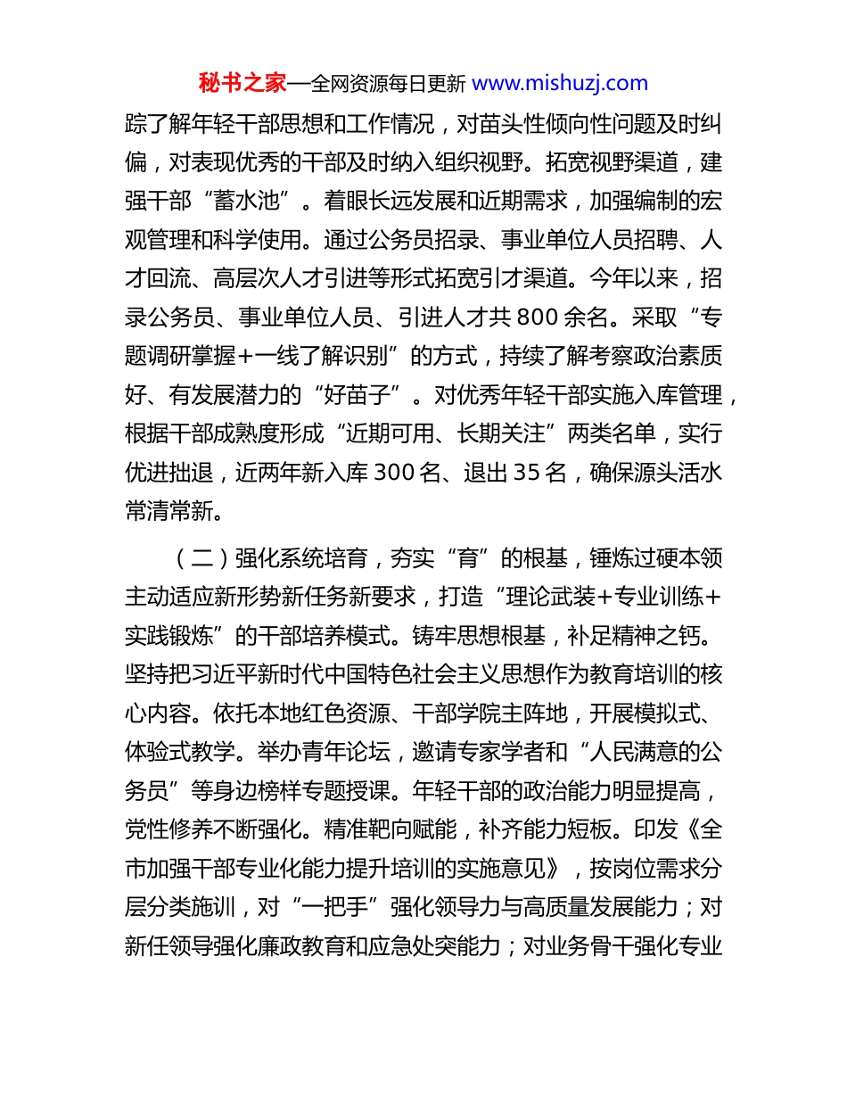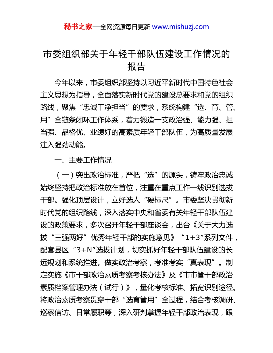 秘书之家—全网资源每日更新 www.mishuzj.com市委组织部关于年轻干部队伍建设工作情况的报告今年以来,市委组织部坚持以习近平新时代中国特色社会主义思想为指导,全面落实新时代党的建设总要求和党的组织路线,聚焦“忠诚干净担当”的要求,系统构建“选、育、管、用”全链条闭环工作体系,着力锻造一支政治强、能力强、担当强、品格优、业绩好的高素质年轻干部队伍,为高质量发展注入强劲动能。一、主要工作情况(一)突出政治标准,严把“选”的源头,铸牢政治忠诚始终坚持把政治标准放在首位,注重在重点工作一线识别选拔干部。强化顶层设计,立好选人“硬标尺”。市委坚决贯彻新时代党的组织路线,深入落实中央和省委有关年轻干部队伍建设的政策要求,多次召开年轻干部座谈会,出台《关于大力选拔“三强两好”优秀年轻干部的实施意见》“1+3”系列文件,配套县区“3+N”选拔计划,切实抓好年轻干部队伍建设的长远规划和系统推进。做实政治考察,考准考实“真表现”。制定实施《市干部政治素质考察考核办法》及《市市管干部政治素质档案管理办法(试行)》,量化考核标准、拓宽识别途径。将政治素质考察贯穿干部“选育管用”全过程,结合考核调研、巡察信访、日常履职等,深入研判掌握年轻干部政治表现,跟秘书之家—全网资源每日更新 www.mishuzj.com踪了解年轻干部思想和工作情况,对苗头性倾向性问题及时纠偏,对表现优秀的干部及时纳入组织视野。拓宽视野渠道,建强干部“蓄水池”。着眼长远发展和近期需求,加强编制的宏观管理和科学使用。通过公务员招录、事业单位人员招聘、人才回流、高层次人才引进等形式拓宽引才渠道。今年以来,招录公务员、事业单位人员、引进人才共 800 余名。采取“专题调研掌握+一线了解识别”的方式,持续了解考察政治素质好、有发展潜力的“好苗子”。对优秀年轻干部实施入库管理,根据干部成熟度形成“近期可用、长期关注”两类名单,实行优进拙退,近两年新入库 300 名、退出 35 名,确保源头活水常清常新。(二)强化系统培育,夯实“育”的根基,锤炼过硬本领主动适应新形势新任务新要求,打造“理论武装+专业训练+实践锻炼”的干部培养模式。铸牢思想根基,补足精神之钙。坚持把习近平新时代中国特色社会主义思想作为教育培训的核心内容。依托本地红色资源、干部学院主阵地,开展模拟式、体验式教学。举办青年论坛,邀请专家学者和“人民满意的公务员”等身边榜样专题授课。年轻干部的政治能力明显提高,党性修养不断强化。精准靶向赋能,补齐能力短板。印发《全市加强干部专业化能力提升培训的实施意见》,按岗位需求分层分类施训,对“一把手”强化领导力与高质量发展能力;对新任领导强化廉政教育和应急处突能力;对业务骨干强化专业秘书之家—全网资源每日更新 www.mishuzj.com更新与技能提升。2021 年以来,聚焦“双碳”、新质生产力、算账能力等主题举办专题培训,有效提升年轻干部政策执行、风险驾驭、服务群众能力。强化实践锻炼,壮实担当筋骨。紧紧围绕高质量发展需要,制定《市常态化实践锻炼办法》,搭建四类干部成长锻炼平台,即选派干部“上派”省级部门跟班学习、“下沉”县乡任职锻炼、“外联”先发地区取经、“练兵”信访巡察、乡村全面振兴、项目攻坚等一线,积极拓宽年轻干部实践锻炼渠道。今年以来,累计选派 300 余名年轻干部在吃劲岗位经风雨、见世面、长才干,有效解放思想、积累经验、提升能力。(三)坚持严管厚爱,压实“管”的责任,涵养清风正气将从严管理监督与激励担当作为统一起来,激发干部干事创业内生动力。抓常抓细抓长,织密监督防护网。坚持严管就是厚爱,研究制定《关于进一步完善干部监督工作联席会议制度和信息沟通办法的实施意见》,紧盯“八小时内外”,综合运用纪检监察、巡察、信访等途径,及时提醒函询诫勉。定期开展“一报告两评议”,对认可度低的干部进行选任过程倒查分析。开展系列活动,引导年轻干部知敬畏、存戒惧、守底线,涵养高尚道德情操,树立正确价值导向。精准激励约束,激发干事内驱力。坚持考事考人与选人用人结合,差异化设置考核指标,畅通能上能下渠道。对...