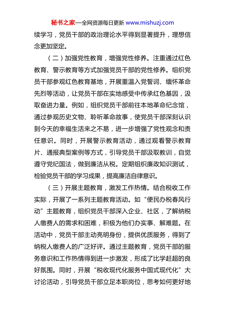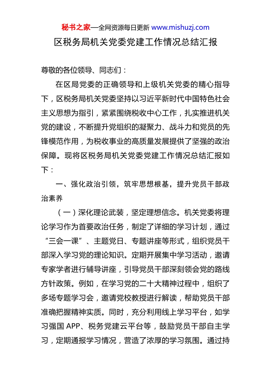 秘书之家—全网资源每日更新 www.mishuzj.com区税务局机关党委党建工作情况总结汇报 尊敬的各位领导、同志们:在区局党委的正确领导和上级机关党委的精心指导下,区税务局机关党委坚持以习近平新时代中国特色社会主义思想为指引,紧紧围绕税收中心工作,扎实推进机关党的建设,不断提升党组织的凝聚力、战斗力和党员的先锋模范作用,为税收事业的高质量发展提供了坚强的政治保障。现将区税务局机关党委党建工作情况总结汇报如下:一、强化政治引领,筑牢思想根基,提升党员干部政治素养(一)深化理论武装,坚定理想信念。机关党委将理论学习作为首要政治任务,制定了详细的学习计划,通过“三会一课”、主题党日、专题讲座等形式,组织党员干部深入学习党的理论知识。定期开展集中学习活动,邀请专家学者进行辅导讲座,引导党员干部深刻领会党的路线方针政策。例如,在学习党的二十大精神过程中,组织了多场专题学习会,邀请党校教授进行解读,帮助党员干部准确把握精神实质。同时,充分利用线上学习平台,如学习强国 APP、税务党建云平台等,鼓励党员干部自主学习,定期通报学习情况,营造了浓厚的学习氛围。通过持秘书之家—全网资源每日更新 www.mishuzj.com续学习,党员干部的政治理论水平得到显著提升,理想信念更加坚定。(二)加强党性教育,增强党性修养。注重通过红色教育、警示教育等方式加强党员干部的党性修养。组织党员干部参观红色教育基地,开展重温入党誓词、缅怀革命先烈等活动,让党员干部在实地感受中传承红色基因,汲取奋进力量。例如,组织党员干部前往本地革命纪念馆,通过参观历史文物、聆听革命故事,使党员干部深刻认识到今天的幸福生活来之不易,进一步增强了党性观念和责任意识。同时,开展警示教育活动,通过观看警示教育片、通报典型案例等方式,引导党员干部汲取教训,自觉遵守党纪国法,做到廉洁从税。定期组织廉政知识测试,检验党员干部的学习成果,提高廉洁自律意识。(三)开展主题教育,激发工作热情。结合税收工作实际,开展了一系列主题教育活动。如“便民办税春风行动”主题教育,组织党员干部深入企业、社区,了解纳税人缴费人的需求和困难,积极为他们办实事、解难题。在活动中,党员干部主动亮明身份,提供优质服务,得到了纳税人缴费人的广泛好评。通过主题教育,党员干部的服务意识和工作热情得到进一步激发,形成了比学赶超的良好氛围。同时,开展“税收现代化服务中国式现代化”大讨论活动,引导党员干部立足本职岗位,思考如何更好地秘书之家—全网资源每日更新 www.mishuzj.com发挥税收职能作用,为地方经济社会发展贡献力量。通过讨论交流,党员干部的思想得到进一步解放,工作思路更加清晰。二、规范组织建设,夯实基层基础,增强党组织凝聚力和战斗力(一)优化党组织设置,健全组织体系。根据税收工作实际和党员分布情况,对党组织设置进行了优化调整。合理设置党支部,确保党组织覆盖到税收工作的各个领域和环节。选优配强党支部书记和支委成员,注重选拔政治素质高、工作能力强、群众威信好的党员干部担任党组织负责人。定期组织党支部书记和支委成员培训,提高他们的业务能力和管理水平。通过优化设置和培训提升,党组织的凝聚力和战斗力得到进一步增强。例如,在纳税服务一线设立党员先锋岗,由党支部书记担任组长,带领党员为纳税人提供优质高效的服务,充分发挥了党组织的战斗堡垒作用。(二)严格组织生活,增强党内政治生活的严肃性。认真落实“三会一课”、民主生活会、组织生活会、民主评议党员等制度,确保党内政治生活正常化、规范化。定期召开支部党员大会、支部委员会和党小组会,开展党课教育,及时传达上级党组织的决策部署,研究解决党内重要问题。在民主生活会和组织生活会上,党员干部认真开秘书之家—全网资源每日更新 www.mishuzj.com展批评与自我批评,查找自身存在的问题和不足,明确整改方向和措施。民主评议党员工作坚持标准、严格程序,确保评议结果客观公正。通过严格组织生活,党员干部的党性观念得到进一步增强,党内政治生活的严肃性得到进一步提升。(三)加强党员管理,激发党员活力...