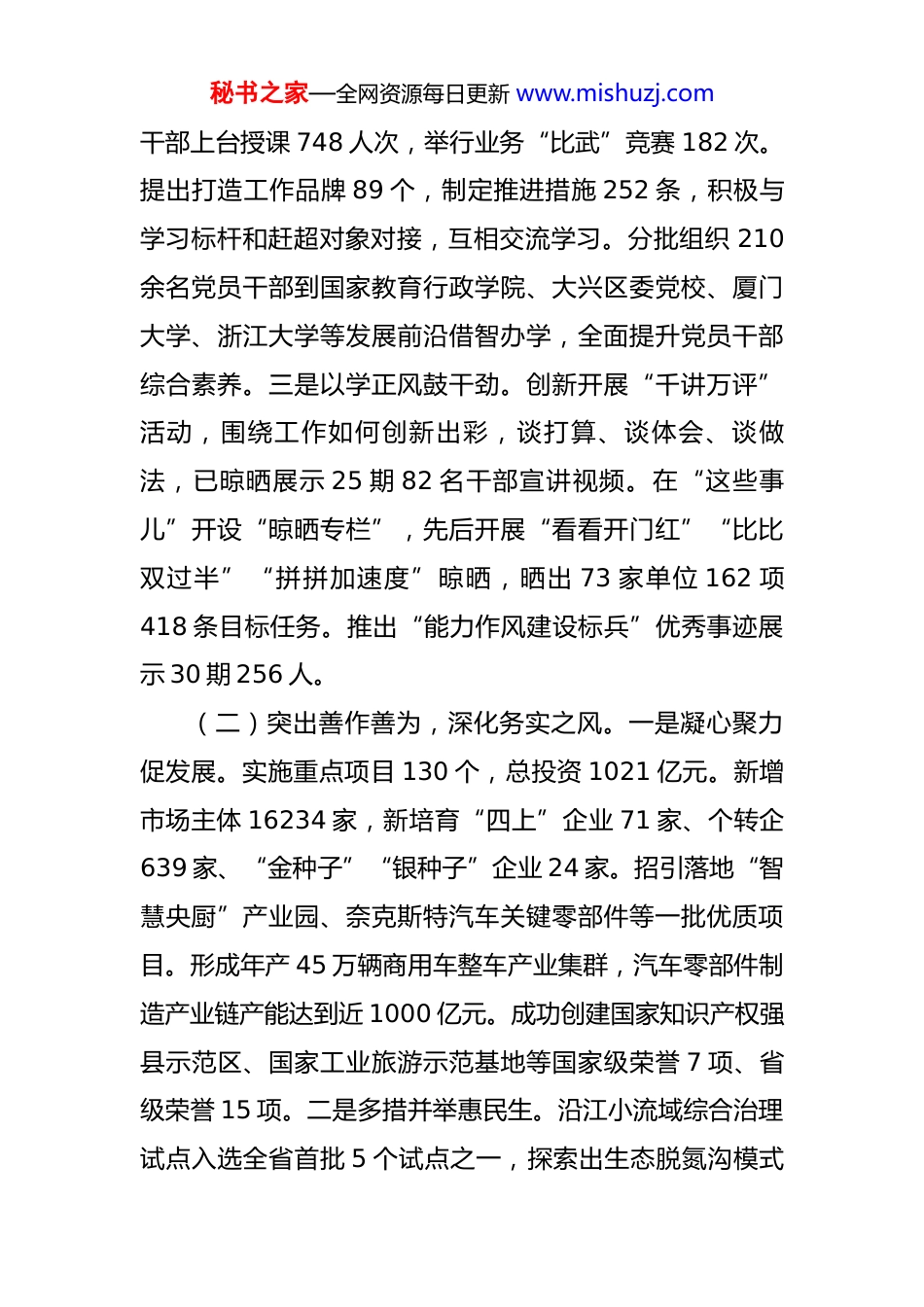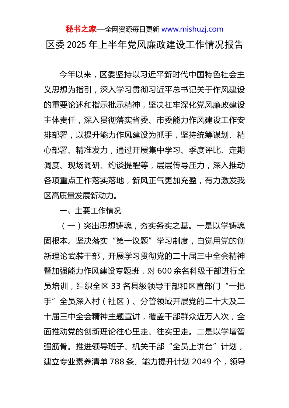 秘书之家—全网资源每日更新 www.mishuzj.com区委 2025 年上半年党风廉政建设工作情况报告 今年以来,区委坚持以习近平新时代中国特色社会主义思想为指引,深入学习贯彻习近平总书记关于作风建设的重要论述和指示批示精神,坚决扛牢深化党风廉政建设主体责任,深入贯彻落实省委、市委能力作风建设工作安排部署,以提升能力作风建设为抓手,坚持统筹谋划、精心部署、精准发力,通过开展集中学习、季度评比、定期调度、现场调研、约谈提醒等,层层传导压力,深入推动各项重点工作落实落地,新风正气更加充盈,有力激发我区高质量发展新动力。一、主要工作情况(一)突出思想铸魂,夯实务实之基。一是以学铸魂固根本。坚决落实“第一议题”学习制度,自觉用党的创新理论武装干部,开展学习贯彻党的二十届三中全会精神暨加强能力作风建设专题班,对 600 余名科级干部进行全员培训,组织全区 33 名县级领导干部和区直部门“一把手”全员深入村(社区)、分管领域开展党的二十大及二十届三中全会精神主题宣讲,覆盖干部群众近万人次,全面推动党的创新理论往心里走、往实里走。二是以学增智强筋骨。推进领导班子、机关干部“全员上讲台”计划,建立专业素养清单 788 条、能力提升计划 2049 个,领导秘书之家—全网资源每日更新 www.mishuzj.com干部上台授课 748 人次,举行业务“比武”竞赛 182 次。提出打造工作品牌 89 个,制定推进措施 252 条,积极与学习标杆和赶超对象对接,互相交流学习。分批组织 210余名党员干部到国家教育行政学院、大兴区委党校、厦门大学、浙江大学等发展前沿借智办学,全面提升党员干部综合素养。三是以学正风鼓干劲。创新开展“千讲万评”活动,围绕工作如何创新出彩,谈打算、谈体会、谈做法,已晾晒展示 25 期 82 名干部宣讲视频。在“这些事儿”开设“晾晒专栏”,先后开展“看看开门红”“比比双过半”“拼拼加速度”晾晒,晒出 73 家单位 162 项418 条目标任务。推出“能力作风建设标兵”优秀事迹展示 30 期 256 人。(二)突出善作善为,深化务实之风。一是凝心聚力促发展。实施重点项目 130 个,总投资 1021 亿元。新增市场主体 16234 家,新培育“四上”企业 71 家、个转企639 家、“金种子”“银种子”企业 24 家。招引落地“智慧央厨”产业园、奈克斯特汽车关键零部件等一批优质项目。形成年产 45 万辆商用车整车产业集群,汽车零部件制造产业链产能达到近 1000 亿元。成功创建国家知识产权强县示范区、国家工业旅游示范基地等国家级荣誉 7 项、省级荣誉 15 项。二是多措并举惠民生。沿江小流域综合治理试点入选全省首批 5 个试点之一,探索出生态脱氮沟模式秘书之家—全网资源每日更新 www.mishuzj.com等十一条技术路径,6 项技术创新受到省委督查室督查激励,其中 5 条经验模式入选全省小流域综合治理操作指引,在全省推广。实施 7 个片区老旧小区改造项目,涉及老旧小区 41 个,居民 9943 户,高标准打造共同缔造省级“样板”——“幸福顾家”片区改造。率先打造 8 处高品质“青年人才驿站”,先后筹建 2623 套约 7 万平方米人才公寓,新增义务教育学位 2900 个,设置 13 处暖心“爱心驿站”,建设并投入使用 9 个幸福食堂,启动“情暖人才”四季沙龙系列活动 5 场次。三是常态督导促提升。组织 7 个督查组对 34 家区直单位不担当不作为问题进行专项监督检查,制发通报 1 期、提醒函 4 份;查处“躺平式干部”问题,追责问责 23 人;共向区直单位党员干部发送廉政短信 2 万余条,通报曝光典型案例 3 期,查处形式主义官僚主义问题 12 件 17 人,享乐主义奢靡之风问题 9 件 11人。联合纪委监委开展交叉检查 2 批次,共发现“四风”问题 45 个。(三)突出鲜明导向,激扬奋进之力。一是抓“关键少数”示范引领。以落实“三重”工作“红黑榜”机制为统领,以项目拉练和能力作风督导为抓手,约谈 14 家季度“黑榜”单位“一把手”,对连续两次入选“黑榜”的单位直接取消年度评先表模资格,对长期名列“黑榜”单位“一把手”启动重...