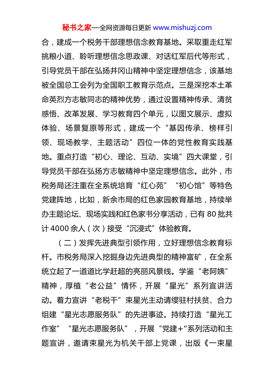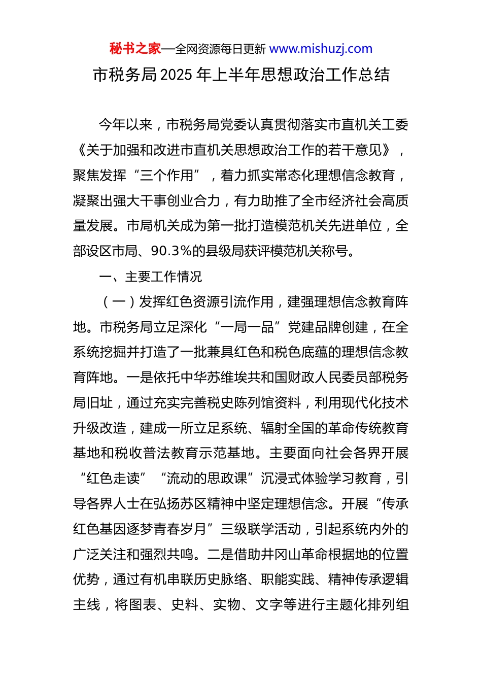 秘书之家—全网资源每日更新 www.mishuzj.com市税务局 2025 年上半年思想政治工作总结 今年以来,市税务局党委认真贯彻落实市直机关工委《关于加强和改进市直机关思想政治工作的若干意见》,聚焦发挥“三个作用”,着力抓实常态化理想信念教育,凝聚出强大干事创业合力,有力助推了全市经济社会高质量发展。市局机关成为第一批打造模范机关先进单位,全部设区市局、90.3%的县级局获评模范机关称号。一、主要工作情况(一)发挥红色资源引流作用,建强理想信念教育阵地。市税务局立足深化“一局一品”党建品牌创建,在全系统挖掘并打造了一批兼具红色和税色底蕴的理想信念教育阵地。一是依托中华苏维埃共和国财政人民委员部税务局旧址,通过充实完善税史陈列馆资料,利用现代化技术升级改造,建成一所立足系统、辐射全国的革命传统教育基地和税收普法教育示范基地。主要面向社会各界开展“红色走读”“流动的思政课”沉浸式体验学习教育,引导各界人士在弘扬苏区精神中坚定理想信念。开展“传承红色基因逐梦青春岁月”三级联学活动,引起系统内外的广泛关注和强烈共鸣。二是借助井冈山革命根据地的位置优势,通过有机串联历史脉络、职能实践、精神传承逻辑主线,将图表、史料、实物、文字等进行主题化排列组秘书之家—全网资源每日更新 www.mishuzj.com合,建成一个税务干部理想信念教育基地。采取重走红军挑粮小道、聆听理想信念思政课、对话红军后代等形式,引导党员干部在弘扬井冈山精神中坚定理想信念,该基地被全国总工会列为全国职工教育示范点。三是深挖本土革命英烈方志敏同志的精神优势,通过设置精神传承、清贫感悟、改革发展、学习教育四个单元,以图文展示、虚拟体验、场景复原等形式,建成一个“基因传承、榜样引领、现场教学、主题活动”四位一体的党性教育实践基地。重点打造“初心、理论、互动、实境”四大课堂,引导党员干部在弘扬方志敏精神中坚定理想信念。此外,市税务局还注重在全系统培育“红心苑”“初心馆”等特色党建阵地,比如,新余市局的红色家园教育基地,持续举办主题论坛、现场实践和红色家书分享活动,已有 80 批共计 4000 余人(次)接受“沉浸式”体验教育。(二)发挥先进典型引领作用,立好理想信念教育标杆。市税务局深入挖掘身边先进典型的精神富矿,在全系统立起了一道道比学赶超的亮丽风景线。学鉴“老阿姨”精神,厚植“老公益”情怀,开展“星光”系列宣讲活动。着力宣讲“老税干”束星光主动请缨驻村扶贫、合力组建“星光志愿服务队”的先进事迹。持续打造“星光工作室”“星光志愿服务队”,开展“党建+”系列活动和主题宣讲,邀请束星光为机关干部上党课,出版《一束星秘书之家—全网资源每日更新 www.mishuzj.com光》图书,通过门户网站、《税务》杂志广泛宣传,引导全市税务人员学习身边好榜样、立足岗位建新功。此外,全市税务系统还大力宣传党的二十大代表、“全国先进工作者”“全国三八红旗手”“全国道德模范提名奖”等信念坚定、忠诚担当、崇法守纪的税务干部,着力推广传承他们“在岗做模范,离岗当火种,播下一团火,散出满天星”的精神品质。(三)发挥党组织引导作用,压紧理想信念教育责任。市税务局坚持压紧三类主体责任,为全系统扎实开展理想信念教育提供了坚强组织保障。一是夯实党委责任。将理想信念教育纳入党的建设和全面从严治党工作总体规划,列为干部教育培训的重点内容。党委每年开展政治机关意识教育,严格落实“第一议题”和理论学习中心组学习制度,党委书记带头领学、带头研讨、带头讲政治机关建设党课,党委委员轮流作主旨发言。建立健全党委联系基层制度,每名班子成员既要联系 1 个县级税务局,还要延伸联系 1 个基层党支部,每年通过听取工作汇报、共过组织生活、帮助解决问题,指导督促基层持续加强理想信念教育,将责任和压力及时传导到“最后一公里”。二是压实基层党组织责任。切实发挥党支部“管到人头”优势,将理想信念教育作为“三会一课”“主题党日”的必修内容。每月围绕集体诵读党章、组织集中学习、开展特秘书之家—全网资源每日更新 www.mishuzj.com色活动、安排警示...