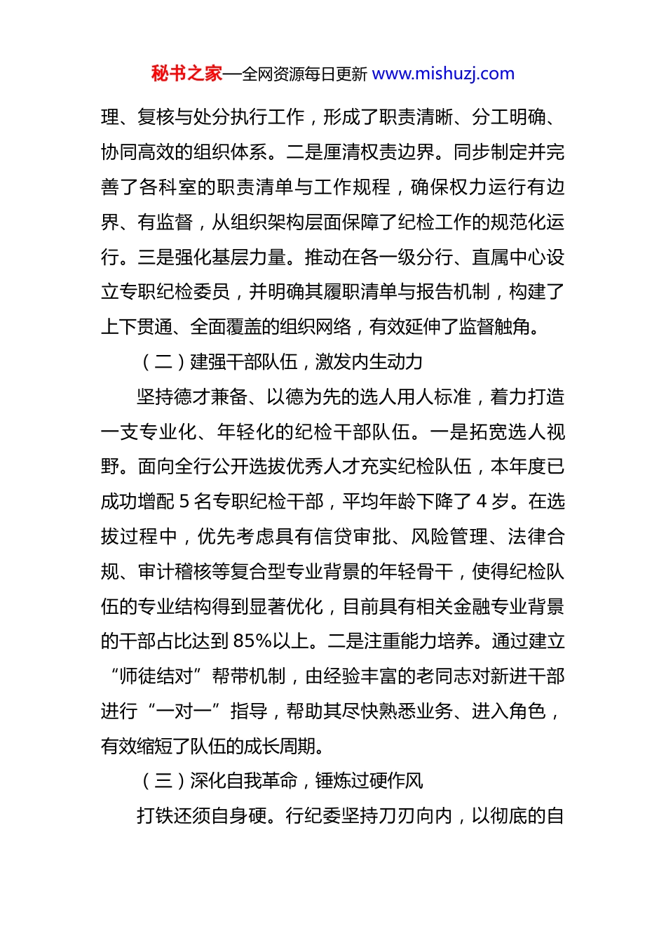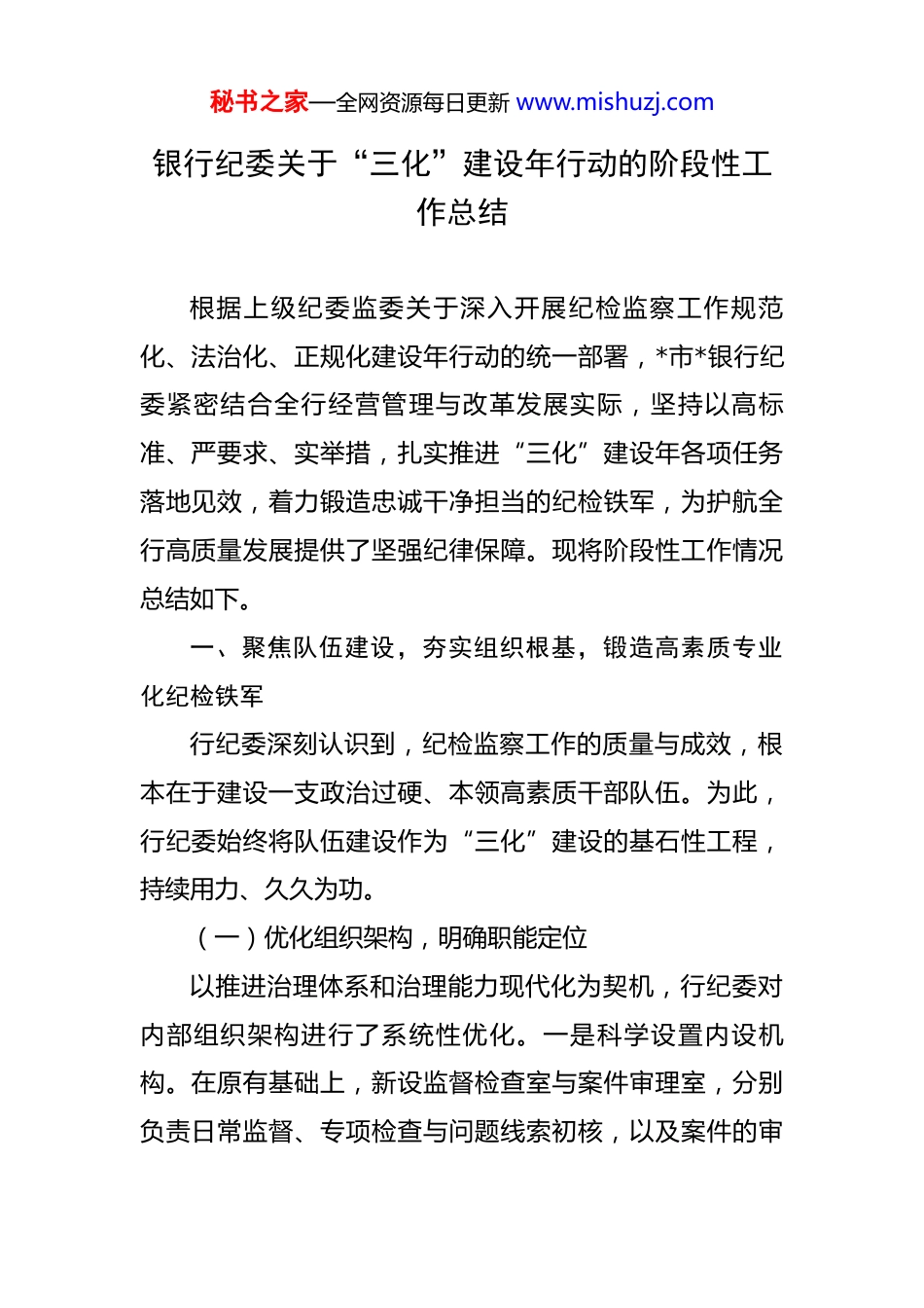 秘书之家—全网资源每日更新 www.mishuzj.com银行纪委关于“三化”建设年行动的阶段性工作总结 根据上级纪委监委关于深入开展纪检监察工作规范化、法治化、正规化建设年行动的统一部署,*市*银行纪委紧密结合全行经营管理与改革发展实际,坚持以高标准、严要求、实举措,扎实推进“三化”建设年各项任务落地见效,着力锻造忠诚干净担当的纪检铁军,为护航全行高质量发展提供了坚强纪律保障。现将阶段性工作情况总结如下。一、聚焦队伍建设,夯实组织根基,锻造高素质专业化纪检铁军行纪委深刻认识到,纪检监察工作的质量与成效,根本在于建设一支政治过硬、本领高素质干部队伍。为此,行纪委始终将队伍建设作为“三化”建设的基石性工程,持续用力、久久为功。(一)优化组织架构,明确职能定位以推进治理体系和治理能力现代化为契机,行纪委对内部组织架构进行了系统性优化。一是科学设置内设机构。在原有基础上,新设监督检查室与案件审理室,分别负责日常监督、专项检查与问题线索初核,以及案件的审秘书之家—全网资源每日更新 www.mishuzj.com理、复核与处分执行工作,形成了职责清晰、分工明确、协同高效的组织体系。二是厘清权责边界。同步制定并完善了各科室的职责清单与工作规程,确保权力运行有边界、有监督,从组织架构层面保障了纪检工作的规范化运行。三是强化基层力量。推动在各一级分行、直属中心设立专职纪检委员,并明确其履职清单与报告机制,构建了上下贯通、全面覆盖的组织网络,有效延伸了监督触角。(二)建强干部队伍,激发内生动力坚持德才兼备、以德为先的选人用人标准,着力打造一支专业化、年轻化的纪检干部队伍。一是拓宽选人视野。面向全行公开选拔优秀人才充实纪检队伍,本年度已成功增配 5 名专职纪检干部,平均年龄下降了 4 岁。在选拔过程中,优先考虑具有信贷审批、风险管理、法律合规、审计稽核等复合型专业背景的年轻骨干,使得纪检队伍的专业结构得到显著优化,目前具有相关金融专业背景的干部占比达到 85%以上。二是注重能力培养。通过建立“师徒结对”帮带机制,由经验丰富的老同志对新进干部进行“一对一”指导,帮助其尽快熟悉业务、进入角色,有效缩短了队伍的成长周期。(三)深化自我革命,锤炼过硬作风打铁还须自身硬。行纪委坚持刀刃向内,以彻底的自秘书之家—全网资源每日更新 www.mishuzj.com我革命精神加强自身建设。一是深入开展专题学习教育。对照上级要求和群众期盼,深入查摆在纪检工作中可能存在的“斗争精神不足、监督本领不强、工作作风不实”等问题。二是严肃开展自查自纠。组织全体纪检干部对照职责使命,重点检视在信贷审批、集中采购等关键领域、重点岗位,以及对党员干部“八小时以外”活动的监督是否存在盲区和短板,形成问题清单并逐项整改,一体推进学习、查摆与改进工作,确保队伍纯洁性和战斗力。二、聚焦教育培训,提升履职能力,打造善于斗争的纪检精兵行纪委将提升履职能力作为“三化”建设的核心任务,通过构建多层次、全覆盖的教育培训体系,全面增强纪检干部的综合素养和实战本领。(一)搭建“互学互鉴”平台,强化理论武装牢固树立终身学习理念,着力打造学习型组织。一是建立常态化集体学习制度。坚持“第一议题”制度,第一时间深入学习领会习近平总书记关于党的自我革命的重要思想,及时传达贯彻中央纪委及上级纪委监委全会精神。年内已组织集中学习 24 次,专题研讨 6 次。二是坚持问题导向按需施教。紧密围绕日常监督执纪工作中的重点难点,秉持“干什么就学什么、缺什么就补什么”的原则,秘书之家—全网资源每日更新 www.mishuzj.com定期组织学习党内法规、金融监管政策和相关法律知识,推动理论学习与业务实践深度融合,有效提升了纪检干部运用法治思维和法治方式解决问题的能力。(二)创新“跟案实训”模式,锤炼实战本领注重在干中学、在战中练,积极探索实战化练兵模式。一是参与上级专案。主动争取机会,选派 2 名年轻纪检骨干全程参与了上级纪委监委组织的重要专案查办工作,使其在复杂案件的突破、证据的固定、笔录的制作等方面得到了系统性锻炼。二是融入内部监督。...