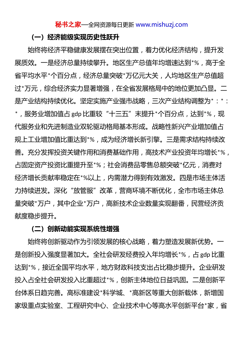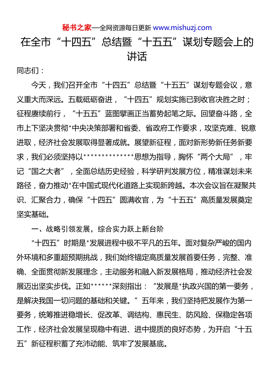 秘书之家—全网资源每日更新 www.mishuzj.com在全市“十四五”总结暨“十五五”谋划专题会上的讲话同志们:今天,我们召开全市“十四五”总结暨“十五五”谋划专题会议,意义重大而深远。五载砥砺奋进,“十四五”规划实施已到收官决胜之时;征程赓续前行,“十五五”蓝图擘画正当蓄势起笔之际。回望奋斗路,全市上下坚决贯彻*中央决策部署和省委、省政府工作要求,攻坚克难、锐意进取,经济社会发展取得显著成就。展望新征程,面对新形势新任务新要求,我们必须坚持以**************思想为指导,胸怀“两个大局”,牢记“国之大者”,全面总结历史经验,科学研判发展方位,精准谋划未来路径,奋力推动*在中国式现代化道路上实现新跨越。本次会议旨在凝聚共识、汇聚合力,确保“十四五”圆满收官,为“十五五”高质量发展奠定坚实基础。一、战略引领发展,综合实力跃上新台阶“十四五”时期是*发展进程中极不平凡的五年。面对复杂严峻的国内外环境和多重超预期挑战,我们始终锚定高质量发展首要任务,完整、准确、全面贯彻新发展理念,主动服务和融入新发展格局,推动经济社会发展迈出坚实步伐。正如******深刻指出:“发展是*执政兴国的第一要务,是解决我国一切问题的基础和关键。”五年来,我们坚持把发展作为第一要务,统筹推进稳增长、促改革、调结构、惠民生、防风险、保稳定各项工作,经济社会发展呈现稳中有进、进中提质的良好态势,为开启“十五五”新征程积蓄了充沛动能、筑牢了发展基底。秘书之家—全网资源每日更新 www.mishuzj.com(一)经济能级实现历史性跃升始终将经济平稳健康发展摆在突出位置,着力优化经济结构,提升发展质效。一是经济总量持续攀升。地区生产总值年均增速达到*%,高于全省平均水平*个百分点,经济总量突破*万亿元大关,人均地区生产总值超过*万元,综合经济实力显著增强,在全省发展格局中的地位更加凸显。二是产业结构持续优化。坚定实施产业强市战略,三次产业结构调整为*:*:*,服务业增加值占 gdp 比重较“十三五”末提升*个百分点,达到*%,现代服务业和先进制造业双轮驱动格局基本形成。战略性新兴产业增加值占规上工业增加值比重达到*%,成为经济增长新引擎。三是需求结构持续改善。充分发挥投资关键作用和消费基础作用,高技术产业投资年均增长*%,占固定资产投资比重提升至*%;社会消费品零售总额突破*亿元,消费对经济增长贡献率稳定在*%以上,内需潜力得到有效激发。四是市场主体活力持续迸发。深化“放管服”改革,营商环境不断优化,全市市场主体总量突破*万户,其中企业*万户,高新技术企业数量实现翻番,民营经济贡献度稳步提升。(二)创新动能实现系统性增强始终将创新驱动作为引领发展的核心战略,着力塑造发展新优势。一是创新投入强度显著加大。全社会研发经费投入年均增长*%,占 gdp 比重达到*%,接近全国平均水平,地方财政科技支出占比稳步提升。企业研发投入占全社会研发投入比重超过*%,创新主体地位日益巩固。二是创新平台体系日趋完善。高标准建设*科学城、*高新区等重大创新载体,新增国家级重点实验室、工程研究中心、企业技术中心等高水平创新平台*家,省秘书之家—全网资源每日更新 www.mishuzj.com级以上创新平台总数突破*家,创新资源集聚效应明显。三是关键技术攻关取得突破。聚焦重点产业领域“卡脖子”问题,组织实施重大科技专项*项,在*、*、*等领域取得一批标志性创新成果,有效发明专利拥有量年均增长*%,技术合同成交额突破*亿元。四是创新人才高地加快构筑。深入实施人才强市战略,制定更具吸引力的人才政策,引进培育国家级高层次人才*名、省级领军人才*名,高技能人才总量突破*万人,创新创造活力竞相迸发。(三)生态品质实现整体性改善始终践行“绿水青山就是金山银山”理念,协同推进降碳、减污、扩绿、增长。一是环境质量持续提升。坚决打好蓝天、碧水、净土保卫战,pm2.5 平均浓度较“十三五”末下降*%,降至*微克/立方米,空气质量优良天数比例稳定在*%以上;地表水国省控断面优良水体比例达到*%,城市集中式饮用水水源地水质 100%达标;土壤环境质量保持稳定。二是绿色转型步伐...