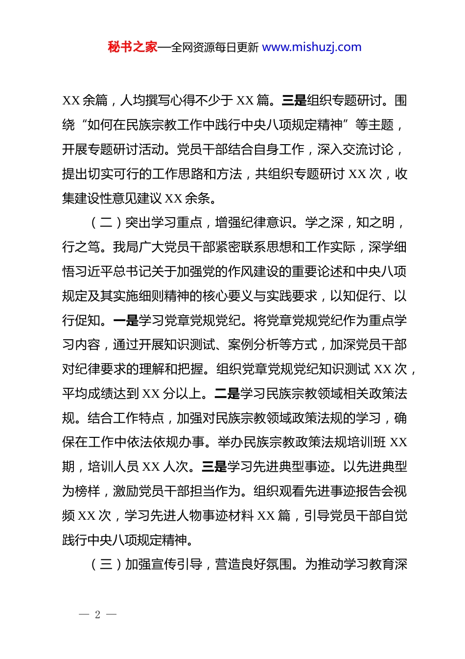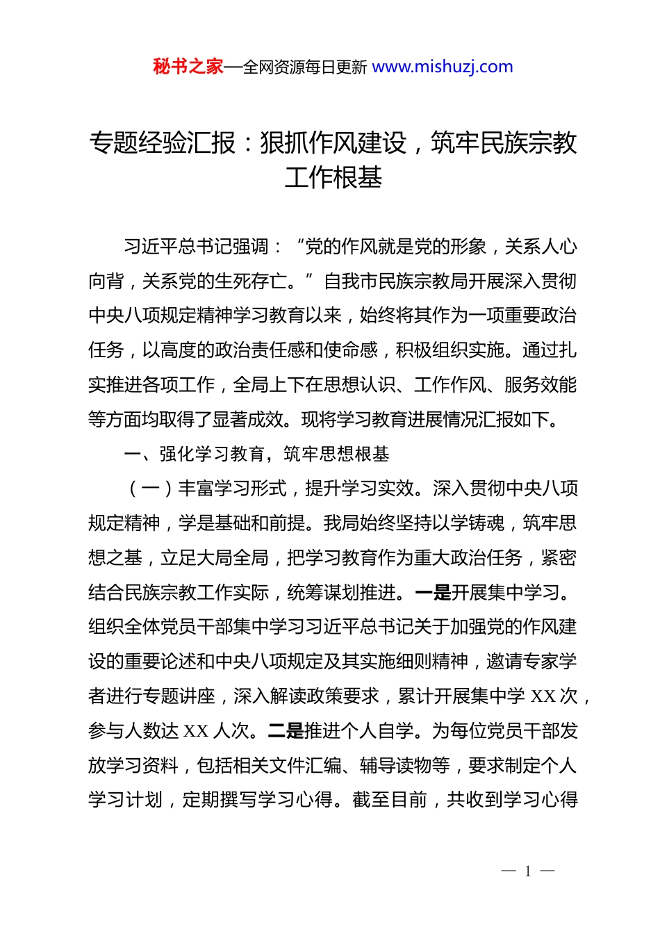 秘书之家—全网资源每日更新 www.mishuzj.com专题经验汇报:狠抓作风建设,筑牢民族宗教工作根基习近平总书记强调:“党的作风就是党的形象,关系人心向背,关系党的生死存亡。”自我市民族宗教局开展深入贯彻中央八项规定精神学习教育以来,始终将其作为一项重要政治任务,以高度的政治责任感和使命感,积极组织实施。通过扎实推进各项工作,全局上下在思想认识、工作作风、服务效能等方面均取得了显著成效。现将学习教育进展情况汇报如下。一、强化学习教育,筑牢思想根基(一)丰富学习形式,提升学习实效。深入贯彻中央八项规定精神,学是基础和前提。我局始终坚持以学铸魂,筑牢思想之基,立足大局全局,把学习教育作为重大政治任务,紧密结合民族宗教工作实际,统筹谋划推进。一是开展集中学习。组织全体党员干部集中学习习近平总书记关于加强党的作风建设的重要论述和中央八项规定及其实施细则精神,邀请专家学者进行专题讲座,深入解读政策要求,累计开展集中学 XX 次,参与人数达 XX 人次。二是推进个人自学。为每位党员干部发放学习资料,包括相关文件汇编、辅导读物等,要求制定个人学习计划,定期撰写学习心得。截至目前,共收到学习心得— 1 —秘书之家—全网资源每日更新 www.mishuzj.comXX 余篇,人均撰写心得不少于 XX 篇。三是组织专题研讨。围绕“如何在民族宗教工作中践行中央八项规定精神”等主题,开展专题研讨活动。党员干部结合自身工作,深入交流讨论,提出切实可行的工作思路和方法,共组织专题研讨 XX 次,收集建设性意见建议 XX 余条。(二)突出学习重点,增强纪律意识。学之深,知之明,行之笃。我局广大党员干部紧密联系思想和工作实际,深学细悟习近平总书记关于加强党的作风建设的重要论述和中央八项规定及其实施细则精神的核心要义与实践要求,以知促行、以行促知。一是学习党章党规党纪。将党章党规党纪作为重点学习内容,通过开展知识测试、案例分析等方式,加深党员干部对纪律要求的理解和把握。组织党章党规党纪知识测试 XX 次,平均成绩达到 XX 分以上。二是学习民族宗教领域相关政策法规。结合工作特点,加强对民族宗教领域政策法规的学习,确保在工作中依法依规办事。举办民族宗教政策法规培训班 XX期,培训人员 XX 人次。三是学习先进典型事迹。以先进典型为榜样,激励党员干部担当作为。组织观看先进事迹报告会视频 XX 次,学习先进人物事迹材料 XX 篇,引导党员干部自觉践行中央八项规定精神。(三)加强宣传引导,营造良好氛围。为推动学习教育深— 2 —秘书之家—全网资源每日更新 www.mishuzj.com入开展,我局积极加强宣传引导,营造浓厚的学习氛围。一是利用内部宣传栏。在局机关设置宣传栏,及时张贴学习教育相关文件、工作动态、先进经验等内容,共更新宣传栏内容 XX期。二是借助新媒体平台。通过微信公众号、工作群等新媒体平台,定期推送学习资料、政策解读、警示案例等信息,累计推送信息 XX 条,阅读量达 XX 次。三是编印学习教育简报。及时总结学习教育中的好经验、好做法,编印学习教育简报XX 期,向上级部门和各区县民族宗教部门报送,促进工作交流。二、聚焦专项整治,狠抓工作落实(一)违规吃喝专项整治。作风建设永远在路上,针对违规吃喝这一顽疾,我局保持高压态势,坚决予以整治。一是全面自查自纠。组织全局党员干部对照违规吃喝问题清单,深入开展自查自纠,共查找问题 XX 个,已全部整改到位。二是加强监督检查。成立专项监督检查组,采取明察暗访、随机抽查等方式,对机关食堂、公务接待场所等进行监督检查,累计开展检查 XX 次,未发现违规吃喝问题。三是严肃执纪问责。对发现的违规吃喝问题,坚持零容忍,严肃追究相关人员责任。建立健全问题线索移送机制,对涉嫌违纪违法的问题,及时移送纪检监察机关处理。— 3 —秘书之家—全网资源每日更新 www.mishuzj.com(二)群众身边不正之风和腐败问题专项整治。民心是最大的政治,我局将整治群众身边不正之风和腐败问题作为重要任务,切实增强群众的获得感、幸福感、安全感。一是开展线索排查。通过设立举报电话、邮...