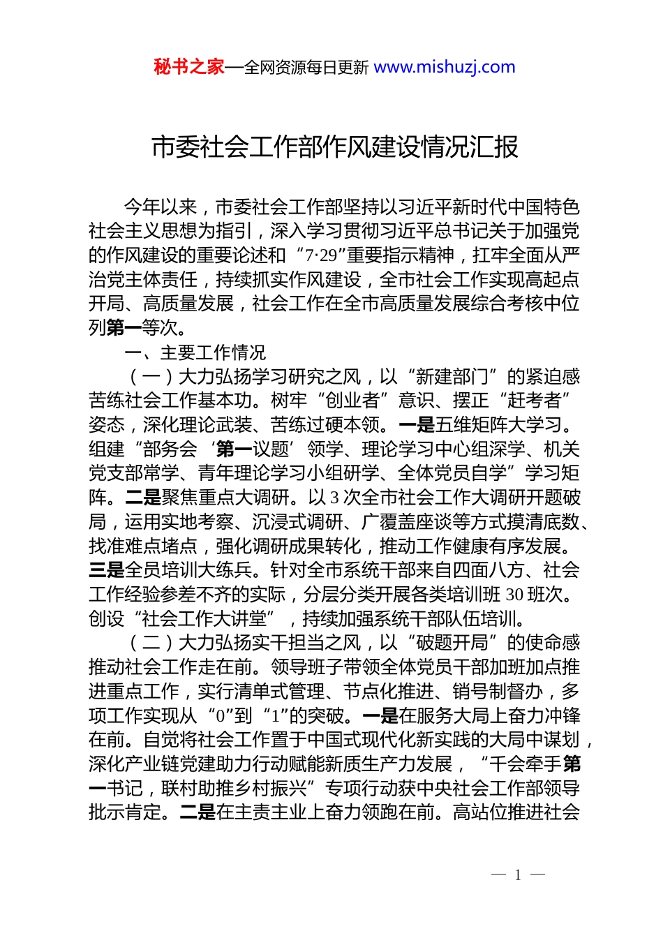 秘书之家—全网资源每日更新 www.mishuzj.com市委社会工作部作风建设情况汇报今年以来,市委社会工作部坚持以习近平新时代中国特色社会主义思想为指引,深入学习贯彻习近平总书记关于加强党的作风建设的重要论述和“7·29”重要指示精神,扛牢全面从严治党主体责任,持续抓实作风建设,全市社会工作实现高起点开局、高质量发展,社会工作在全市高质量发展综合考核中位列第一等次。一、主要工作情况(一)大力弘扬学习研究之风,以“新建部门”的紧迫感苦练社会工作基本功。树牢“创业者”意识、摆正“赶考者”姿态,深化理论武装、苦练过硬本领。一是五维矩阵大学习。组建“部务会‘第一议题’领学、理论学习中心组深学、机关党支部常学、青年理论学习小组研学、全体党员自学”学习矩阵。二是聚焦重点大调研。以 3 次全市社会工作大调研开题破局,运用实地考察、沉浸式调研、广覆盖座谈等方式摸清底数、找准难点堵点,强化调研成果转化,推动工作健康有序发展。三是全员培训大练兵。针对全市系统干部来自四面八方、社会工作经验参差不齐的实际,分层分类开展各类培训班 30 班次。创设“社会工作大讲堂”,持续加强系统干部队伍培训。(二)大力弘扬实干担当之风,以“破题开局”的使命感推动社会工作走在前。领导班子带领全体党员干部加班加点推进重点工作,实行清单式管理、节点化推进、销号制督办,多项工作实现从“0”到“1”的突破。一是在服务大局上奋力冲锋在前。自觉将社会工作置于中国式现代化新实践的大局中谋划,深化产业链党建助力行动赋能新质生产力发展,“千会牵手第一书记,联村助推乡村振兴”专项行动获中央社会工作部领导批示肯定。二是在主责主业上奋力领跑在前。高站位推进社会— 1 —秘书之家—全网资源每日更新 www.mishuzj.com治理现代化,高质量抓好新兴领域党建,高水平推动党建引领基层治理,高效能做好凝聚服务群众工作,相关工作 5 次在全国会议上作经验交流,今年市社工考试报名人数全国第一,“儒林实践”、学校社工等典型经验被全国推广。三是在难题瓶颈上奋力探路在前。发扬“勇当探路者”“敢啃硬骨头”精神,紧盯新就业群体管理最末端、基层社会治理第一线,实施“党建引领新就业群体基层站点建设”“党建引领小区治理”“爱满志愿行”三大行动,不断增强党在各类组织各类群体中的组织力凝聚力向心力。(三)大力弘扬深入群众之风,以“看家本领”的责任感筑牢社会工作压舱石。把深入群众、服务群众作为看家本领,厚植社会工作群众根基。一是全方位常态联系。建立班子成员“十个一”基层联系点制度,健全市市县社会工作部门负责人主动接访下访制度,设立党建引领基层治理观察联系点,切实加强与基层群众的密切联系。二是沉浸式深入了解。坚持群众需求在哪里,社会工作就延伸到哪里,社会工作党员干部就走进哪里。今年发动市市县社会工作部门 663 名同志“跟人跟车”体验式调研,收集问题建议 1869 条。三是实打实精准服务。持续深化整治形式主义为基层减负,制定关爱凝聚新就业群体16 条举措,打响高考中考“你逐梦·我护航”等志愿服务品牌,把工作做到群众心坎上。(四)大力弘扬清正廉洁之风,以“初创团队”的自豪感树立社工干部好形象。牢记市委寄予的“四个模范”期望,树立忠诚干净担当的良好形象。一是从内心深处强化自觉。部务会带领全体党员干部对标社会工作崇高使命、对照新时代好干部标准,深入开展纪律教育,引领党员干部守牢纪律底线,锻造过硬作风。二是在关键环节防范风险。抓好部门牵头的规范村(社区)工作事务等工作,定期会同派驻纪检组分析研判,向部机关全体党员干部家属发放家庭助廉倡议书,在潜移默化— 2 —秘书之家—全网资源每日更新 www.mishuzj.com中不断增强抵御风险能力。三是靠制度机制形成长效。将遵规守纪情况作为模范机关建设、评先评优、干部任用、“四强”党支部建设的重要内容,制定工作人员“十严禁”纪律要求,今年学习教育期间完善内控管理等长效机制,不断培育风清气正的政治生态。二、下一步工作打算(一)坚持政治引领。始终坚持以习近平新时代中国特色社会主义思想为指引,围绕...