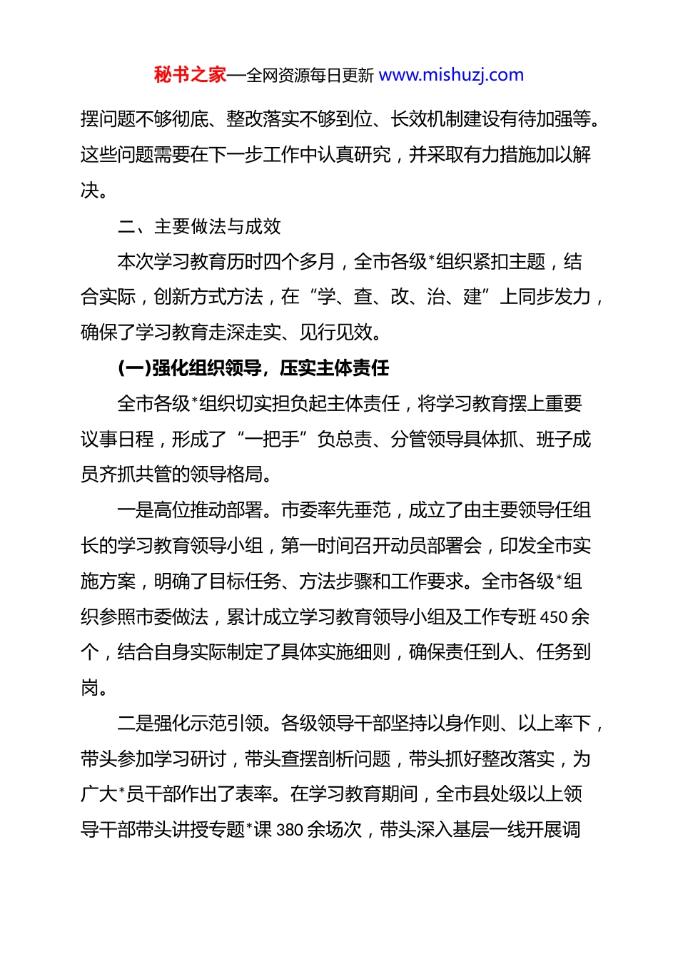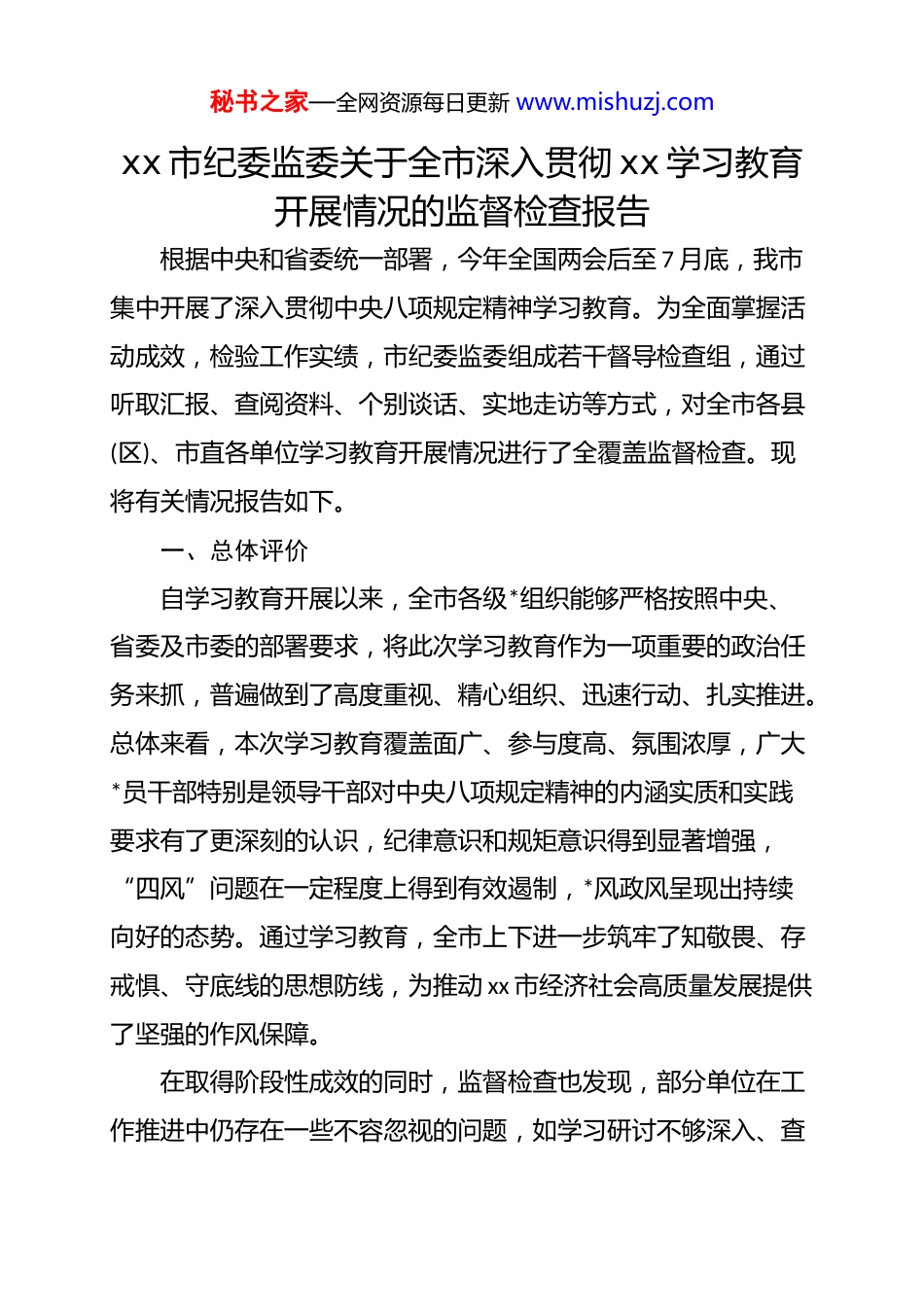 秘书之家—全网资源每日更新 www.mishuzj.comxx 市纪委监委关于全市深入贯彻 xx 学习教育开展情况的监督检查报告根据中央和省委统一部署,今年全国两会后至 7 月底,我市集中开展了深入贯彻中央八项规定精神学习教育。为全面掌握活动成效,检验工作实绩,市纪委监委组成若干督导检查组,通过听取汇报、查阅资料、个别谈话、实地走访等方式,对全市各县(区)、市直各单位学习教育开展情况进行了全覆盖监督检查。现将有关情况报告如下。一、总体评价自学习教育开展以来,全市各级*组织能够严格按照中央、省委及市委的部署要求,将此次学习教育作为一项重要的政治任务来抓,普遍做到了高度重视、精心组织、迅速行动、扎实推进。总体来看,本次学习教育覆盖面广、参与度高、氛围浓厚,广大*员干部特别是领导干部对中央八项规定精神的内涵实质和实践要求有了更深刻的认识,纪律意识和规矩意识得到显著增强,“四风”问题在一定程度上得到有效遏制,*风政风呈现出持续向好的态势。通过学习教育,全市上下进一步筑牢了知敬畏、存戒惧、守底线的思想防线,为推动 xx 市经济社会高质量发展提供了坚强的作风保障。在取得阶段性成效的同时,监督检查也发现,部分单位在工作推进中仍存在一些不容忽视的问题,如学习研讨不够深入、查秘书之家—全网资源每日更新 www.mishuzj.com摆问题不够彻底、整改落实不够到位、长效机制建设有待加强等。这些问题需要在下一步工作中认真研究,并采取有力措施加以解决。二、主要做法与成效本次学习教育历时四个多月,全市各级*组织紧扣主题,结合实际,创新方式方法,在“学、查、改、治、建”上同步发力,确保了学习教育走深走实、见行见效。(一)强化组织领导,压实主体责任全市各级*组织切实担负起主体责任,将学习教育摆上重要议事日程,形成了“一把手”负总责、分管领导具体抓、班子成员齐抓共管的领导格局。一是高位推动部署。市委率先垂范,成立了由主要领导任组长的学习教育领导小组,第一时间召开动员部署会,印发全市实施方案,明确了目标任务、方法步骤和工作要求。全市各级*组织参照市委做法,累计成立学习教育领导小组及工作专班 450 余个,结合自身实际制定了具体实施细则,确保责任到人、任务到岗。二是强化示范引领。各级领导干部坚持以身作则、以上率下,带头参加学习研讨,带头查摆剖析问题,带头抓好整改落实,为广大*员干部作出了表率。在学习教育期间,全市县处级以上领导干部带头讲授专题*课 380 余场次,带头深入基层一线开展调秘书之家—全网资源每日更新 www.mishuzj.com研督导 900 余次,有效传导了压力,激发了动力。三是严格督导检查。市纪委监委将对学习教育的监督作为政治监督的重要内容,牵头组建了 7 个专项督导组,采取“四不两直”方式,对全市 12 个县(区)和 85 家市直单位开展了两轮全覆盖、多轮次“点穴式”监督检查。各督导组深入一线,精准发现问题,及时反馈意见,共形成专题监督报告 15 份,提出整改建议 210 余条,有力推动了学习教育各项任务的落地落实。(二)深化学习研讨,筑牢思想根基各单位坚持把学习贯穿始终,通过多形式、分层次、全覆盖的学习,引导广大*员干部从思想深处正本清源、固本培元。一是聚焦学习内容,确保学深悟透。各级*组织将******关于加强*的作风建设的重要论述和系列****批示精神作为首要学习内容,组织*员干部原原本本学习《锲而不舍落实中央八项规定精神,以优良*风引领社风民风》等重要文章和《***关于加强*的作风建设论述摘编》等权威读本。同时,将新修订的《*政机关厉行节约反对浪费条例》等*内法规作为必学内容,确保学习内容权威准确。二是丰富学习形式,提升学习效果。在坚持“三会一课”、主题*日等传统学习方式的基础上,积极创新载体。全市各级*组织累计开展*委(*组)理论学习中心组专题学习 1350 余次,举办专题读书班、研讨会 860 余场,覆盖*员干部 16 万余人次。部分单秘书之家—全网资源每日更新 www.mishuzj.com位还组织了知识竞赛、演讲比赛、情景剧演绎等活动,增强了学习的吸引力和感染力。同时,充分运用线上学习平台,推送学习资料...