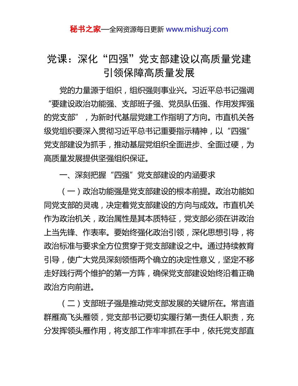 秘书之家—全网资源每日更新 www.mishuzj.com党课:深化“四强”党支部建设以高质量党建引领保障高质量发展党的力量源于组织,组织强则事业兴。习近平总书记强调“要建设政治功能强、支部班子强、党员队伍强、作用发挥强的党支部”,为新时代基层党建工作指明了方向。市直机关各级党组织要深入贯彻习近平总书记重要指示精神,以“四强”党支部建设为抓手,推动基层党组织全面进步、全面过硬,为高质量发展提供坚强组织保证。一、深刻把握“四强”党支部建设的内涵要求(一)政治功能强是党支部建设的根本前提。政治功能如同党支部的灵魂,决定着党支部建设的方向与成效。市直机关作为政治机关,政治属性是其本质特征,党支部必须在讲政治上当先锋、作表率。要始终强化政治引领,深化思想引导,将政治标准与要求全方位贯穿于党支部建设之中。通过持续教育引导,使广大党员深刻领悟两个确立的决定性意义,坚定不移走好践行两个维护的第一方阵,确保党支部建设始终沿着正确政治方向前进。(二)支部班子强是推动党支部发展的关键所在。常言道群雁高飞头雁领,党支部书记要切实履行第一责任人职责,充分发挥领头雁作用,将支部工作牢牢抓在手中,依托党支部直秘书之家—全网资源每日更新 www.mishuzj.com接管理党员的优势,严格做好党员教育管理监督工作。支部班子成员要同心同向、群策群力,形成强大工作合力,及时对支部重要事务开展深入研讨、科学决策并高效落实,以班子团结带动支部整体战斗力提升。(三)党员队伍强是夯实党支部发展的基础保障。党的先进性与纯洁性,正是通过每一位党员的先进性与纯洁性来彰显;党的执政使命,亦需依靠每一位党员扎实有效的工作来完成。市直机关在党和国家治理体系中地位特殊,党员干部集中,权力责任重大,这要求市直机关党员必须具备更高的政治觉悟、更精的理论素养、更实的工作作风。要精心选树政治素质优、岗位履责佳、作风品行正、群众评价好的优秀党员,树立先进标杆,展现先锋形象,为党支部发展筑牢坚实人才根基。(四)作用发挥强是检验党支部建设的最终目标。要将推动中心工作、完成重大任务作为党支部建设的实践考场,不断探索党建与业务深度融合的有效路径,坚持围绕中心抓党建、抓好党建促业务。充分发挥党支部政治引领、督促落实、监督保障职能,大力推广以重点任务落实为核心的支部工作法,形成可复制、可推广的典型经验,为全面落实党中央赋予市直机关的各项工作职责提供强有力的组织支撑与保障。二、充分肯定市直机关“四强”党支部创建工作成效(一)聚焦机制建设,构建科学规范的创建管理体系。市直机关工委立足实际,经过深入调研、系统总结和广泛征求意秘书之家—全网资源每日更新 www.mishuzj.com见,精心制定《市直机关四强党支部创建管理办法(试行)》。该办法全面涵盖创建标准、评定流程、动态管理等关键环节,明确创建工作的路线图和任务书。在创建要求上,细化政治功能、班子建设、党员队伍和作用发挥四大维度的具体指标;在评定机制上,科学设定年度命名比例,规范党支部申报-机关党委初审-党组(党委)审定-工委复核的评定程序;在动态管理上,建立负面清单制度和定期复查机制,确保创建工作始终高标准推进。这一制度创新为市直机关基层党组织建设提供了规范化、标准化的工作指南,使创建工作有据可依、有章可循。(二)强化动态管理,打造闭环式质量管控体系。实施动态管理是确保创建质量的核心举措。市直机关工委建立年度评定+定期复核的双重机制,严把质量关。在评定环节,坚持宁缺毋滥原则,通过自下而上申报、层层严格审核的程序,确保每个被命名的党支部都经得起检验。对已命名的四强党支部,每年开展回头看,通过实地检查、资料复核、群众评议等方式进行全面体检,对不符合标准的及时摘牌,形成能上能下的良性竞争机制。截至目前,已有 60 多个党支部通过严格评定获得称号,并在后续复核中保持优良表现。这种动态管理机制有效激发了基层党组织的创建活力,形成了比学赶超的良好氛围。(三)坚持示范引领,搭建经验交流共享平台。典型带动是扩大创建成效的有效途径。市直机关工委精心打造多层次的交流...