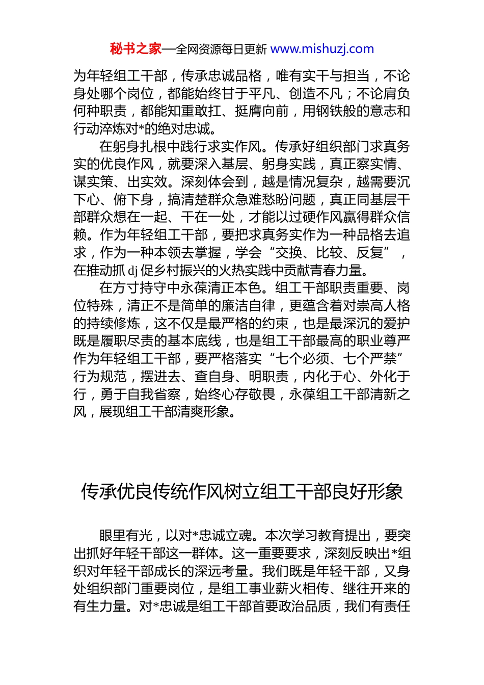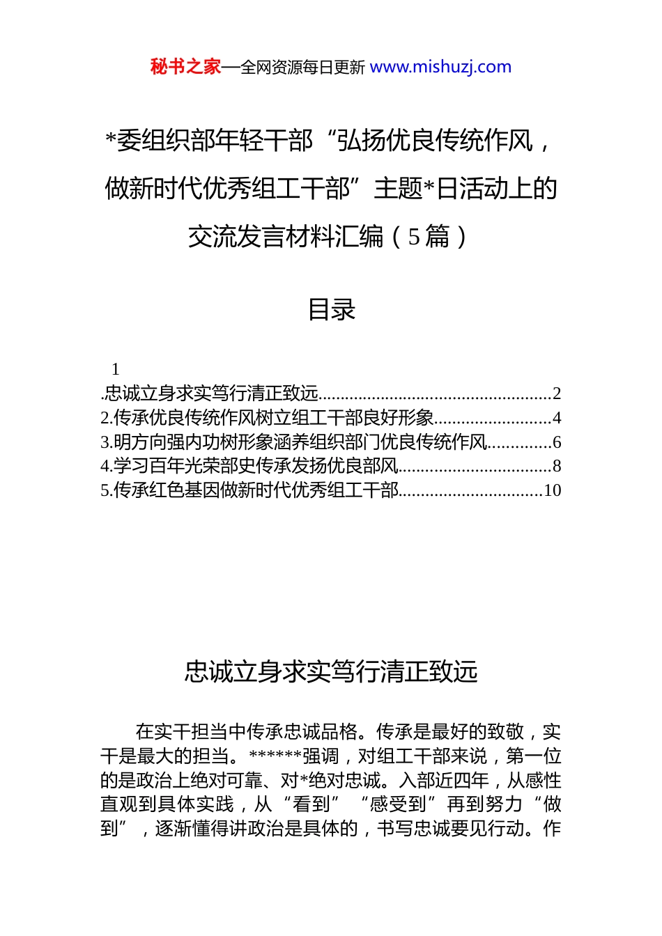 秘书之家—全网资源每日更新 www.mishuzj.com*委组织部年轻干部“弘扬优良传统作风,做新时代优秀组工干部”主题*日活动上的交流发言材料汇编(5 篇)目录1.忠诚立身求实笃行清正致远....................................................22.传承优良传统作风树立组工干部良好形象..........................43.明方向强内功树形象涵养组织部门优良传统作风..............64.学习百年光荣部史传承发扬优良部风..................................85.传承红色基因做新时代优秀组工干部................................10忠诚立身求实笃行清正致远在实干担当中传承忠诚品格。传承是最好的致敬,实干是最大的担当。******强调,对组工干部来说,第一位的是政治上绝对可靠、对*绝对忠诚。入部近四年,从感性直观到具体实践,从“看到”“感受到”再到努力“做到”,逐渐懂得讲政治是具体的,书写忠诚要见行动。作秘书之家—全网资源每日更新 www.mishuzj.com为年轻组工干部,传承忠诚品格,唯有实干与担当,不论身处哪个岗位,都能始终甘于平凡、创造不凡;不论肩负何种职责,都能知重敢扛、挺膺向前,用钢铁般的意志和行动淬炼对*的绝对忠诚。在躬身扎根中践行求实作风。传承好组织部门求真务实的优良作风,就要深入基层、躬身实践,真正察实情、谋实策、出实效。深刻体会到,越是情况复杂,越需要沉下心、俯下身,搞清楚群众急难愁盼问题,真正同基层干部群众想在一起、干在一处,才能以过硬作风赢得群众信赖。作为年轻组工干部,要把求真务实作为一种品格去追求,作为一种本领去掌握,学会“交换、比较、反复”,在推动抓 dj 促乡村振兴的火热实践中贡献青春力量。在方寸持守中永葆清正本色。组工干部职责重要、岗位特殊,清正不是简单的廉洁自律,更蕴含着对崇高人格的持续修炼,这不仅是最严格的约束,也是最深沉的爱护既是履职尽责的基本底线,也是组工干部最高的职业尊严作为年轻组工干部,要严格落实“七个必须、七个严禁”行为规范,摆进去、查自身、明职责,内化于心、外化于行,勇于自我省察,始终心存敬畏,永葆组工干部清新之风,展现组工干部清爽形象。 传承优良传统作风树立组工干部良好形象眼里有光,以对*忠诚立魂。本次学习教育提出,要突出抓好年轻干部这一群体。这一重要要求,深刻反映出*组织对年轻干部成长的深远考量。我们既是年轻干部,又身处组织部门重要岗位,是组工事业薪火相传、继往开来的有生力量。对*忠诚是组工干部首要政治品质,我们有责任秘书之家—全网资源每日更新 www.mishuzj.com把*性修养内化为自觉、养成为习惯,做到一言一行讲*性、一举一动彰正气,完成新时代的“传承”与“坚守”。心中有情,以服务人民立心。组织部门是管*治*的重要职能部门,组工干部要自觉做服务群众、服务基层的模范。在基层工作时,我常体会到,文件堆里找答案,不如深入群众问需求,服务群众的过程就是与大家真诚沟通的过程。服务群众的另一个小妙招,是用好“调查研究”这个法宝,“文章不写半句空”的背后是调查研究的扎实积累,只有深入了解真实情况、总结经验、研究问题,才能真正了解民情、掌握民意、解决民忧。肩上有责,以实干担当立业。记得刚到单位时,面对千头万绪的工作,我的第一感觉是“本领恐慌”。后来在熟悉业务政策的过程中,我逐渐发现,做好工作的关键在于静下心来、学用结合,抓住业务能力这个“牛鼻子”。与此同时,年轻干部必须“干”字为要,做到重实功、出实招、见实效。在面对困难和挑战时,只有不断破除惯性思维、敢于尝试、勇于担当,才能练就处理复杂问题的“铁肩膀”。行中有尺,以过硬作风立身。作为组工干部,遵守政治纪律理应挺在最前,既要“别把自己太当回事”,力戒搞特权、耍威风;也要“别把自己太不当回事”,珍惜岗位、敬畏职责、珍视形象。作为年轻干部,打铁还须自身硬,必须时刻以更高的作风标准、更严的纪律要求来约束自己。面对在工作中发现的问题,要经得起磨砺、顶得住压力,还要坚持原则、敢于亮剑,做风清气正的模范维护者。 明方向强内功树形象涵养组织部门优良传秘书之家—全网资源每日更新 www.mishu...
