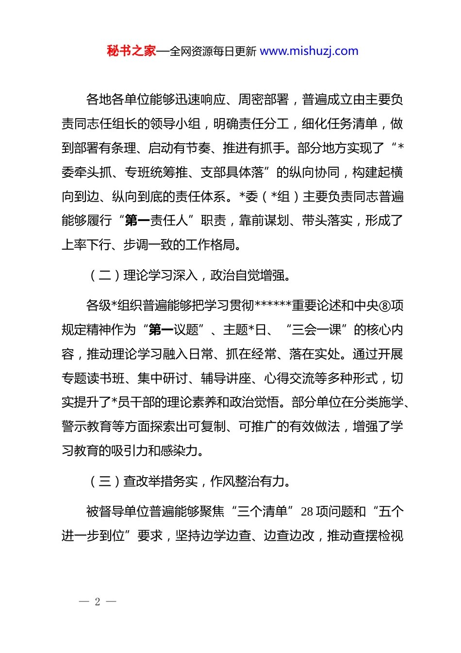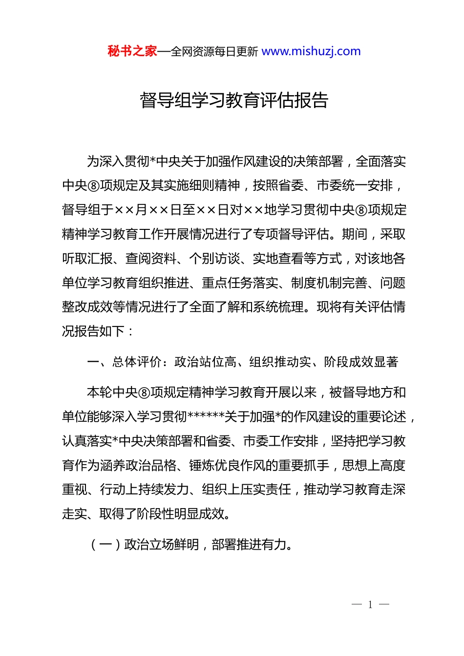 秘书之家—全网资源每日更新 www.mishuzj.com督导组学习教育评估报告为深入贯彻*中央关于加强作风建设的决策部署,全面落实中央⑧项规定及其实施细则精神,按照省委、市委统一安排,督导组于××月××日至××日对××地学习贯彻中央⑧项规定精神学习教育工作开展情况进行了专项督导评估。期间,采取听取汇报、查阅资料、个别访谈、实地查看等方式,对该地各单位学习教育组织推进、重点任务落实、制度机制完善、问题整改成效等情况进行了全面了解和系统梳理。现将有关评估情况报告如下:一、总体评价:政治站位高、组织推动实、阶段成效显著本轮中央⑧项规定精神学习教育开展以来,被督导地方和单位能够深入学习贯彻******关于加强*的作风建设的重要论述,认真落实*中央决策部署和省委、市委工作安排,坚持把学习教育作为涵养政治品格、锤炼优良作风的重要抓手,思想上高度重视、行动上持续发力、组织上压实责任,推动学习教育走深走实、取得了阶段性明显成效。(一)政治立场鲜明,部署推进有力。— 1 —秘书之家—全网资源每日更新 www.mishuzj.com各地各单位能够迅速响应、周密部署,普遍成立由主要负责同志任组长的领导小组,明确责任分工,细化任务清单,做到部署有条理、启动有节奏、推进有抓手。部分地方实现了“*委牵头抓、专班统筹推、支部具体落”的纵向协同,构建起横向到边、纵向到底的责任体系。*委(*组)主要负责同志普遍能够履行“第一责任人”职责,靠前谋划、带头落实,形成了上率下行、步调一致的工作格局。(二)理论学习深入,政治自觉增强。各级*组织普遍能够把学习贯彻******重要论述和中央⑧项规定精神作为“第一议题”、主题*日、“三会一课”的核心内容,推动理论学习融入日常、抓在经常、落在实处。通过开展专题读书班、集中研讨、辅导讲座、心得交流等多种形式,切实提升了*员干部的理论素养和政治觉悟。部分单位在分类施学、警示教育等方面探索出可复制、可推广的有效做法,增强了学习教育的吸引力和感染力。(三)查改举措务实,作风整治有力。被督导单位普遍能够聚焦“三个清单”28 项问题和“五个进一步到位”要求,坚持边学边查、边查边改,推动查摆检视— 2 —秘书之家—全网资源每日更新 www.mishuzj.com向纵深发展,问题整改取得阶段性成效。能够用好专项整治、巡察反馈、审计监督、财会监督、群众举报等渠道,系统梳理问题、动态更新台账、定期评估进度,实现了问题“见人见事”、整改“清单闭环”。部分单位在建立制度台账、整改销号机制、问题复查机制等方面做法扎实,体现出较强的系统治理意识。(四)群众参与加强,基层反响积极。多数单位坚持把群众满意作为检验成效的重要标准,注重发挥基层*组织的桥梁纽带作用,通过“你来评作风”“群众代表走流程”“线上问卷+线下访谈”等方式,广泛收集群众意见、推动问题限期整改,提升了教育实践的群众温度。部分地方将学习教育与为民服务、“双报到”、网格治理等工作深度融合,引导*员干部下沉一线、服务基层,形成了群众“看得见、感受到、愿参与”的良性互动局面。总体来看,本轮学习教育政治导向正确、组织推动有力、基层覆盖较广、作风转化初显,为巩固拓展⑧项规定成果、推动作风建设常态长效打下了坚实基础。二、主要特点与典型做法:部署有深度、推进有亮点、实— 3 —秘书之家—全网资源每日更新 www.mishuzj.com践有抓手从督导情况看,该地各单位能够紧扣学习教育主线任务,结合自身职责定位和管理实际,认真落实“学思用贯通、查改治联动、上下协同推进”的工作要求,呈现出部署精准、组织有序、方法创新、成效初显的总体特点,涌现出一批有代表性、操作性强的典型做法。(一)部署谋划聚焦“精准滴灌”,专班运转高效有序该地*委高度重视、统筹部署,指导所属各单位第一时间成立工作专班,细化任务图谱,明确“时间表、路线图、责任人”,推动学习教育工作条块结合、全面铺开。各单位普遍做到方案制定精准、责任压实到人、措施明确可行,确保学习教育不走过场、不落空档。例如,县交通运输局*委依托原有作风建设机制,组建由*委书记牵头的学习教育专班,配套建立“任...