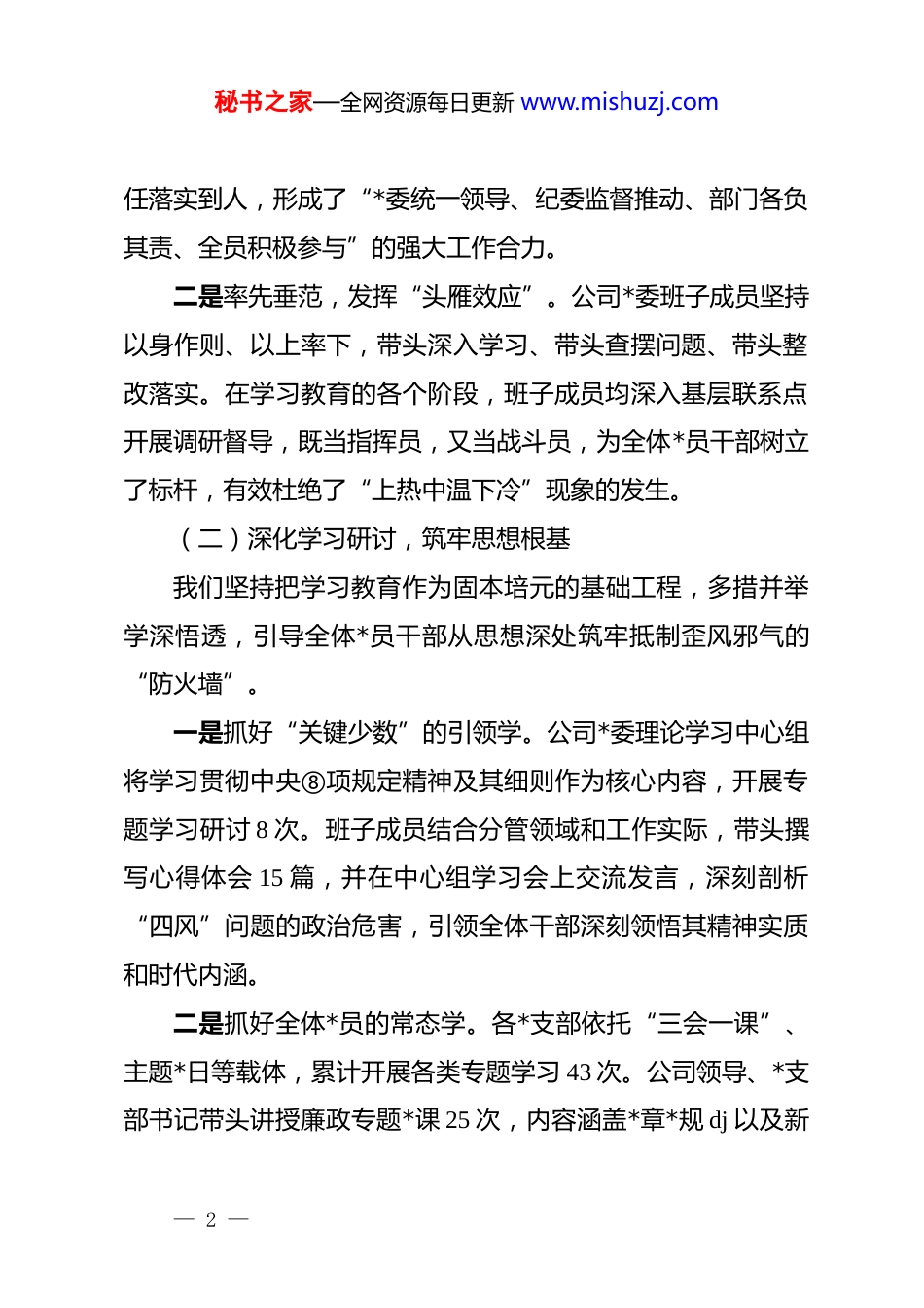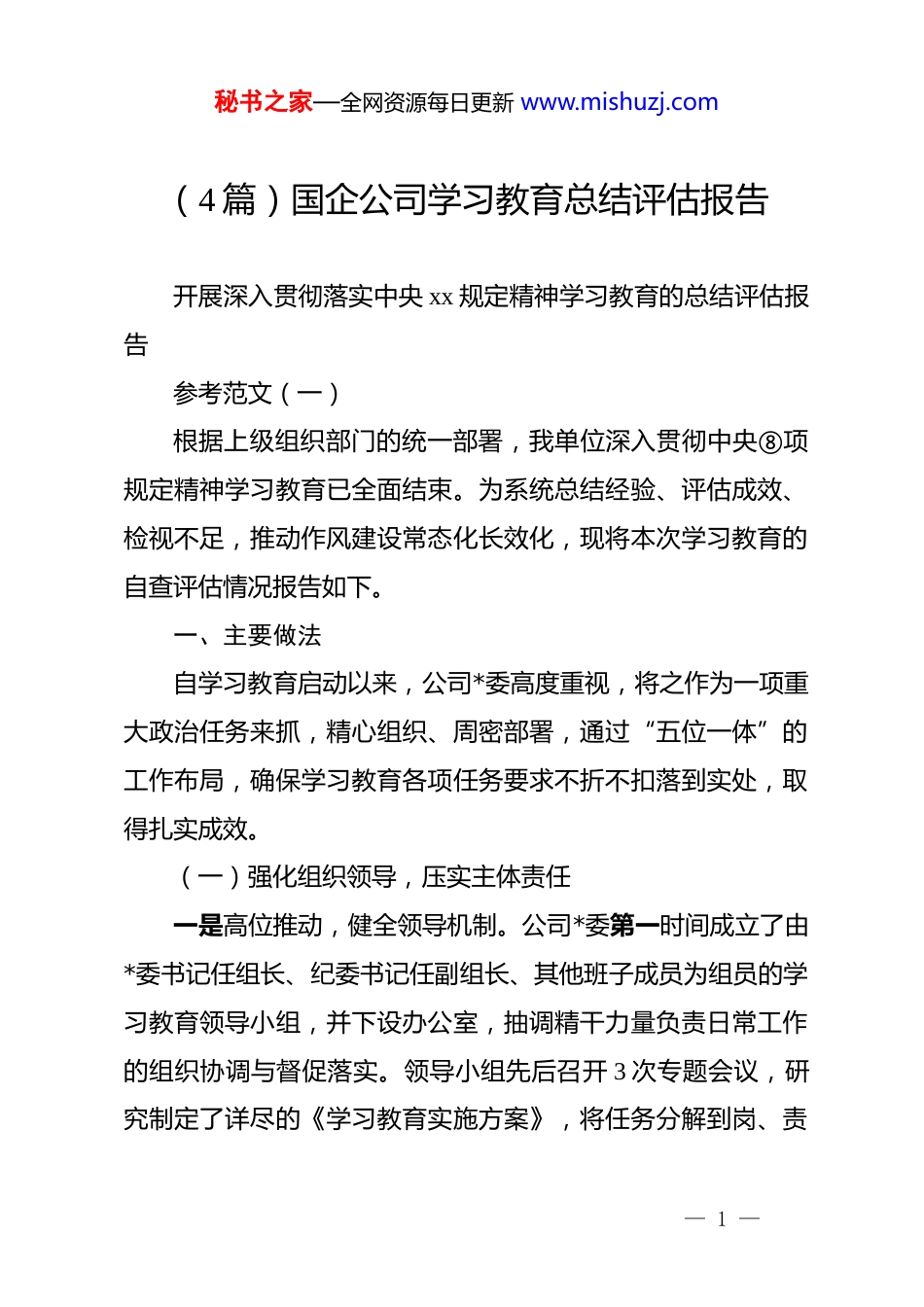 秘书之家—全网资源每日更新 www.mishuzj.com(4 篇)国企公司学习教育总结评估报告开展深入贯彻落实中央 xx 规定精神学习教育的总结评估报告参考范文(一)根据上级组织部门的统一部署,我单位深入贯彻中央⑧项规定精神学习教育已全面结束。为系统总结经验、评估成效、检视不足,推动作风建设常态化长效化,现将本次学习教育的自查评估情况报告如下。一、主要做法自学习教育启动以来,公司*委高度重视,将之作为一项重大政治任务来抓,精心组织、周密部署,通过“五位一体”的工作布局,确保学习教育各项任务要求不折不扣落到实处,取得扎实成效。(一)强化组织领导,压实主体责任一是高位推动,健全领导机制。公司*委第一时间成立了由*委书记任组长、纪委书记任副组长、其他班子成员为组员的学习教育领导小组,并下设办公室,抽调精干力量负责日常工作的组织协调与督促落实。领导小组先后召开 3 次专题会议,研究制定了详尽的《学习教育实施方案》,将任务分解到岗、责— 1 —秘书之家—全网资源每日更新 www.mishuzj.com任落实到人,形成了“*委统一领导、纪委监督推动、部门各负其责、全员积极参与”的强大工作合力。二是率先垂范,发挥“头雁效应”。公司*委班子成员坚持以身作则、以上率下,带头深入学习、带头查摆问题、带头整改落实。在学习教育的各个阶段,班子成员均深入基层联系点开展调研督导,既当指挥员,又当战斗员,为全体*员干部树立了标杆,有效杜绝了“上热中温下冷”现象的发生。(二)深化学习研讨,筑牢思想根基我们坚持把学习教育作为固本培元的基础工程,多措并举学深悟透,引导全体*员干部从思想深处筑牢抵制歪风邪气的“防火墙”。一是抓好“关键少数”的引领学。公司*委理论学习中心组将学习贯彻中央⑧项规定精神及其细则作为核心内容,开展专题学习研讨 8 次。班子成员结合分管领域和工作实际,带头撰写心得体会 15 篇,并在中心组学习会上交流发言,深刻剖析“四风”问题的政治危害,引领全体干部深刻领悟其精神实质和时代内涵。二是抓好全体*员的常态学。各*支部依托“三会一课”、主题*日等载体,累计开展各类专题学习 43 次。公司领导、*支部书记带头讲授廉政专题*课 25 次,内容涵盖*章*规 dj 以及新— 2 —秘书之家—全网资源每日更新 www.mishuzj.com修订的纪律处分条例。我们还深度挖掘内部廉政教育资源,整理编印了《xx 单位近年违纪违法典型案例警示录》,用身边事教育身边人,增强了学习的针对性和震撼力。三是创新学习载体,实现全面覆盖。我们积极利用公司内部网站、微信公众号等线上平台,打造“指尖上的廉洁课堂”。定期推送学习资料、专家解读文章和典型案例通报,累计推送信息 120 余条,覆盖员工超过 3000 人次。这种线上线下相结合的模式,有效解决了工学矛盾,方便员工利用碎片化时间随时学、随地学,确保了学习教育无死角、全覆盖。(三)聚焦查摆问题,深挖病灶根源我们坚持问题导向,以“刀刃向内”的勇气和自我革命的精神,深入开展问题查摆,确保问题找得准、挖得深、查得透。一是多渠道广泛征求意见。通过设置意见箱、开通举报热线和电子邮箱、召开座谈会等多种形式,广泛听取干部职工、服务对象和社会各界的意见建议。同时,纪委工作人员深入基层一线、项目现场,与员工面对面交流,累计开展个别谈话120 余人次,原汁原味收集各类问题线索。二是全方位开展自查自纠。公司纪委牵头成立专项监督小组,聚焦违规吃喝、违规收送礼品礼金、违规发放津补贴、违规使用公车、餐饮浪费以及形式主义、官僚主义等突出问题,— 3 —秘书之家—全网资源每日更新 www.mishuzj.com下发《关于开展违反中央⑧项规定精神问题自查自纠的通知》。各部门、各基层单位对照要求,逐项进行自查,形成问题清单,确保自查不留盲区。三是精准化开展监督检查。专项监督小组采取不发通知、不打招呼、直奔现场的方式,开展明察暗访 12 次。同时,我们积极探索“大数据+监督”新模式,依托财务系统、公车管理系统和营销系统,对公务接待、差旅报销、车辆使用、客户投诉等数据进行交叉比对和深度分析,精准筛查异常数据,...