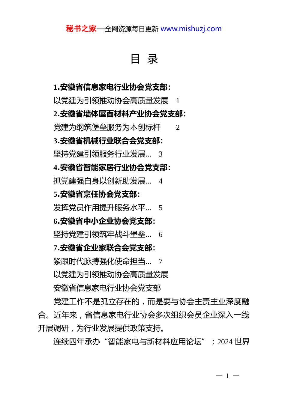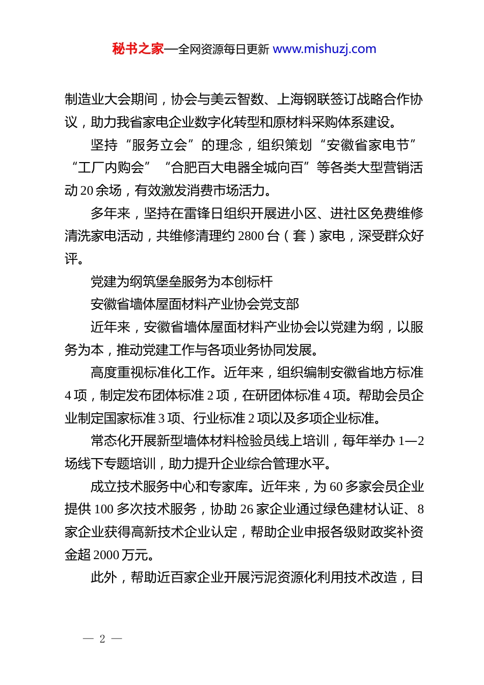 秘书之家—全网资源每日更新 www.mishuzj.com目 录1.安徽省信息家电行业协会党支部:以党建为引领推动协会高质量发展12.安徽省墙体屋面材料产业协会党支部:党建为纲筑堡垒服务为本创标杆23.安徽省机械行业联合会党支部:坚持党建引领服务行业发展…34.安徽省智能家居行业协会党支部:抓党建强自身以创新助发展…45.安徽省烹任协会党支部:发挥党员作用提升服务水平…56.安徽省中小企业协会党支部:坚持党建引领筑牢战斗堡垒…67.安徽省企业家联合会党支部:紧跟时代脉搏强化使命担当…7以党建为引领推动协会高质量发展安徽省信息家电行业协会党支部党建工作不是孤立存在的,而是要与协会主责主业深度融合。近年来,省信息家电行业协会多次组织会员企业深入一线开展调研,为行业发展提供政策支持。连续四年承办“智能家电与新材料应用论坛”;2024 世界— 1 —秘书之家—全网资源每日更新 www.mishuzj.com制造业大会期间,协会与美云智数、上海钢联签订战略合作协议,助力我省家电企业数字化转型和原材料采购体系建设。坚持“服务立会”的理念,组织策划“安徽省家电节”“工厂内购会”“合肥百大电器全城向百”等各类大型营销活动 20 余场,有效激发消费市场活力。多年来,坚持在雷锋日组织开展进小区、进社区免费维修清洗家电活动,共维修清理约 2800 台(套)家电,深受群众好评。党建为纲筑堡垒服务为本创标杆安徽省墙体屋面材料产业协会党支部近年来,安徽省墙体屋面材料产业协会以党建为纲,以服务为本,推动党建工作与各项业务协同发展。高度重视标准化工作。近年来,组织编制安徽省地方标准4 项,制定发布团体标准 2 项,在研团体标准 4 项。帮助会员企业制定国家标准 3 项、行业标准 2 项以及多项企业标准。常态化开展新型墙体材料检验员线上培训,每年举办 1—2场线下专题培训,助力提升企业综合管理水平。成立技术服务中心和专家库。近年来,为 60 多家会员企业提供 100 多次技术服务,协助 26 家企业通过绿色建材认证、8家企业获得高新技术企业认定,帮助企业申报各级财政奖补资金超 2000 万元。此外,帮助近百家企业开展污泥资源化利用技术改造,目— 2 —秘书之家—全网资源每日更新 www.mishuzj.com前行业日均处置污泥达 6000 吨,已发展成为协同处置煤矸石、建筑垃圾、生活污泥的主导产业。坚持党建引领服务行业发展安徽省机械行业联合会党支部为努力促进行业发展,省机械行业联合会积极发挥党支部战斗堡垒作用和党员先锋模范作用。参与企业调研,先后对内燃机、工业母机、工业机器人、3D 打印、工程机械关键零部件等行业进行调研,撰写调研报告;对企业反映的问题和意见要求,认真听取,收集整改。连续举办 25 届装备制造业博览会,获得社会及企业好评;每年举办“双招双引”活动,吸引一大批外省装备制造企业来安徽落户;每年组织专业培训、职业技能竞赛、科学技术奖评审,以及筹建省机械行业专家库等,积极做好动员和引导工作。相关工作获得中国机械工业联合会肯定、表扬。省机械行业联合会党建工作和行业活动促进了行业发展。近几年来,全省机械工业保持较大幅度增长。抓党建强自身以创新助发展安徽省智能家居行业协会党支部省智能家居行业协会以“数智化”为总牵引,着力推动协会工作与行业发展。组织会员企业开展 40 多场技术交流活动;加强与政府部门沟通协调,为企业争取政策支持。今年 5 月举办的— 3 —秘书之家—全网资源每日更新 www.mishuzj.com“智能家居探索节”,展现了安徽智能家居产业的创新实力,勾勒出产业升级的清晰路径,力促产业引领性发展。如何以“创新实践”进一步提升“党建质效”?要深化融合创新,提升党建“引领力”。探索“党建+”模式,围绕核心技术攻关、市场开拓等设立攻坚项目。要注重梯队培养,提升党建“续航力”。把业务骨干培养成党员,把党员培养成业务骨干,建立健全年轻干部选拔、培养机制。要构建协同机制,提升党建“聚合力”。搭建行业协会商会党建交流平台,推动产业链上下游协会党组织间的联建共建,实现资源共享、优势互补。发挥党员作用提升服务水平安徽省烹任协会...