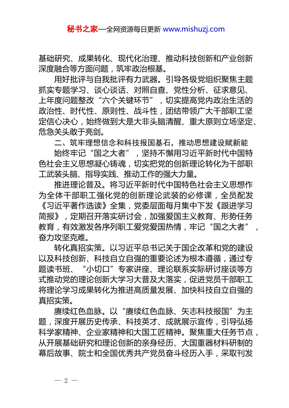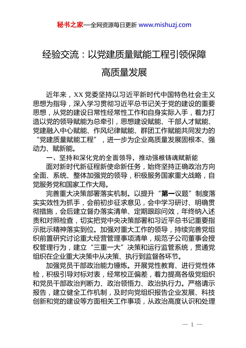 秘书之家—全网资源每日更新 www.mishuzj.com经验交流:以党建质量赋能工程引领保障高质量发展近年来,XX 党委坚持以习近平新时代中国特色社会主义思想为指导,深入学习贯彻习近平总书记关于党的建设的重要思想,从党的建设日常性经常性工作和自身实际入手,着力打造以党的领导赋能为总牵引,思想建设赋能、干部人才赋能、党建融入中心赋能、作风纪律赋能、群团工作赋能共同发力的“党建质量赋能工程”,进一步为企业高质量发展固根本、强动力、赋新能。一、坚持和深化党的全面领导,推动强根铸魂赋新能面对新时代新征程新使命新任务,始终坚持正确政治方向全面、系统、整体加强党的领导,积极服务国家重大战略,自觉服务党和国家工作大局。完善重大决策部署落实机制。以提升“第一议题”制度落实实效性为抓手,会前初步征求意见,会中学习研讨、明确贯彻措施,会后建立督办落实清单、定期跟踪问效,年终纳入述责和对照检查,切实把党中央决策部署和习近平总书记重要指示批示精神落实到位。加强对重大工作的领导,持续完善党组织前置研究讨论重大经营管理事项清单,规范子公司董事会授权管理行为,建立“三重一大”决策和运行监管系统,贯通党组织在企业重大决策中从决策、执行到监督各环节。加强党员干部政治能力锤炼。开展党性教育、进行党性体检,积极引导对标对表,经常校正偏差,着力提高各级党组织和党员干部政治判断力、政治领悟力、政治执行力。严格请示报告,建立健全工作机制,及时向党组织报告企业发展、科技创新和党的建设等方面相关工作事项,从政治高度认识和处理— 1 —秘书之家—全网资源每日更新 www.mishuzj.com基础研究、成果转化、现代化治理、推动科技创新和产业创新深度融合等方面问题,筑牢政治根基。用好批评与自我批评有力武器。引导各级党组织聚焦主题抓实专题学习、谈心谈话、对照自查、党性分析、征求意见、上年度问题整改“六个关键环节”,切实提高党内政治生活的政治性、时代性、原则性、战斗性,团结带领广大干部职工坚定信心决心,始终做到大是大非头脑清醒、重大原则立场坚定、危急关头敢于亮剑。二、筑牢理想信念和科技报国基石,推动思想建设赋新能始终牢记“国之大者”,坚持不懈用习近平新时代中国特色社会主义思想凝心铸魂,切实把党的创新理论转化为干部职工武装头脑、指导实践、推动工作的强大力量。推进理论普及。将习近平新时代中国特色社会主义思想作为全体干部职工强化党的创新理论武装的必修课,全员配发《习近平著作选读》全集,党委层面每月集中下发《跟进学习简报》,定期召开落实研讨会,加强爱国主义教育、形势任务教育,有效激发各序列职工爱党爱国热情,牢记“国之大者”,奋力攻坚克难。转化真招实策。以习近平总书记关于国企改革和党的建设以及科技创新、科技自立自强的重要论述为根本遵循,通过专题读书班、“小切口”专家讲座、理论联系实际研讨座谈等方式推动党的理论创新大学习大普及大落实,促进党员干部职工将理论学习成果转化为推进高质量发展、加快科技自立自强的真招实策。赓续红色血脉。以“赓续红色血脉、矢志科技报国”为主题,深度开展历史传承、科技英才、成就展示宣传,引导弘扬科学家精神、企业家精神和大国工匠精神。聚焦重大任务节点,从开展基础研究和理论创新的亲身经历、大国重器材料研制的幕后故事、院士和全国优秀共产党员奋斗经历入手,采取刊发— 2 —秘书之家—全网资源每日更新 www.mishuzj.com稿件、发布书籍、拍摄“微电影”、邀请访谈等多种手段,精心组织开展“讲故事”“讲科普”“讲精神”等系列宣传,大力营造见贤思齐的良好氛围。三、瞄准高素质专业化发力,推动干部人才队伍赋新能坚持科技是第一生产力、人才是第一资源、创新是第一动力,不断加强干部队伍建设、实施人才强企战略、激励担当作为,切实为改革发展筑牢基石。牢固树立重实干、重实绩、重担当的用人导向。健全领导人员选拔任用体系,加大干部挂职锻炼、双向交流力度,构建管理人员能力素质模型,规划成长路径与发展通道,进一步优化队伍能力。深化赋能训战培训,加大关键核心技术攻关、重大项目建设、重点改革攻...