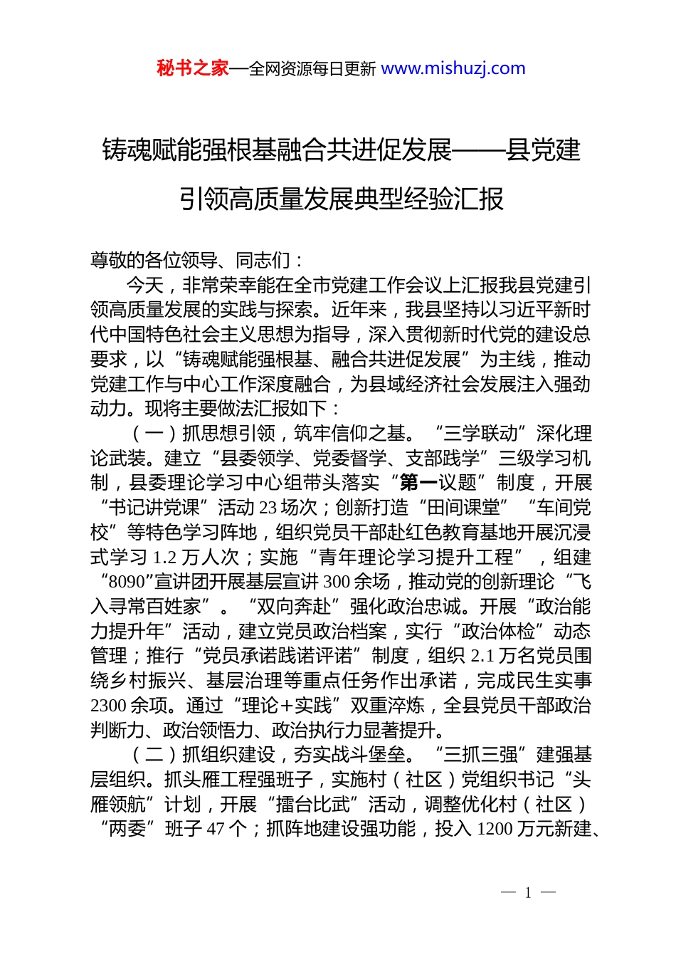 秘书之家—全网资源每日更新 www.mishuzj.com铸魂赋能强根基融合共进促发展——县党建引领高质量发展典型经验汇报尊敬的各位领导、同志们:今天,非常荣幸能在全市党建工作会议上汇报我县党建引领高质量发展的实践与探索。近年来,我县坚持以习近平新时代中国特色社会主义思想为指导,深入贯彻新时代党的建设总要求,以“铸魂赋能强根基、融合共进促发展”为主线,推动党建工作与中心工作深度融合,为县域经济社会发展注入强劲动力。现将主要做法汇报如下:(一)抓思想引领,筑牢信仰之基。“三学联动”深化理论武装。建立“县委领学、党委督学、支部践学”三级学习机制,县委理论学习中心组带头落实“第一议题”制度,开展“书记讲党课”活动 23 场次;创新打造“田间课堂”“车间党校”等特色学习阵地,组织党员干部赴红色教育基地开展沉浸式学习 1.2 万人次;实施“青年理论学习提升工程”,组建“8090”宣讲团开展基层宣讲 300 余场,推动党的创新理论“飞入寻常百姓家”。“双向奔赴”强化政治忠诚。开展“政治能力提升年”活动,建立党员政治档案,实行“政治体检”动态管理;推行“党员承诺践诺评诺”制度,组织 2.1 万名党员围绕乡村振兴、基层治理等重点任务作出承诺,完成民生实事2300 余项。通过“理论+实践”双重淬炼,全县党员干部政治判断力、政治领悟力、政治执行力显著提升。(二)抓组织建设,夯实战斗堡垒。“三抓三强”建强基层组织。抓头雁工程强班子,实施村(社区)党组织书记“头雁领航”计划,开展“擂台比武”活动,调整优化村(社区)“两委”班子 47 个;抓阵地建设强功能,投入 1200 万元新建、— 1 —秘书之家—全网资源每日更新 www.mishuzj.com改扩建党群服务中心 32 个,打造“15 分钟党建服务圈”;抓制度落实强规范,创新“党建+网格”管理模式,建立“三会一课”纪实报备制度,推动组织生活规范化、常态化。“红色引擎”激活发展动能。在产业园区推行“党建+产业链”模式,建立非公企业党组织 28 个,培育党员示范岗 65 个,带动企业研发投入增长 27%;在乡村振兴一线实施“支部建在产业链、党员聚在产业链、群众富在产业链”工程,组建特色产业党支部 15 个,培育党员致富带头人 200 余名,带动农户人均增收1.2 万元。(三)抓队伍管理,锻造过硬铁军。“选育管用”全链条培养干部。实施“年轻干部成长计划”,选派 87 名年轻干部到征地拆迁、信访维稳等一线岗位墩苗历练;建立“导师帮带”机制,组织 120 名科级干部结对帮扶年轻干部;完善干部考核评价体系,推行“红黄蓝”三色预警机制,调整不胜任现职干部 12 名。通过多维度培养,全县干部队伍专业化水平显著提升。“双向培养”激发队伍活力。实施“党员人才双向培养”工程,把业务骨干培养成党员,把党员培养成业务骨干,去年以来发展党员中专业技术人才占比达 45%;开展“党员先锋岗”“党员责任区”创建活动,评选表彰“两优一先”典型 68 个,营造了比学赶超的浓厚氛围。(四)抓融合发展,凝聚奋进合力。“党建+项目”推动产业升级。建立重点项目临时党支部 18 个,实行“一名党员领导干部、一个工作专班、一套推进方案”的“三个一”机制,推动总投资 56 亿元的新能源产业园等 23 个重点项目落地见效;开展“党员技术攻关”行动,攻克技术难题 32 项,获得专利 17项。“党建+民生”增进群众福祉。深化“我为群众办实事”实践活动,组织党员干部结对帮扶困难群众 3200 余户,解决就业、教育、医疗等民生问题 1800 余件;推行“红色物业”管理模式,在老旧小区成立功能性党支部 21 个,改造提升小区环境,— 2 —秘书之家—全网资源每日更新 www.mishuzj.com群众满意度达 98%。(五)抓正风肃纪,涵养政治生态。推动正风反腐一体深化。强化不敢腐的震慑,全年立案查处违纪违法案件 87 件,处分党员干部 92 人;扎紧不能腐的笼子,建立“三重一大”事项监督机制,开展廉政风险排查 12 次,完善制度 23 项;增强不想腐的自觉,开展“以案促改”警示教育活动 45 场次,组织党员干部参观廉政教育基地 5000 余人...