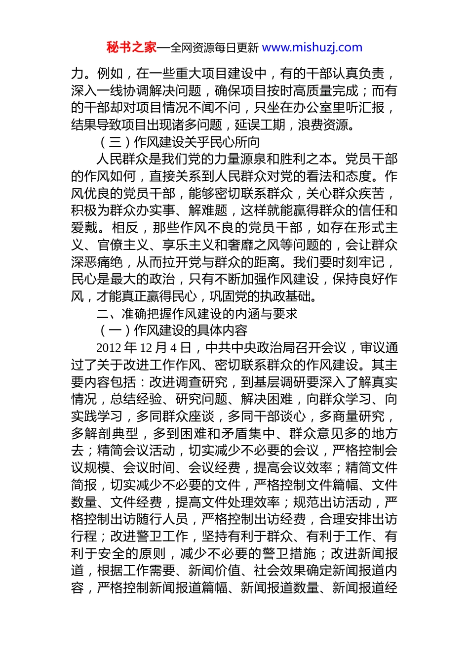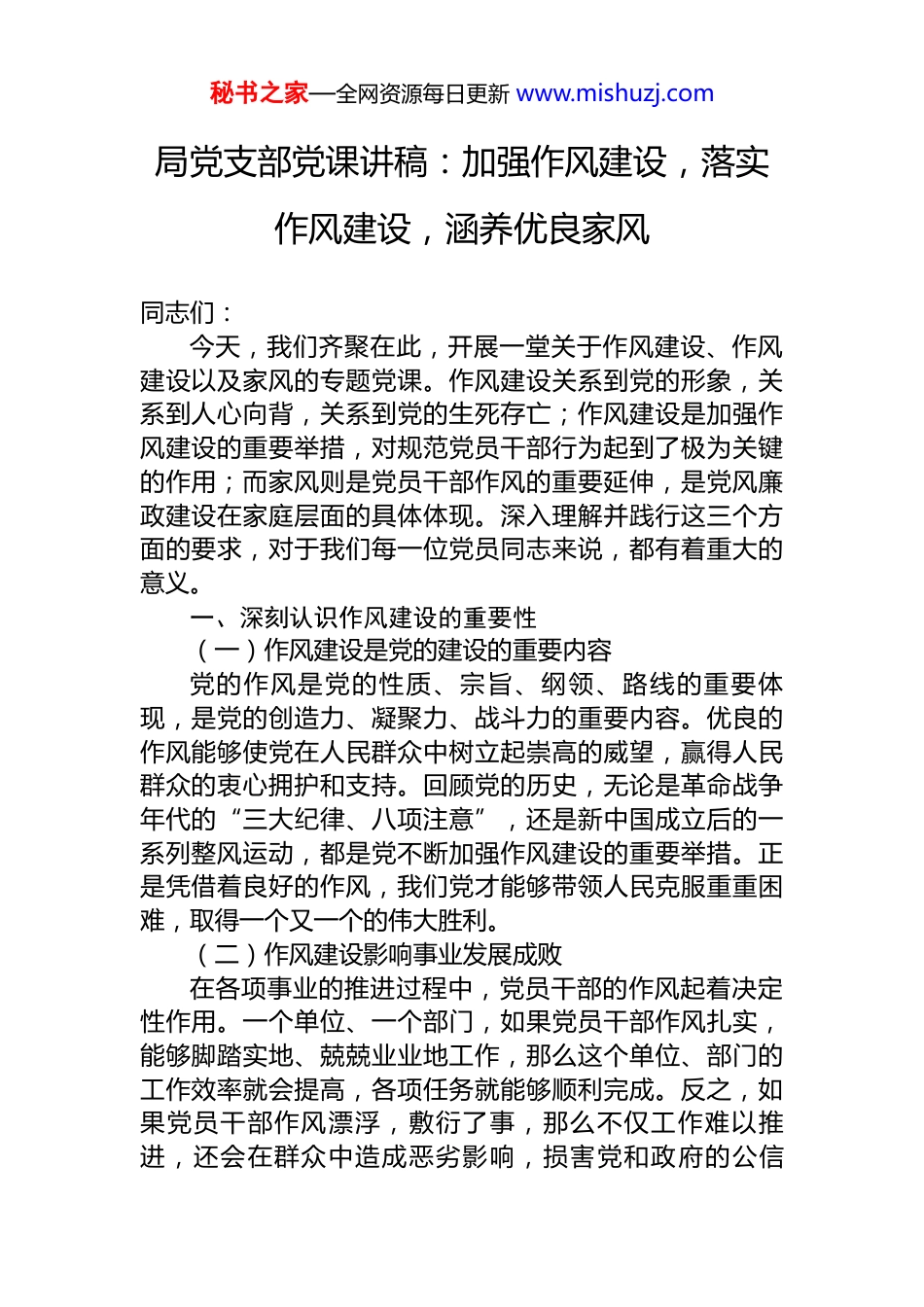 秘书之家—全网资源每日更新 www.mishuzj.com局党支部党课讲稿:加强作风建设,落实作风建设,涵养优良家风同志们:今天,我们齐聚在此,开展一堂关于作风建设、作风建设以及家风的专题党课。作风建设关系到党的形象,关系到人心向背,关系到党的生死存亡;作风建设是加强作风建设的重要举措,对规范党员干部行为起到了极为关键的作用;而家风则是党员干部作风的重要延伸,是党风廉政建设在家庭层面的具体体现。深入理解并践行这三个方面的要求,对于我们每一位党员同志来说,都有着重大的意义。一、深刻认识作风建设的重要性(一)作风建设是党的建设的重要内容党的作风是党的性质、宗旨、纲领、路线的重要体现,是党的创造力、凝聚力、战斗力的重要内容。优良的作风能够使党在人民群众中树立起崇高的威望,赢得人民群众的衷心拥护和支持。回顾党的历史,无论是革命战争年代的“三大纪律、八项注意”,还是新中国成立后的一系列整风运动,都是党不断加强作风建设的重要举措。正是凭借着良好的作风,我们党才能够带领人民克服重重困难,取得一个又一个的伟大胜利。(二)作风建设影响事业发展成败在各项事业的推进过程中,党员干部的作风起着决定性作用。一个单位、一个部门,如果党员干部作风扎实,能够脚踏实地、兢兢业业地工作,那么这个单位、部门的工作效率就会提高,各项任务就能够顺利完成。反之,如果党员干部作风漂浮,敷衍了事,那么不仅工作难以推进,还会在群众中造成恶劣影响,损害党和政府的公信秘书之家—全网资源每日更新 www.mishuzj.com力。例如,在一些重大项目建设中,有的干部认真负责,深入一线协调解决问题,确保项目按时高质量完成;而有的干部却对项目情况不闻不问,只坐在办公室里听汇报,结果导致项目出现诸多问题,延误工期,浪费资源。(三)作风建设关乎民心所向人民群众是我们党的力量源泉和胜利之本。党员干部的作风如何,直接关系到人民群众对党的看法和态度。作风优良的党员干部,能够密切联系群众,关心群众疾苦,积极为群众办实事、解难题,这样就能赢得群众的信任和爱戴。相反,那些作风不良的党员干部,如存在形式主义、官僚主义、享乐主义和奢靡之风等问题的,会让群众深恶痛绝,从而拉开党与群众的距离。我们要时刻牢记,民心是最大的政治,只有不断加强作风建设,保持良好作风,才能真正赢得民心,巩固党的执政基础。二、准确把握作风建设的内涵与要求(一)作风建设的具体内容2012 年 12 月 4 日,中共中央政治局召开会议,审议通过了关于改进工作作风、密切联系群众的作风建设。其主要内容包括:改进调查研究,到基层调研要深入了解真实情况,总结经验、研究问题、解决困难,向群众学习、向实践学习,多同群众座谈,多同干部谈心,多商量研究,多解剖典型,多到困难和矛盾集中、群众意见多的地方去;精简会议活动,切实减少不必要的会议,严格控制会议规模、会议时间、会议经费,提高会议效率;精简文件简报,切实减少不必要的文件,严格控制文件篇幅、文件数量、文件经费,提高文件处理效率;规范出访活动,严格控制出访随行人员,严格控制出访经费,合理安排出访行程;改进警卫工作,坚持有利于群众、有利于工作、有利于安全的原则,减少不必要的警卫措施;改进新闻报道,根据工作需要、新闻价值、社会效果确定新闻报道内容,严格控制新闻报道篇幅、新闻报道数量、新闻报道经秘书之家—全网资源每日更新 www.mishuzj.com费;严格文稿发表,除特殊情况外,个人不发表与工作无关的文稿;厉行节约,严格控制办公经费,节约用电、用水、用纸等办公资源,反对浪费。(二)作风建设的重要意义作风建设的出台,具有极其重要的意义。一是它体现了党对自身建设的高度重视。党清醒地认识到,在长期执政过程中,一些不良作风在党内滋生蔓延,严重影响了党的形象和公信力,因此必须从自身抓起,从改进工作作风、密切联系群众入手,加强党的建设。二是它为党员干部的行为提供了明确的规范。作风建设详细列出了在调查研究、会议活动、文件简报、出访活动、警卫工作、新闻报道、文稿发表、节约资源等方面的具体要求,让党员干部知道什么该做...