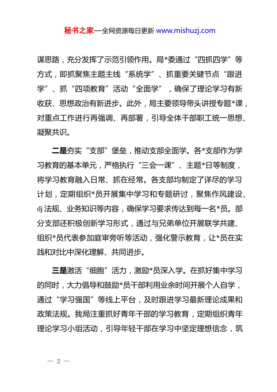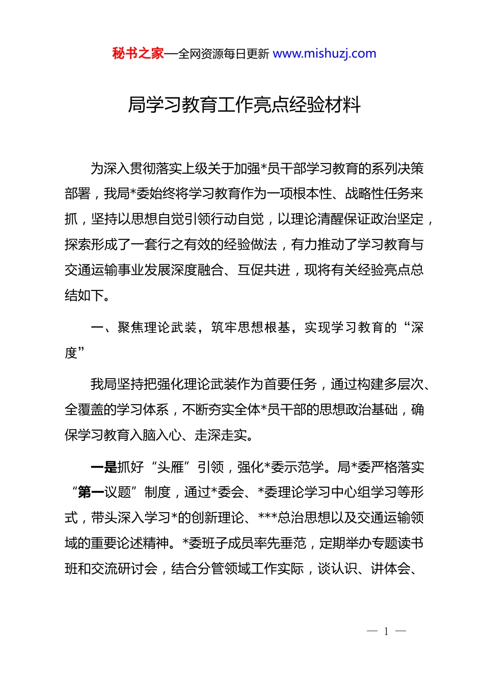 秘书之家—全网资源每日更新 www.mishuzj.com局学习教育工作亮点经验材料为深入贯彻落实上级关于加强*员干部学习教育的系列决策部署,我局*委始终将学习教育作为一项根本性、战略性任务来抓,坚持以思想自觉引领行动自觉,以理论清醒保证政治坚定,探索形成了一套行之有效的经验做法,有力推动了学习教育与交通运输事业发展深度融合、互促共进,现将有关经验亮点总结如下。一、聚焦理论武装,筑牢思想根基,实现学习教育的“深度”我局坚持把强化理论武装作为首要任务,通过构建多层次、全覆盖的学习体系,不断夯实全体*员干部的思想政治基础,确保学习教育入脑入心、走深走实。一是抓好“头雁”引领,强化*委示范学。局*委严格落实“第一议题”制度,通过*委会、*委理论学习中心组学习等形式,带头深入学习*的创新理论、***总治思想以及交通运输领域的重要论述精神。*委班子成员率先垂范,定期举办专题读书班和交流研讨会,结合分管领域工作实际,谈认识、讲体会、— 1 —秘书之家—全网资源每日更新 www.mishuzj.com谋思路,充分发挥了示范引领作用。局*委通过“四抓四学”等方式,即抓聚焦主题主线“系统学”、抓重要关键节点“跟进学”、抓“四项教育”活动“全面学”,确保了理论学习有新收获、思想政治有新进步。此外,局主要领导带头讲授专题*课,对重点工作进行再强调、再部署,引导全体干部职工统一思想、凝聚共识。二是夯实“支部”堡垒,推动支部全面学。各*支部作为学习教育的基本单元,严格执行“三会一课”、主题*日等制度,将学习教育融入日常、抓在经常。各支部均制定了详尽的学习计划,定期组织*员开展集中学习和专题研讨,聚焦作风建设、dj 法规、业务知识等内容,确保学习要求传达到每一名*员。部分支部还积极创新学习形式,通过与兄弟单位开展联学共建、组织*员代表参加庭审旁听等活动,强化警示教育,让*员在实践和对比中深化理解、共同进步。三是激活“细胞”活力,激励*员深入学。在抓好集中学习的同时,大力倡导和鼓励*员干部利用业余时间开展个人自学,通过“学习强国”等线上平台,及时跟进学习最新理论成果和政策法规。我局注重抓好青年干部的学习教育,定期组织青年理论学习小组活动,引导年轻干部在学习中坚定理想信念,筑— 2 —秘书之家—全网资源每日更新 www.mishuzj.com牢廉洁自律的思想防线。通过广泛的学习研讨,全局*员干部,特别是青年干部纷纷表示,要以纪律规矩为标尺,在守土有责、服务发展的征程中书写无愧于时代的篇章,真正做到内化于心、外化于行。二、聚焦问题导向,贯穿查改一体,彰显学习教育的“力度”我局坚持将发现问题、解决问题作为学习教育的出发点和落脚点,一体推进学、查、改各环节,以动真碰硬的决心和标本兼治的举措,切实把“问题清单”转化为人民群众满意的“成效清单”。一是以深挖细查为基础,精准锁定问题。我局把调查研究作为学习教育的重要环节,局领导班子带头走好新时代*的群众路线,深入基层、深入企业、深入一线,通过开展“我进企业换角色”等活动,面对面听取意见、实打实了解诉求。在学习教育期间,全局通过多种渠道累计收集各类意见建议 591 条,梳理出群众急难愁盼问题 364 个,为后续整改提供了精确靶向。同时,结合上级巡视整改、行业专项整治等工作,突出重点领域和“关键少数”,全方位、多角度查摆问题,共查摆出各类问题 51 项,力求见人见事见思想。— 3 —秘书之家—全网资源每日更新 www.mishuzj.com二是以专项整治为突破,强力推动整改。针对调研中发现的行业乱象和群众反映强烈的突出问题,我局以 zt 教育为抓手,果断开展交通建设领域乱象整治专项行动。例如,针对部分区域存在的非法营运“黑车”问题,我局联合多部门开展联动执法,形成高压态势,查处了一批典型案件,有效净化了市场环境。在整治出租车行业乱象方面,采取了健全规章制度、运用“互联网+”监管、改善车容车貌、提升服务水平、加强执法监管等“八大措施”,推动行业风气实现根本性好转,解决了市民出行中的痛点难点问题。三是以建章立制为保障,实现长效常治。在集中解决突出问题的同时,我局更加注重...