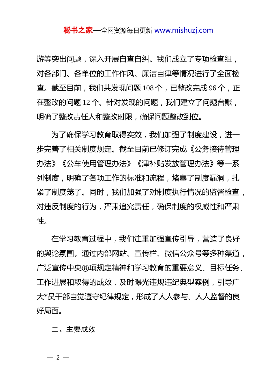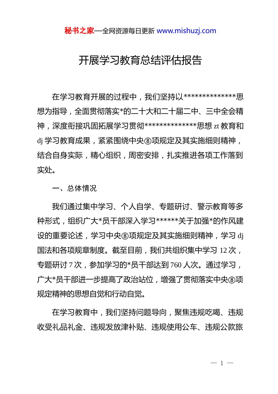 秘书之家—全网资源每日更新 www.mishuzj.com开展学习教育总结评估报告在学习教育开展的过程中,我们坚持以**************思想为指导,全面贯彻落实*的二十大和二十届二中、三中全会精神,深度衔接巩固拓展学习贯彻**************思想 zt 教育和dj 学习教育成果,紧紧围绕中央⑧项规定及其实施细则精神,结合自身实际,精心组织,周密安排,扎实推进各项工作落到实处。一、总体情况我们通过集中学习、个人自学、专题研讨、警示教育等多种形式,组织广大*员干部深入学习******关于加强*的作风建设的重要论述,学习中央⑧项规定及其实施细则精神,学习 dj国法和各项规章制度。截至目前,我们共组织集中学习 12 次,专题研讨 7 次,参加学习的*员干部达到 760 人次。通过学习,广大*员干部进一步提高了政治站位,增强了贯彻落实中央⑧项规定精神的思想自觉和行动自觉。在学习教育中,我们坚持问题导向,聚焦违规吃喝、违规收受礼品礼金、违规发放津补贴、违规使用公车、违规公款旅— 1 —秘书之家—全网资源每日更新 www.mishuzj.com游等突出问题,深入开展自查自纠。我们成立了专项检查组,对各部门、各单位的工作作风、廉洁自律等情况进行了全面检查。截至目前,我们共发现问题 108 个,已整改完成 96 个,正在整改的问题 12 个。针对发现的问题,我们建立了问题台账,明确了整改责任人和整改时限,确保问题整改到位。为了确保学习教育取得实效,我们加强了制度建设,进一步完善了相关制度规定。截至目前已修订完成《公务接待管理办法》《公车使用管理办法》《津补贴发放管理办法》等一系列制度,明确了各项工作的标准和流程,堵塞了制度漏洞,扎紧了制度笼子。同时,我们加强了对制度执行情况的监督检查,对违反制度的行为,严肃追究责任,确保制度的权威性和严肃性。在学习教育过程中,我们注重加强宣传引导,营造了良好的舆论氛围。通过内部网站、宣传栏、微信公众号等多种渠道,广泛宣传中央⑧项规定精神和学习教育的重要意义、目标任务、工作进展和取得的成效,及时曝光违规违纪典型案例,引导广大*员干部自觉遵守纪律规定,形成了人人参与、人人监督的良好局面。二、主要成效— 2 —秘书之家—全网资源每日更新 www.mishuzj.com通过为期五个月的学习教育,我单位在政治生态、工作作风、服务效能等方面均取得了显著成效。(一)*的政治建设得到全面加强,政治生态呈现新气象。全体*员干部的政治判断力、政治领悟力、政治执行力显著增强,“四个意识”更加牢固,“四个自信”更加坚定,“两个维护”更加自觉。纪律规矩意识深入人心,风清气正、干事创业的良好政治生态得到进一步巩固和发展。学习教育期间,本单位*员干部无一例违纪违法案件发生。(二)形式主义官僚主义得到纠治,工作效能得到新提升“文山会海”现象得到有效遏制,2025 年上半年,全局性会议数量同比减少 22%,印发各类文件同比精简 18%。全系统上下大兴调查研究之风,领导干部下基层调研时间平均增加 30%以上,形成高质量调研报告 20 余篇。厉行节约、反对浪费成为普遍 自 觉 。 2025 年 “ 三 公 ” 经 费 预 算 在 上 年 基 础 上 再 压 减12.8%,其中公务接待费压减 16%,以“紧日子”换取了群众的“好日子”。(三)服务效能不断提升,群众满意度实现新跃升。坚持把学习教育的落脚点放在为民办实事上。门好进、脸好看、事难办现象显著减少,“马上就办、真抓实干”的作风得到弘扬。— 3 —秘书之家—全网资源每日更新 www.mishuzj.com窗口单位和服务行业服务态度、办事效率得到群众认可度提升。据第三方机构在 7 月中旬开展的随机抽样调查显示,市民对政务服务工作的总体满意度达到 96.8 分,较年初提升了 4.5 个百分点,创历史新高。(四)宗旨意识不断强化,*群干群关系更加密切。*员干部更加自觉地践行以人民为中心的发展思想,把群众满意作为工作的出发点和落脚点。深入基层、服务群众、解决急难愁盼问题的主动性增强。作风的持续好转,特别是对群众反映强烈的不正之风的有效整治,让群众切实感受到身边的变化,增进了对*和政府的...