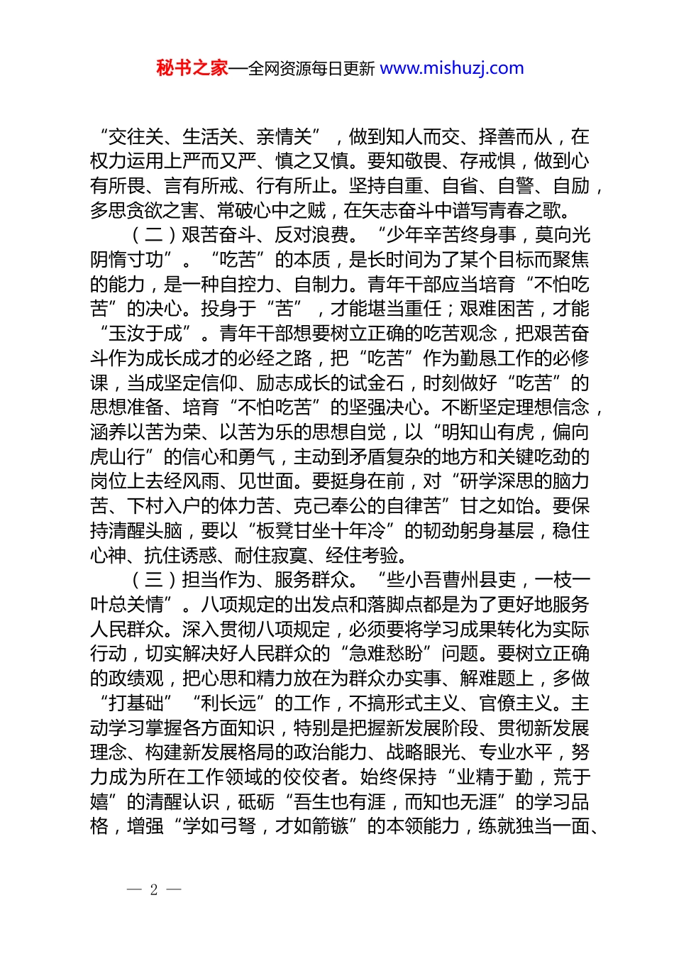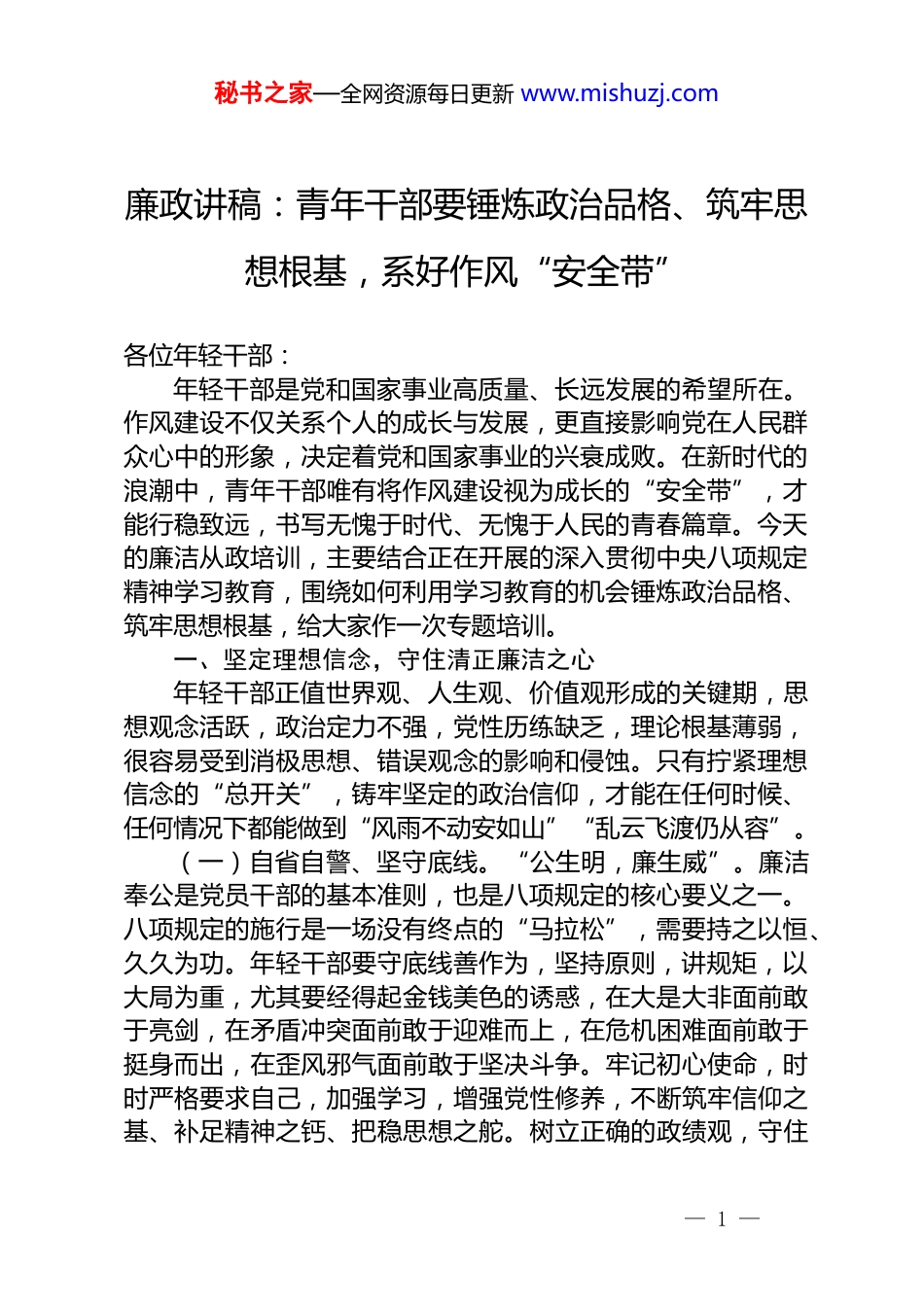 秘书之家—全网资源每日更新 www.mishuzj.com廉政讲稿:青年干部要锤炼政治品格、筑牢思想根基,系好作风“安全带”各位年轻干部:年轻干部是党和国家事业高质量、长远发展的希望所在。作风建设不仅关系个人的成长与发展,更直接影响党在人民群众心中的形象,决定着党和国家事业的兴衰成败。在新时代的浪潮中,青年干部唯有将作风建设视为成长的“安全带”,才能行稳致远,书写无愧于时代、无愧于人民的青春篇章。今天的廉洁从政培训,主要结合正在开展的深入贯彻中央八项规定精神学习教育,围绕如何利用学习教育的机会锤炼政治品格、筑牢思想根基,给大家作一次专题培训。一、坚定理想信念,守住清正廉洁之心年轻干部正值世界观、人生观、价值观形成的关键期,思想观念活跃,政治定力不强,党性历练缺乏,理论根基薄弱,很容易受到消极思想、错误观念的影响和侵蚀。只有拧紧理想信念的“总开关”,铸牢坚定的政治信仰,才能在任何时候、任何情况下都能做到“风雨不动安如山”“乱云飞渡仍从容”。(一)自省自警、坚守底线。“公生明,廉生威”。廉洁奉公是党员干部的基本准则,也是八项规定的核心要义之一。八项规定的施行是一场没有终点的“马拉松”,需要持之以恒、久久为功。年轻干部要守底线善作为,坚持原则,讲规矩,以大局为重,尤其要经得起金钱美色的诱惑,在大是大非面前敢于亮剑,在矛盾冲突面前敢于迎难而上,在危机困难面前敢于挺身而出,在歪风邪气面前敢于坚决斗争。牢记初心使命,时时严格要求自己,加强学习,增强党性修养,不断筑牢信仰之基、补足精神之钙、把稳思想之舵。树立正确的政绩观,守住— 1 —秘书之家—全网资源每日更新 www.mishuzj.com“交往关、生活关、亲情关”,做到知人而交、择善而从,在权力运用上严而又严、慎之又慎。要知敬畏、存戒惧,做到心有所畏、言有所戒、行有所止。坚持自重、自省、自警、自励,多思贪欲之害、常破心中之贼,在矢志奋斗中谱写青春之歌。(二)艰苦奋斗、反对浪费。“少年辛苦终身事,莫向光阴惰寸功”。“吃苦”的本质,是长时间为了某个目标而聚焦的能力,是一种自控力、自制力。青年干部应当培育“不怕吃苦”的决心。投身于“苦”,才能堪当重任;艰难困苦,才能“玉汝于成”。青年干部想要树立正确的吃苦观念,把艰苦奋斗作为成长成才的必经之路,把“吃苦”作为勤恳工作的必修课,当成坚定信仰、励志成长的试金石,时刻做好“吃苦”的思想准备、培育“不怕吃苦”的坚强决心。不断坚定理想信念,涵养以苦为荣、以苦为乐的思想自觉,以“明知山有虎,偏向虎山行”的信心和勇气,主动到矛盾复杂的地方和关键吃劲的岗位上去经风雨、见世面。要挺身在前,对“研学深思的脑力苦、下村入户的体力苦、克己奉公的自律苦”甘之如饴。要保持清醒头脑,要以“板凳甘坐十年冷”的韧劲躬身基层,稳住心神、抗住诱惑、耐住寂寞、经住考验。(三)担当作为、服务群众。“些小吾曹州县吏,一枝一叶总关情”。八项规定的出发点和落脚点都是为了更好地服务人民群众。深入贯彻八项规定,必须要将学习成果转化为实际行动,切实解决好人民群众的“急难愁盼”问题。要树立正确的政绩观,把心思和精力放在为群众办实事、解难题上,多做“打基础”“利长远”的工作,不搞形式主义、官僚主义。主动学习掌握各方面知识,特别是把握新发展阶段、贯彻新发展理念、构建新发展格局的政治能力、战略眼光、专业水平,努力成为所在工作领域的佼佼者。始终保持“业精于勤,荒于嬉”的清醒认识,砥砺“吾生也有涯,而知也无涯”的学习品格,增强“学如弓弩,才如箭镞”的本领能力,练就独当一面、— 2 —秘书之家—全网资源每日更新 www.mishuzj.com胜人一筹的真本领、硬功夫,到新时代新天地中去施展抱负、建功立业。始终牢记全心全意为人民服务的宗旨,以群众满意不满意作为衡量工作的标准,不断增强人民群众的获得感、幸福感、安全感,用实际行动诠释党员干部的初心和使命,让“初心”在服务群众的实践中熠熠生辉。二、坚定为民公心,分清权力赋能之别“位卑未泯济民志,权重不移公仆心。”少数干部在手握一定权力后“沾沾自喜”,面对...