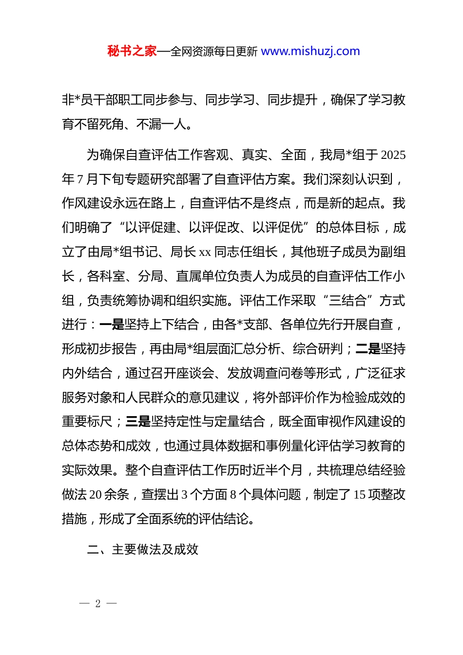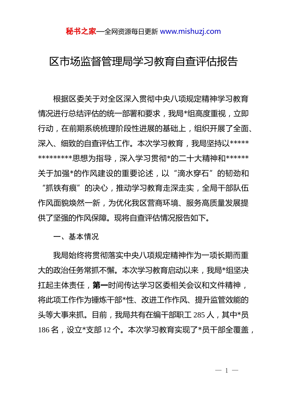 秘书之家—全网资源每日更新 www.mishuzj.com区市场监督管理局学习教育自查评估报告根据区委关于对全区深入贯彻中央八项规定精神学习教育情况进行总结评估的统一部署和要求,我局*组高度重视,立即行动,在前期系统梳理阶段性进展的基础上,组织开展了全面、深入、细致的自查评估工作。本次学习教育,我局坚持以**************思想为指导,深入学习贯彻*的二十大精神和******关于加强*的作风建设的重要论述,以“滴水穿石”的韧劲和“抓铁有痕”的决心,推动学习教育走深走实,全局干部队伍作风面貌焕然一新,为优化我区营商环境、服务高质量发展提供了坚强的作风保障。现将自查评估情况报告如下。一、基本情况我局始终将贯彻落实中央八项规定精神作为一项长期而重大的政治任务常抓不懈。本次学习教育启动以来,我局*组坚决扛起主体责任,第一时间传达学习区委相关会议和文件精神,将此项工作作为锤炼干部*性、改进工作作风、提升监管效能的头等大事来抓。目前,我局共有在编干部职工 285 人,其中*员186 名,设立*支部 12 个。本次学习教育实现了*员干部全覆盖,— 1 —秘书之家—全网资源每日更新 www.mishuzj.com非*员干部职工同步参与、同步学习、同步提升,确保了学习教育不留死角、不漏一人。为确保自查评估工作客观、真实、全面,我局*组于 2025年 7 月下旬专题研究部署了自查评估方案。我们深刻认识到,作风建设永远在路上,自查评估不是终点,而是新的起点。我们明确了“以评促建、以评促改、以评促优”的总体目标,成立了由局*组书记、局长 xx 同志任组长,其他班子成员为副组长,各科室、分局、直属单位负责人为成员的自查评估工作小组,负责统筹协调和组织实施。评估工作采取“三结合”方式进行:一是坚持上下结合,由各*支部、各单位先行开展自查,形成初步报告,再由局*组层面汇总分析、综合研判;二是坚持内外结合,通过召开座谈会、发放调查问卷等形式,广泛征求服务对象和人民群众的意见建议,将外部评价作为检验成效的重要标尺;三是坚持定性与定量结合,既全面审视作风建设的总体态势和成效,也通过具体数据和事例量化评估学习教育的实际效果。整个自查评估工作历时近半个月,共梳理总结经验做法 20 余条,查摆出 3 个方面 8 个具体问题,制定了 15 项整改措施,形成了全面系统的评估结论。二、主要做法及成效— 2 —秘书之家—全网资源每日更新 www.mishuzj.com学习教育开展以来,我局紧扣主题,创新载体,聚焦实效,以“五个坚持”为抓手,推动作风建设往深里走、往实里走、往心里走,取得了显著成效。(一)坚持高位统筹,强化组织领导,确保责任落实“一盘棋”作风建设,关键在领导,核心在责任。虽然我局未专门成立学习教育领导小组,但局*组自觉将主体责任扛在肩上、抓在手上,形成了*组统一领导、主要领导亲自抓、班子成员分工负责、各级*组织齐抓共管的领导格局,确保了学习教育方向不偏、力度不减。一是*组示范引领。局*组书记、局长 xx 同志认真履行“第一责任人”职责,对学习教育亲自部署、亲自过问、亲自协调、亲自督办。学习教育期间,局*组先后召开 6 次专题会议,研究制定实施方案,听取进展汇报,分析解决存在问题。班子成员以身作则、率先垂范,带头参加学习研讨,带头查摆自身问题,带头深入基层一线开展调研,以“关键少数”的示范行动带动了“绝大多数”的积极跟进,形成了“头雁高飞、群雁齐追”的生动局面。— 3 —秘书之家—全网资源每日更新 www.mishuzj.com二是压实责任链条。我局将学习教育成效纳入年度 dj 工作考核和干部评优评先的重要内容,与业务工作同部署、同落实、同检查、同考核。年初,局*组与各科室、分局、直属单位签订了《*风廉政建设责任书》,将贯彻落实中央八项规定精神作为硬性指标,层层传导压力,逐级压实责任,确保每一个基层单元都成为作风建设的坚强堡 g 垒。三是强化宣传引导。充分利用我局“xx 市场监管”微信公众号这一新媒体平台,开设“作风建设永远在路上”学习专栏,及时传达上级精神,宣传政策法规,推广经验做法,曝光典型案例。学习教育期间,共推送相关学习...