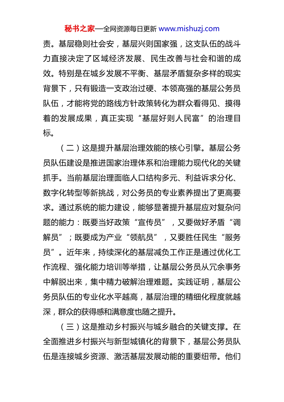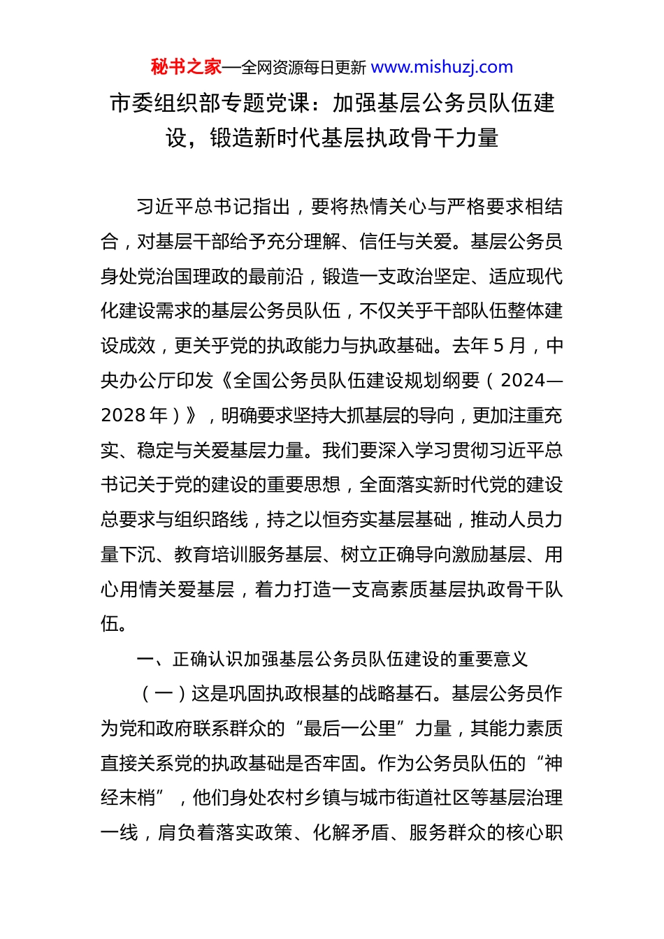 秘书之家—全网资源每日更新 www.mishuzj.com市委组织部专题党课:加强基层公务员队伍建设,锻造新时代基层执政骨干力量 习近平总书记指出,要将热情关心与严格要求相结合,对基层干部给予充分理解、信任与关爱。基层公务员身处党治国理政的最前沿,锻造一支政治坚定、适应现代化建设需求的基层公务员队伍,不仅关乎干部队伍整体建设成效,更关乎党的执政能力与执政基础。去年 5 月,中央办公厅印发《全国公务员队伍建设规划纲要(2024—2028 年)》,明确要求坚持大抓基层的导向,更加注重充实、稳定与关爱基层力量。我们要深入学习贯彻习近平总书记关于党的建设的重要思想,全面落实新时代党的建设总要求与组织路线,持之以恒夯实基层基础,推动人员力量下沉、教育培训服务基层、树立正确导向激励基层、用心用情关爱基层,着力打造一支高素质基层执政骨干队伍。一、正确认识加强基层公务员队伍建设的重要意义(一)这是巩固执政根基的战略基石。基层公务员作为党和政府联系群众的“最后一公里”力量,其能力素质直接关系党的执政基础是否牢固。作为公务员队伍的“神经末梢”,他们身处农村乡镇与城市街道社区等基层治理一线,肩负着落实政策、化解矛盾、服务群众的核心职秘书之家—全网资源每日更新 www.mishuzj.com责。基层稳则社会安,基层兴则国家强,这支队伍的战斗力直接决定了区域经济发展、民生改善与社会和谐的成效。特别是在城乡发展不平衡、基层矛盾复杂多样的现实背景下,只有锻造一支政治过硬、本领高强的基层公务员队伍,才能将党的路线方针政策转化为群众看得见、摸得着的发展成果,真正实现“基层好则人民富”的治理目标。(二)这是提升基层治理效能的核心引擎。基层公务员队伍建设是推进国家治理体系和治理能力现代化的关键抓手。当前基层治理面临人口结构多元、利益诉求分化、数字化转型等新挑战,对公务员的专业素养提出了更高要求。通过系统的能力建设,能够显著提升基层应对复杂问题的能力:既要当好政策“宣传员”,又要做好矛盾“调解员”;既要成为产业“领航员”,又要胜任民生“服务员”。近年来,持续深化的基层减负工作正是通过优化工作流程、强化能力培训等举措,让基层公务员从冗余事务中解脱出来,集中精力破解治理难题。实践证明,基层公务员队伍的专业化水平越高,基层治理的精细化程度就越深,群众的获得感和满意度也随之提升。(三)这是推动乡村振兴与城乡融合的关键支撑。在全面推进乡村振兴与新型城镇化的背景下,基层公务员队伍是连接城乡资源、激活基层发展动能的重要纽带。他们秘书之家—全网资源每日更新 www.mishuzj.com既是农村产业发展的规划者,通过培育特色农业、推动三产融合带领群众致富;也是城乡公共服务的供给者,在教育医疗、养老社保等领域促进资源均衡配置。特别是在巩固脱贫攻坚成果的过渡期,基层公务员需要具备更强的政策理解能力和资源整合能力,精准落实帮扶措施,防止返贫致贫。通过专项招录、定向培养等方式加强基层队伍建设,能够为乡村振兴注入“人才活水”,推动形成工农互促、城乡互补的新型城乡关系。(四)这是锻造服务型政府形象的实践窗口。基层公务员的言行举止直接影响群众对政府的信任度,其队伍建设成效关乎政府公信力的塑造。在“放管服”改革深入推进的今天,基层公务员的服务意识和办事效率成为衡量服务型政府建设的重要标尺。通过职业道德教育强化为民情怀,通过业务培训提升服务效能,通过激励机制激发工作热情,才能让基层公务员真正做到“权为民所用、情为民所系、利为民所谋”。当每一名基层公务员都能以专业的素养回应群众期待,以务实的作风解决民生难题时,政府与群众之间的“连心桥”将更加牢固,社会共识的凝聚也将更加顺畅。二、充分肯定我市基层公务员队伍建设成效(一)强化政治把关,筑牢思想根基。我们始终将政治建设贯穿基层公务员队伍建设全过程,在“选”上严把秘书之家—全网资源每日更新 www.mishuzj.com政治关,在“育”上突出政治能力,在“管”上注重政治训练,在“用”上坚持政治标准,对政治上不合格者坚决挡在门外。通过深入实施凝心铸魂工程,建立健全“第一...