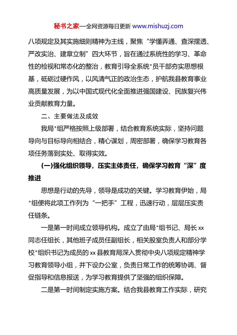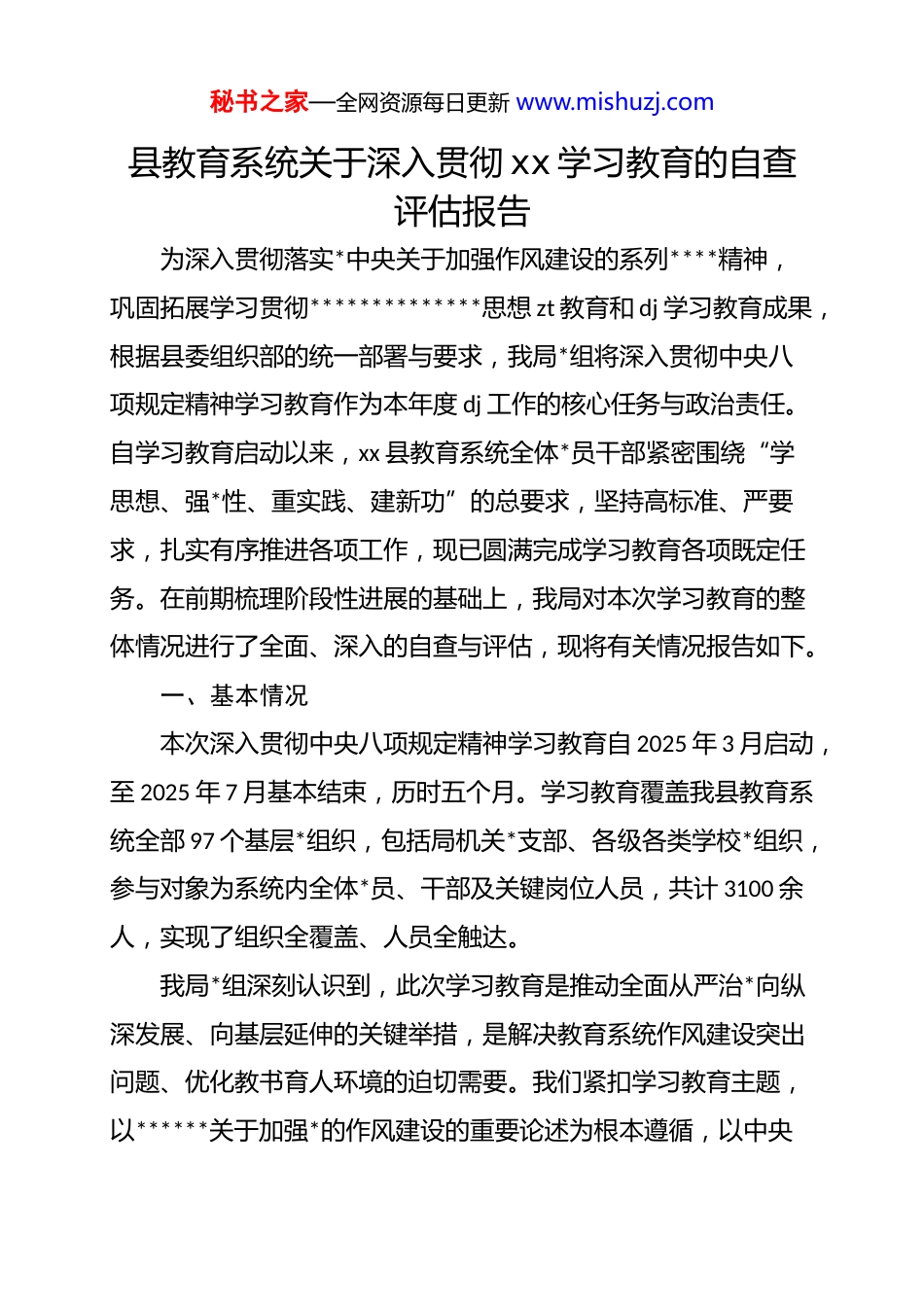 秘书之家—全网资源每日更新 www.mishuzj.com县教育系统关于深入贯彻 xx 学习教育的自查评估报告为深入贯彻落实*中央关于加强作风建设的系列****精神,巩固拓展学习贯彻**************思想 zt 教育和 dj 学习教育成果,根据县委组织部的统一部署与要求,我局*组将深入贯彻中央八项规定精神学习教育作为本年度 dj 工作的核心任务与政治责任。自学习教育启动以来,xx 县教育系统全体*员干部紧密围绕“学思想、强*性、重实践、建新功”的总要求,坚持高标准、严要求,扎实有序推进各项工作,现已圆满完成学习教育各项既定任务。在前期梳理阶段性进展的基础上,我局对本次学习教育的整体情况进行了全面、深入的自查与评估,现将有关情况报告如下。一、基本情况本次深入贯彻中央八项规定精神学习教育自 2025 年 3 月启动,至 2025 年 7 月基本结束,历时五个月。学习教育覆盖我县教育系统全部 97 个基层*组织,包括局机关*支部、各级各类学校*组织,参与对象为系统内全体*员、干部及关键岗位人员,共计 3100 余人,实现了组织全覆盖、人员全触达。我局*组深刻认识到,此次学习教育是推动全面从严治*向纵深发展、向基层延伸的关键举措,是解决教育系统作风建设突出问题、优化教书育人环境的迫切需要。我们紧扣学习教育主题,以******关于加强*的作风建设的重要论述为根本遵循,以中央秘书之家—全网资源每日更新 www.mishuzj.com八项规定及其实施细则精神为主线,聚焦“学懂弄通、查深摆透、严改实治、建章立制”四大环节,旨在通过系统性的学习、革命性的检视和常态化的整治,教育引导全系统*员干部夯实思想根基,砥砺过硬作风,以风清气正的政治生态,护航我县教育事业高质量发展,为以中国式现代化全面推进强国建设、民族复兴伟业贡献教育力量。二、主要做法及成效我局*组严格按照上级部署,结合教育系统实际,坚持问题导向与目标导向相结合,精心谋划,周密部署,确保学习教育各项任务落到实处、取得实效。(一)强化组织领导,压实主体责任,确保学习教育“深”度推进思想是行动的先导,领导是成功的关键。学习教育伊始,局*组便将此项工作列为“一把手”工程,迅速行动,层层压实责任链条。一是第一时间成立领导机构。成立了由局*组书记、局长 xx同志任组长,其他班子成员任副组长,相关股室负责人和部分学校*组织书记为成员的 xx 县教育局深入贯彻中央八项规定精神学习教育领导小组,并下设办公室,负责日常工作的统筹协调、督促指导和信息报送,为学习教育提供了坚强的组织保障。二是第一时间制定实施方案。结合我县教育工作实际,研究秘书之家—全网资源每日更新 www.mishuzj.com制定了《xx 县教育局关于深入贯彻中央八项规定精神学习教育的实施方案》,明确了学习教育的指导思想、目标任务、方法步骤、时间节点和工作要求,绘制了详尽的“路线图”和“时间表”,使全系统各单位开展工作有章可循、有据可依。三是第一时间进行动员部署。于 3 月初组织召开了全县教育系统动员部署大会,局*组书记 xx 同志作动员讲话,深刻阐述了学习教育的重大意义,并对各项工作任务进行了全面部署。会议要求全系统各级*组织和广大*员干部必须站在政治和全局的高度,切实增强责任感、使命感和紧迫感,以最高的标准、最严的要求投入到学习教育中来。四是第一时间构建责任体系。建立了“局*组—学校(单位)*组织—*支部—*员干部”四级联动的责任体系。局*组班子成员根据分工,对分管领域和联系学校的学习教育负总责,定期深入基层开展调研督导,参加并指导联系单位的专题学习和组织生活会。全系统各学校*组织书记作为第一责任人,亲自抓、负总责,形成了主要领导带头抓、分管领导具体抓、一级抓一级、层层抓落实的良好工作格局。整个学习教育期间,局领导班子成员深入基层指导 210 余次,有效传导了压力,激发了动力。(二)创新学习研讨,筑牢思想根基,确保理论武装“厚”度彰显我局坚持将学习贯穿始终,聚焦“学懂弄通”核心目标,采秘书之家—全网资源每日更新 www.mishuzj.com取“线上+线下”、“集中+自学”、“理论+实践”相结合的多元化模式,持续推动理论...