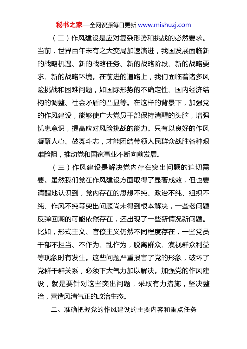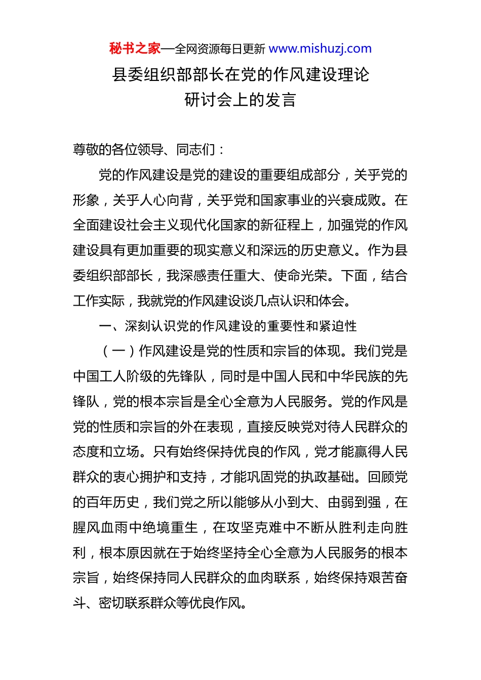 秘书之家—全网资源每日更新 www.mishuzj.com县委组织部部长在党的作风建设理论研讨会上的发言 尊敬的各位领导、同志们:党的作风建设是党的建设的重要组成部分,关乎党的形象,关乎人心向背,关乎党和国家事业的兴衰成败。在全面建设社会主义现代化国家的新征程上,加强党的作风建设具有更加重要的现实意义和深远的历史意义。作为县委组织部部长,我深感责任重大、使命光荣。下面,结合工作实际,我就党的作风建设谈几点认识和体会。一、深刻认识党的作风建设的重要性和紧迫性(一)作风建设是党的性质和宗旨的体现。我们党是中国工人阶级的先锋队,同时是中国人民和中华民族的先锋队,党的根本宗旨是全心全意为人民服务。党的作风是党的性质和宗旨的外在表现,直接反映党对待人民群众的态度和立场。只有始终保持优良的作风,党才能赢得人民群众的衷心拥护和支持,才能巩固党的执政基础。回顾党的百年历史,我们党之所以能够从小到大、由弱到强,在腥风血雨中绝境重生,在攻坚克难中不断从胜利走向胜利,根本原因就在于始终坚持全心全意为人民服务的根本宗旨,始终保持同人民群众的血肉联系,始终保持艰苦奋斗、密切联系群众等优良作风。秘书之家—全网资源每日更新 www.mishuzj.com(二)作风建设是应对复杂形势和挑战的必然要求。当前,世界百年未有之大变局加速演进,我国发展面临新的战略机遇、新的战略任务、新的战略阶段、新的战略要求、新的战略环境。在前进的道路上,我们面临着诸多风险挑战和困难问题,如国际形势的不确定性、国内经济结构的调整、社会矛盾的凸显等。在这样的背景下,加强党的作风建设,能够使广大党员干部保持清醒的头脑,增强忧患意识,提高应对风险挑战的能力。只有以良好的作风凝聚人心、鼓舞斗志,才能团结带领人民群众战胜各种艰难险阻,推动党和国家事业不断向前发展。(三)作风建设是解决党内存在突出问题的迫切需要。虽然我们党在作风建设方面取得了显著成效,但也要清醒地认识到,党内存在的思想不纯、政治不纯、组织不纯、作风不纯等突出问题尚未得到根本解决,一些老问题反弹回潮的可能依然存在,还出现了一些新情况新问题。比如,形式主义、官僚主义仍然不同程度存在,一些党员干部不担当、不作为、乱作为,脱离群众、漠视群众利益等现象时有发生。这些问题严重损害了党的形象,破坏了党群干群关系,必须下大气力加以解决。加强党的作风建设,就是要针对这些突出问题,采取有力措施,坚决整治,营造风清气正的政治生态。二、准确把握党的作风建设的主要内容和重点任务秘书之家—全网资源每日更新 www.mishuzj.com(一)持之以恒纠治“四风”。“四风”问题违背我们党的性质和宗旨,是当前群众深恶痛绝、反映最强烈的问题,也是损害党群干群关系的重要根源。我们要把纠治形式主义、官僚主义摆在更加突出的位置,聚焦重点领域和关键环节,深入查找问题表现,精准发力、靶向治疗。一方面,要坚决整治文山会海、过度留痕、督查检查考核过多过频等加重基层负担的问题,让基层干部有更多时间和精力抓落实、促发展。另一方面,要着力解决对群众诉求推诿扯皮、对工作不担当不作为等官僚主义问题,树立真抓实干、为民服务的良好形象。同时,要持续整治享乐主义、奢靡之风,防止反弹回潮。(二)加强党员干部的理想信念教育。理想信念是共产党人精神上的“钙”,没有理想信念,理想信念不坚定,精神上就会“缺钙”,就会得“软骨病”。加强党的作风建设,必须把坚定理想信念作为首要任务,教育引导广大党员干部牢记党的宗旨,坚定对马克思主义的信仰、对中国特色社会主义和共产主义的信念。要通过开展主题教育、专题培训、党性锻炼等活动,加强党员干部的思想政治教育,使其在思想上、行动上始终与党中央保持高度一致。要弘扬伟大建党精神,传承红色基因,赓续红色血脉,让党员干部从党的百年奋斗历程中汲取智慧和力量,坚定理想信念,增强党性修养。秘书之家—全网资源每日更新 www.mishuzj.com(三)密切党同人民群众的血肉联系。人民群众是我们党的力量源泉和胜利之本。加强党的作风建设,核心问题是保持党同人民群众的血肉联系。我们要始终...