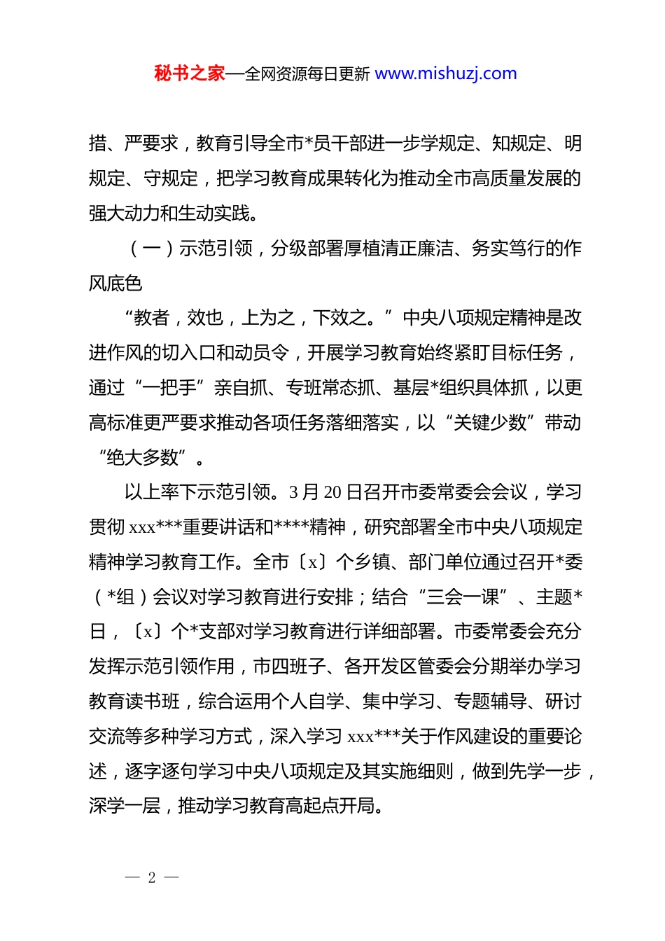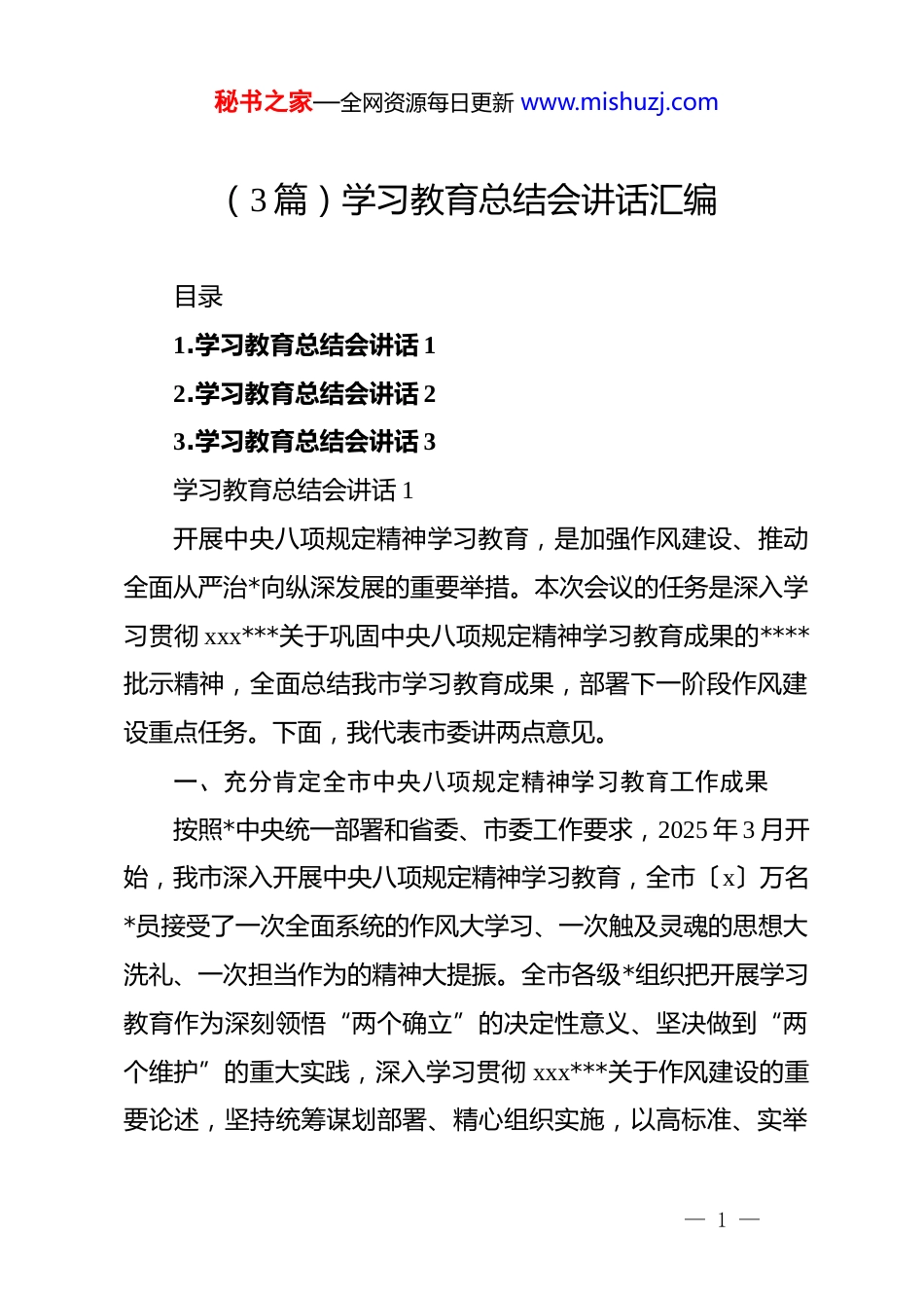 秘书之家—全网资源每日更新 www.mishuzj.com(3 篇)学习教育总结会讲话汇编目录1.学习教育总结会讲话 12.学习教育总结会讲话 23.学习教育总结会讲话 3学习教育总结会讲话 1开展中央八项规定精神学习教育,是加强作风建设、推动全面从严治*向纵深发展的重要举措。本次会议的任务是深入学习贯彻 xxx***关于巩固中央八项规定精神学习教育成果的****批示精神,全面总结我市学习教育成果,部署下一阶段作风建设重点任务。下面,我代表市委讲两点意见。一、充分肯定全市中央八项规定精神学习教育工作成果按照*中央统一部署和省委、市委工作要求,2025 年 3 月开始,我市深入开展中央八项规定精神学习教育,全市〔x〕万名*员接受了一次全面系统的作风大学习、一次触及灵魂的思想大洗礼、一次担当作为的精神大提振。全市各级*组织把开展学习教育作为深刻领悟“两个确立”的决定性意义、坚决做到“两个维护”的重大实践,深入学习贯彻 xxx***关于作风建设的重要论述,坚持统筹谋划部署、精心组织实施,以高标准、实举— 1 —秘书之家—全网资源每日更新 www.mishuzj.com措、严要求,教育引导全市*员干部进一步学规定、知规定、明规定、守规定,把学习教育成果转化为推动全市高质量发展的强大动力和生动实践。(一)示范引领,分级部署厚植清正廉洁、务实笃行的作风底色“教者,效也,上为之,下效之。”中央八项规定精神是改进作风的切入口和动员令,开展学习教育始终紧盯目标任务,通过“一把手”亲自抓、专班常态抓、基层*组织具体抓,以更高标准更严要求推动各项任务落细落实,以“关键少数”带动“绝大多数”。以上率下示范引领。3 月 20 日召开市委常委会会议,学习贯彻 xxx***重要讲话和****精神,研究部署全市中央八项规定精神学习教育工作。全市〔x〕个乡镇、部门单位通过召开*委(*组)会议对学习教育进行安排;结合“三会一课”、主题*日,〔x〕个*支部对学习教育进行详细部署。市委常委会充分发挥示范引领作用,市四班子、各开发区管委会分期举办学习教育读书班,综合运用个人自学、集中学习、专题辅导、研讨交流等多种学习方式,深入学习 xxx***关于作风建设的重要论述,逐字逐句学习中央八项规定及其实施细则,做到先学一步,深学一层,推动学习教育高起点开局。— 2 —秘书之家—全网资源每日更新 www.mishuzj.com上下联动统筹推进。市委*的建设工作领导小组抓好统筹协调,及时掌握情况、加强指导,全市各部门各单位闻令而动、迅速部署,全面覆盖、扎实推进学习教育。充分发挥工作专班牵头抓总作用,适时召开培训会、推进会、调度会,及时下发工作提示,分类施策、一体推进各级*委(*组)落实重点任务,班子成员履行“一岗双责”。实行“定期调度”工作机制,指导把关各乡镇各部门各单位制定推进计划,紧跟时间节点,倒排任务进度,有力有序推动各基层*组织全覆盖开展学习教育。分类指导传导压力。工作专班采取线上指导、实地走访、会议调度等方式,对各乡镇各单位学习教育开展情况进行全覆盖指导,持续传导压力,发现问题现场反馈并及时整改。组建“送学小分队”,采取“线上+线下”的方式,努力做到让所有*员政治学习“不缺课”、理论知识“不漏学”、思想意识“不掉队”,推动基层*组织有效开展学习教育,确保了学习教育的政治性、严肃性。(二)靶向发力,高标推进筑牢风清气正、令行禁止的思想堤坝“不以规矩,不能成方圆。”加强中央八项规定精神学习教育是落实全面从严治*要求、加强作风建设的一项基础性、经常性工作,必须常抓不懈、久久为功。全市各级*组织抓住学习重— 3 —秘书之家—全网资源每日更新 www.mishuzj.com点、丰富学习载体,在走心走深走实上下功夫,真正做到入脑入心、见行见效。原原本本“深学”。开展学习教育,既要弄清楚“学什么”,又要搞明白“怎么学”。全市各级*组织结合实际制定《推进计划》,通过理论学习中心组、“三会一课”、主题*日等方式,组织广大*员干部认认真真、仔仔细细、原原本本学习中央八项规定及其实施细则,全市〔x〕个基层*组织书记紧扣作风建设要求,紧密联系思想、工作实际和具体事例全覆盖...