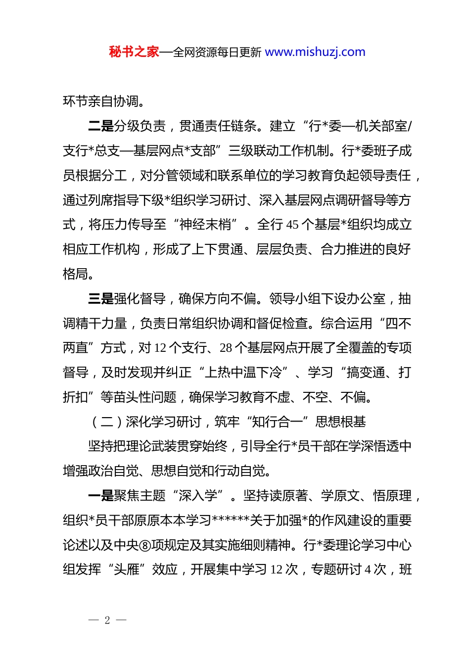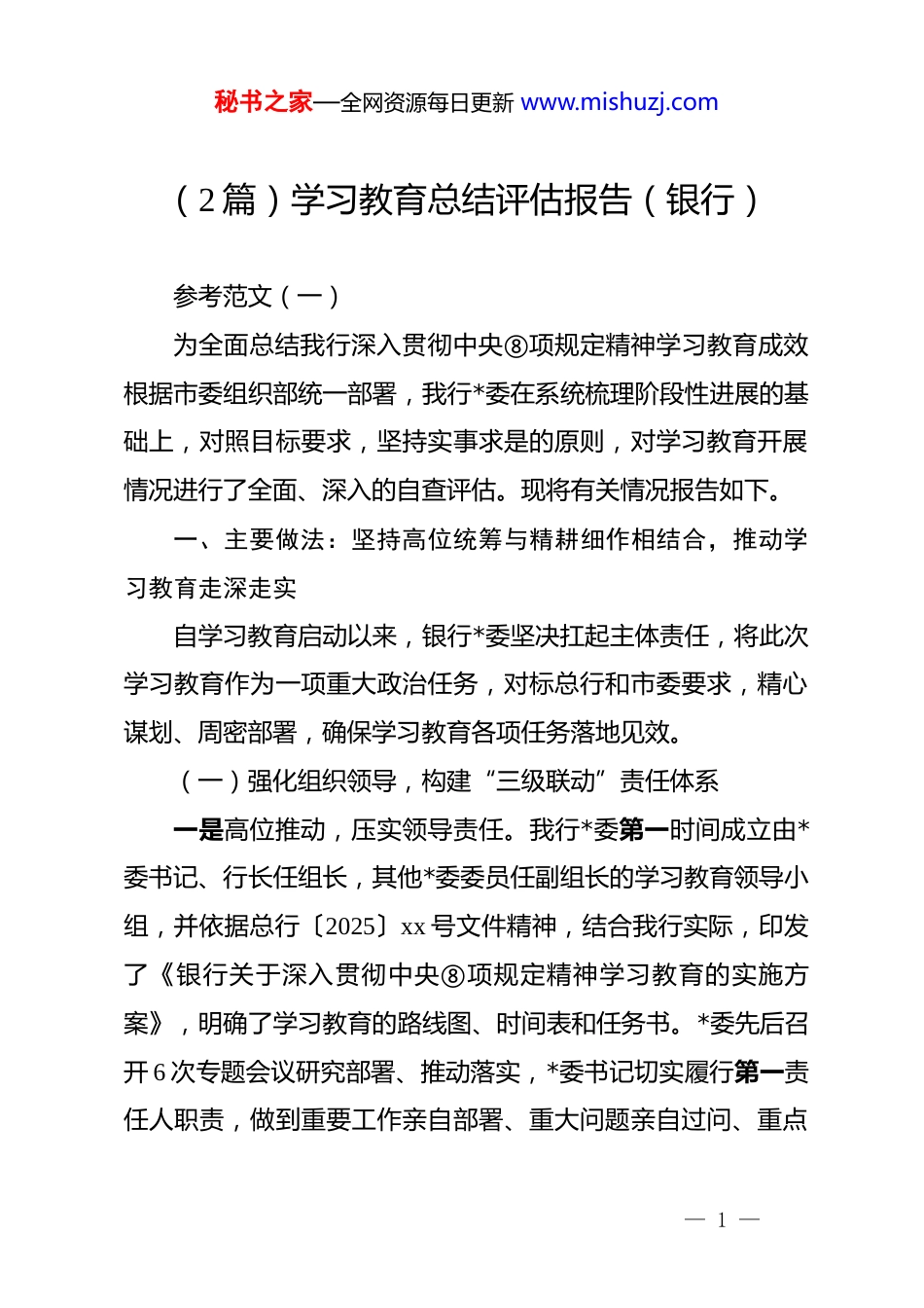 秘书之家—全网资源每日更新 www.mishuzj.com(2 篇)学习教育总结评估报告(银行)参考范文(一)为全面总结我行深入贯彻中央⑧项规定精神学习教育成效根据市委组织部统一部署,我行*委在系统梳理阶段性进展的基础上,对照目标要求,坚持实事求是的原则,对学习教育开展情况进行了全面、深入的自查评估。现将有关情况报告如下。一、主要做法:坚持高位统筹与精耕细作相结合,推动学习教育走深走实自学习教育启动以来,银行*委坚决扛起主体责任,将此次学习教育作为一项重大政治任务,对标总行和市委要求,精心谋划、周密部署,确保学习教育各项任务落地见效。(一)强化组织领导,构建“三级联动”责任体系一是高位推动,压实领导责任。我行*委第一时间成立由*委书记、行长任组长,其他*委委员任副组长的学习教育领导小组,并依据总行〔2025〕xx 号文件精神,结合我行实际,印发了《银行关于深入贯彻中央⑧项规定精神学习教育的实施方案》,明确了学习教育的路线图、时间表和任务书。*委先后召开 6 次专题会议研究部署、推动落实,*委书记切实履行第一责任人职责,做到重要工作亲自部署、重大问题亲自过问、重点— 1 —秘书之家—全网资源每日更新 www.mishuzj.com环节亲自协调。二是分级负责,贯通责任链条。建立“行*委—机关部室/支行*总支—基层网点*支部”三级联动工作机制。行*委班子成员根据分工,对分管领域和联系单位的学习教育负起领导责任,通过列席指导下级*组织学习研讨、深入基层网点调研督导等方式,将压力传导至“神经末梢”。全行 45 个基层*组织均成立相应工作机构,形成了上下贯通、层层负责、合力推进的良好格局。三是强化督导,确保方向不偏。领导小组下设办公室,抽调精干力量,负责日常组织协调和督促检查。综合运用“四不两直”方式,对 12 个支行、28 个基层网点开展了全覆盖的专项督导,及时发现并纠正“上热中温下冷”、学习“搞变通、打折扣”等苗头性问题,确保学习教育不虚、不空、不偏。(二)深化学习研讨,筑牢“知行合一”思想根基坚持把理论武装贯穿始终,引导全行*员干部在学深悟透中增强政治自觉、思想自觉和行动自觉。一是聚焦主题“深入学”。坚持读原著、学原文、悟原理,组织*员干部原原本本学习******关于加强*的作风建设的重要论述以及中央⑧项规定及其实施细则精神。行*委理论学习中心组发挥“头雁”效应,开展集中学习 12 次,专题研讨 4 次,班— 2 —秘书之家—全网资源每日更新 www.mishuzj.com子成员撰写心得体会 25 篇。各级*组织依托“三会一课”、主题*日等,开展专题学习 700 余场次,*员干部参学率达到 99%以上。二是创新形式“灵活学”。针对金融行业特点和青年员工多的实际,构建“理论铸魂+风险防控+实践历练+监督考核”的全链条教育模式。组织开展“对话未来·青年说”作风建设主题活动,30 余名青年骨干结合岗位职责分享学习体会。在全行范围内组织中央⑧项规定精神知识竞赛,覆盖员工 1500 余人。同时,打造沉浸式学习场景,组织 80 余名新提拔干部、关键岗位干部及客户经理到 xx 市廉政教育基地接受警示教育,旁听职务犯罪案件庭审,以“身边事”教育“身边人”,使纪律规矩真正内化于心。三是联系实际“对照学”。编制印发《金融领域违反中央⑧项规定精神典型案例汇编》,收录了近年来银行业特别是系统内发生的违规吃喝、违规收受礼品礼金、违规发放贷款等 20个典型案例,组织*员干部对照检视、反躬自省。在学习研讨中,要求每位*员干部结合岗位职责和思想实际,谈认识、谈体会、谈差距、谈打算,累计开展专题讨论 300 余场,切实把学习过程转化为校准思想、规范行为的过程。(三)聚焦查摆问题,贯彻“动真碰硬”从严标准— 3 —秘书之家—全网资源每日更新 www.mishuzj.com坚持问题导向,以刀刃向内的勇气和自我革命的精神,深入查摆作风建设方面存在的突出问题。一是多维画像,广泛征求意见。畅通“线上+线下”意见征集渠道,通过设置意见箱、开通举报专线、召开客户与员工代表座谈会、发放调查问卷等多种形式,广泛征求服务对象、基层员工和社会各界的意见建议。累计发...