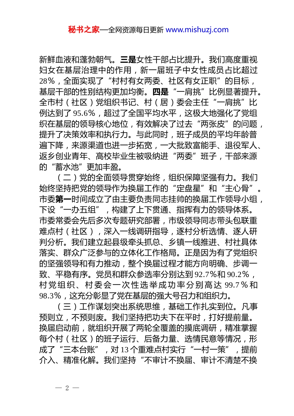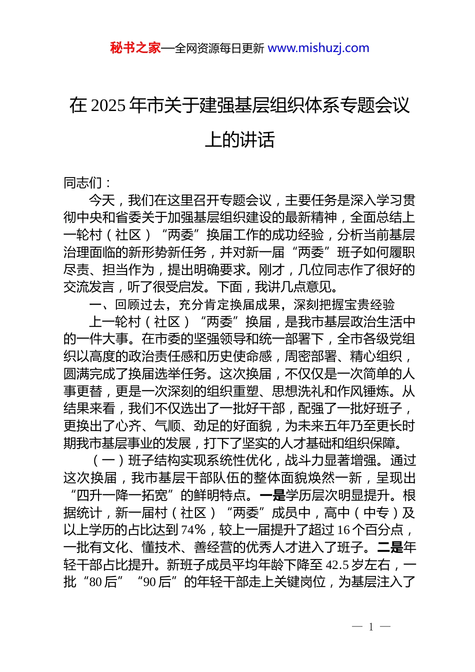 秘书之家—全网资源每日更新 www.mishuzj.com在 2025 年市关于建强基层组织体系专题会议上的讲话同志们:今天,我们在这里召开专题会议,主要任务是深入学习贯彻中央和省委关于加强基层组织建设的最新精神,全面总结上一轮村(社区)“两委”换届工作的成功经验,分析当前基层治理面临的新形势新任务,并对新一届“两委”班子如何履职尽责、担当作为,提出明确要求。刚才,几位同志作了很好的交流发言,听了很受启发。下面,我讲几点意见。一、回顾过去,充分肯定换届成果,深刻把握宝贵经验上一轮村(社区)“两委”换届,是我市基层政治生活中的一件大事。在市委的坚强领导和统一部署下,全市各级党组织以高度的政治责任感和历史使命感,周密部署、精心组织,圆满完成了换届选举任务。这次换届,不仅仅是一次简单的人事更替,更是一次深刻的组织重塑、思想洗礼和作风锤炼。从结果来看,我们不仅选出了一批好干部,配强了一批好班子,更换出了心齐、气顺、劲足的好面貌,为未来五年乃至更长时期我市基层事业的发展,打下了坚实的人才基础和组织保障。(一)班子结构实现系统性优化,战斗力显著增强。通过这次换届,我市基层干部队伍的整体面貌焕然一新,呈现出“四升一降一拓宽”的鲜明特点。一是学历层次明显提升。根据统计,新一届村(社区)“两委”成员中,高中(中专)及以上学历的占比达到 74%,较上一届提升了超过 16 个百分点,一批有文化、懂技术、善经营的优秀人才进入了班子。二是年轻干部占比提升。新班子成员平均年龄下降至 42.5 岁左右,一批“80 后”“90 后”的年轻干部走上关键岗位,为基层注入了— 1 —秘书之家—全网资源每日更新 www.mishuzj.com新鲜血液和蓬勃朝气。三是女性干部占比提升。我们高度重视妇女在基层治理中的作用,新一届班子中女性成员占比超过28%,全面实现了“村村有女两委、社区有女正职”的目标,基层干部的性别结构更加均衡。四是“一肩挑”比例显著提升。全市村(社区)党组织书记、村(居)委会主任“一肩挑”比例达到了 95.6%,超过了全国平均水平,这极大地强化了党组织在基层的领导核心地位,有效解决了过去“两张皮”的问题,提升了决策效率和执行力。与此同时,班子成员的平均年龄普遍下降,来源渠道也进一步拓宽,一大批致富能手、退役军人、返乡创业青年、高校毕业生被吸纳进“两委”班子,干部来源的“蓄水池”更加丰盈。(二)党的全面领导贯穿始终,组织保障坚强有力。我们始终坚持把党的领导作为换届工作的“定盘星”和“主心骨”。市委第一时间成立了由主要负责同志挂帅的换届工作领导小组,下设“一办五组”,构建了上下贯通、指挥有力的领导体系。市委常委会先后多次专题研究部署,市级领导同志带头包联重难点村(社区),深入一线调研指导,逐村分析选情、逐人研判分析。我们建立起县级牵头抓总、乡镇一线推进、村社具体落实、群众广泛参与的立体化工作格局。正是因为有了党组织的坚强领导和有力推动,整个换届过程才能方向明确、步调一致、平稳有序。党员和群众参选率分别达到 92.7%和 90.2%,村 党 组 织 、 村 委 会 一 次 性 选 举 成 功 率 分 别 高 达 99.7 % 和98.3%,这充分彰显了党在基层的强大号召力和组织力。(三)工作谋划突出系统思维,基础工作扎实到位。凡事预则立,不预则废。我们坚持把功夫下在平时,打好提前量。换届启动前,就组织开展了两轮全覆盖的摸底调研,精准掌握每个村(社区)的班子运行、后备力量、选情民意等情况,形成了“三本台账”,对 13 个重难点村实行“一村一策”,提前介入、精准化解。我们坚持“不审计不换届、审计不清楚不换— 2 —秘书之家—全网资源每日更新 www.mishuzj.com届”的原则,对所有村(社区)进行任期经济责任审计,全面亮出“家底”,让候选人清白参选,让群众明白监督。同时,我们下大力气整顿软弱涣散党组织,为换届扫清了障碍。在程序上,我们制定了详尽的实施方案、操作流程图和工作行事历,确保法定程序不变通、规定步骤一个不少。全市各级累计举办业务培训 92 期,培训 2500 余人次,让所有参与...