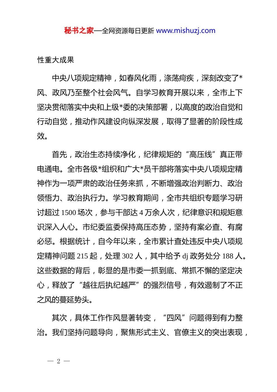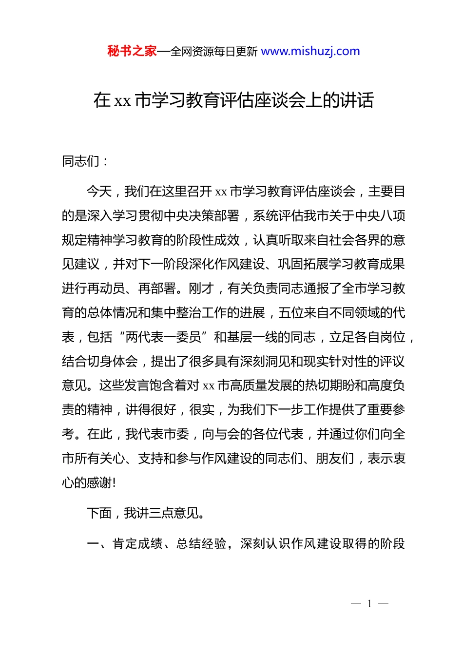 秘书之家—全网资源每日更新 www.mishuzj.com在 xx 市学习教育评估座谈会上的讲话同志们:今天,我们在这里召开 xx 市学习教育评估座谈会,主要目的是深入学习贯彻中央决策部署,系统评估我市关于中央八项规定精神学习教育的阶段性成效,认真听取来自社会各界的意见建议,并对下一阶段深化作风建设、巩固拓展学习教育成果进行再动员、再部署。刚才,有关负责同志通报了全市学习教育的总体情况和集中整治工作的进展,五位来自不同领域的代表,包括“两代表一委员”和基层一线的同志,立足各自岗位,结合切身体会,提出了很多具有深刻洞见和现实针对性的评议意见。这些发言饱含着对 xx 市高质量发展的热切期盼和高度负责的精神,讲得很好,很实,为我们下一步工作提供了重要参考。在此,我代表市委,向与会的各位代表,并通过你们向全市所有关心、支持和参与作风建设的同志们、朋友们,表示衷心的感谢!下面,我讲三点意见。一、肯定成绩、总结经验,深刻认识作风建设取得的阶段— 1 —秘书之家—全网资源每日更新 www.mishuzj.com性重大成果中央八项规定精神,如春风化雨,涤荡疴疾,深刻改变了*风、政风乃至整个社会风气。自学习教育开展以来,全市上下坚决贯彻落实中央和上级*委的决策部署,以高度的政治自觉和行动自觉,推动作风建设向纵深发展,取得了显著的阶段性成效。首先,政治生态持续净化,纪律规矩的“高压线”真正带电通电。全市各级*组织和广大*员干部将落实中央八项规定精神作为一项严肃的政治任务来抓,不断增强政治判断力、政治领悟力、政治执行力。学习教育期间,全市共组织专题学习研讨超过 1500 场次,参与干部达 4 万余人次,纪律意识和规矩意识深入人心。市纪委监委保持高压态势,坚持有案必查、有腐必惩。根据统计,自今年以来,全市累计查处违反中央八项规定精神问题 215 起,处理 302 人,其中给予 dj 政务处分 188 人。这些数据的背后,彰显的是市委一抓到底、常抓不懈的坚定决心,释放了“越往后执纪越严”的强烈信号,有效遏制了不正之风的蔓延势头。其次,具体工作作风显著转变,“四风”问题得到有力整治。我们坚持问题导向,聚焦形式主义、官僚主义的突出表现,— 2 —秘书之家—全网资源每日更新 www.mishuzj.com开展了多轮专项整治行动。在为基层减负方面,我们大力精简文件会议,市本级印发的文件数量同比下降了 18%,召开的会议数量减少了 22%。同时,对面向基层的各类督查检查考核事项进行了全面清理和规范,整合归并了 40%以上的项目,切实为基层干部“松绑”,让他们有更多时间和精力深入一线、服务群众。在整治享乐主义、奢靡之风方面,成效同样显著。全市“三公”经费支出实现同比下降 45%。过去一些单位存在的超标准接待、公车私用、滥发津补贴等顽疾基本得到根除。这些转变,不仅节约了大量的公共资源,更重要的是重塑了*员干部在人民群众心中的形象。再者,发展环境不断优化,作风建设成果转化为高质量发展的强大动力。作风建设的最终目的,是为了更好地推动发展、服务人民。我们深刻认识到,优良的作风就是最好的营商环境。为此,我市将优化营商环境作为深化作风建设的重要着力点。借鉴先进地区的成功经验,我市出台了《优化营商环境 75 条措施》,大力推行“一件事一次办”“免申即享”等改革举措。政务服务事项的平均办理时限压缩了 60%以上,企业开办时间缩短至 1 个工作日以内。这些务实的举措,让企业和群众实实在在感受到了便利和效率,市场主体的活力和信心得到有效激— 3 —秘书之家—全网资源每日更新 www.mishuzj.com发。今年上半年,全市新增市场主体超过 1.2 万户,同比增长9.8%,引进重点产业项目 56 个,计划总投资额超过 300 亿元,这些都是作风转变带来的“发展红利”。最后,民生福祉持续增进,人民群众的获得感、幸福感、安全感更加充实。我们始终坚持,作风建设的成效要由人民群众来检验。通过正风肃纪,我们将节省下来的大量行政成本和财政资金,优先投入到民生领域。例如,市里将去年压减的近8000 万元会议费、差旅费等行政开支,全部用于支持老旧小区改造、中小学基...