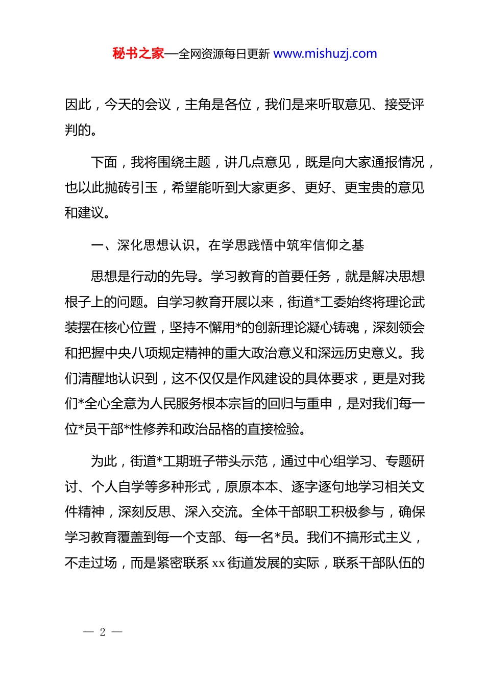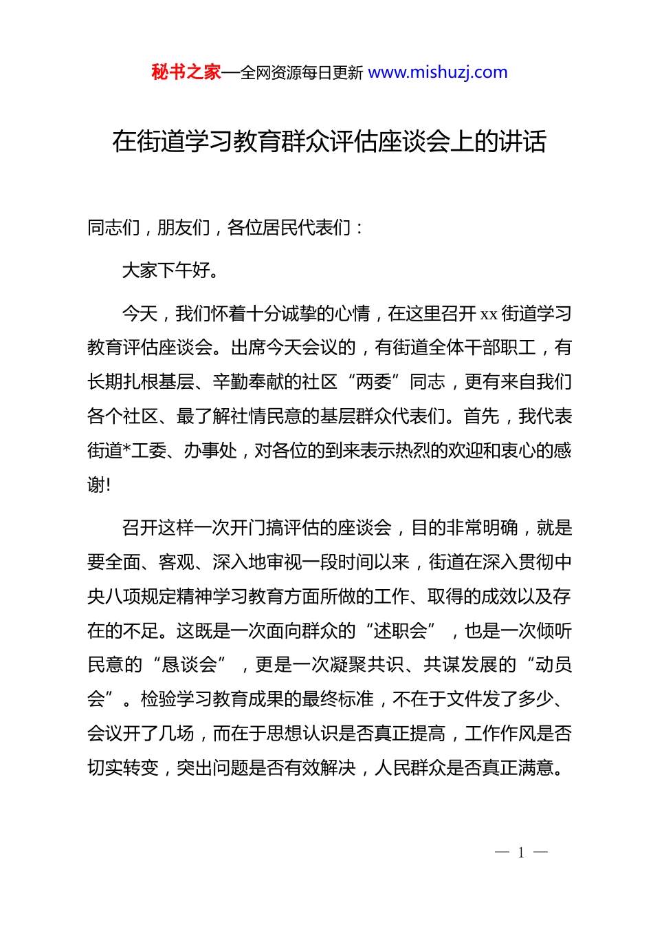 秘书之家—全网资源每日更新 www.mishuzj.com在街道学习教育群众评估座谈会上的讲话同志们,朋友们,各位居民代表们:大家下午好。今天,我们怀着十分诚挚的心情,在这里召开 xx 街道学习教育评估座谈会。出席今天会议的,有街道全体干部职工,有长期扎根基层、辛勤奉献的社区“两委”同志,更有来自我们各个社区、最了解社情民意的基层群众代表们。首先,我代表街道*工委、办事处,对各位的到来表示热烈的欢迎和衷心的感谢!召开这样一次开门搞评估的座谈会,目的非常明确,就是要全面、客观、深入地审视一段时间以来,街道在深入贯彻中央八项规定精神学习教育方面所做的工作、取得的成效以及存在的不足。这既是一次面向群众的“述职会”,也是一次倾听民意的“恳谈会”,更是一次凝聚共识、共谋发展的“动员会”。检验学习教育成果的最终标准,不在于文件发了多少、会议开了几场,而在于思想认识是否真正提高,工作作风是否切实转变,突出问题是否有效解决,人民群众是否真正满意。— 1 —秘书之家—全网资源每日更新 www.mishuzj.com因此,今天的会议,主角是各位,我们是来听取意见、接受评判的。下面,我将围绕主题,讲几点意见,既是向大家通报情况,也以此抛砖引玉,希望能听到大家更多、更好、更宝贵的意见和建议。一、深化思想认识,在学思践悟中筑牢信仰之基思想是行动的先导。学习教育的首要任务,就是解决思想根子上的问题。自学习教育开展以来,街道*工委始终将理论武装摆在核心位置,坚持不懈用*的创新理论凝心铸魂,深刻领会和把握中央八项规定精神的重大政治意义和深远历史意义。我们清醒地认识到,这不仅仅是作风建设的具体要求,更是对我们*全心全意为人民服务根本宗旨的回归与重申,是对我们每一位*员干部*性修养和政治品格的直接检验。为此,街道*工期班子带头示范,通过中心组学习、专题研讨、个人自学等多种形式,原原本本、逐字逐句地学习相关文件精神,深刻反思、深入交流。全体干部职工积极参与,确保学习教育覆盖到每一个支部、每一名*员。我们不搞形式主义,不走过场,而是紧密联系 xx 街道发展的实际,联系干部队伍的— 2 —秘书之家—全网资源每日更新 www.mishuzj.com思想实际,联系人民群众关切的现实问题,在学习中思考,在思考中感悟,在感悟中提升。通过系统深入的学习,广大干部职工进一步增强了贯彻落实中央八项规定精神的政治自觉、思想自觉和行动自觉。大家普遍认识到,为人民服务的宗旨意识不是一句空洞的口号,它体现在日常工作的每一个细节里,体现在为群众办理的每一件实事中,体现在面对群众诉求时的态度与效率上。这种思想上的深刻转变,为后续的整改整治和常态长效工作,打下了坚实牢固的思想基础。二、坚持问题导向,在动真碰硬中彰显整改之效衡量学习教育是否有成效,一个关键的标尺,就是看敢不敢于直面问题、善不善于解决问题。如果对问题视而不见、避重就轻,那么学习教育就失去了意义。我们坚持刀刃向内、自我革命,把问题查摆和整改整治作为贯穿学习教育全过程的一条主线,取得了阶段性的扎实成效。在问题查摆阶段,我们广开言路,通过上级点、自己找、群众提、集体议等方式,全面深入地进行了一次“政治体检”。经过系统梳理,共归纳出在思想认识、工作作风、服务效能、— 3 —秘书之家—全网资源每日更新 www.mishuzj.com纪律建设等 4 个方面共计 21 项突出问题。这些问题,有的表现为形式主义、官僚主义的顽瘴痼疾,比如一些工作“墙上挂挂、纸上画画”,落实效果不佳;有的表现为服务群众的意识不强、能力不足,比如个别窗口单位办事流程依然繁琐,让群众多跑腿;有的表现为工作纪律松弛、精神状态不振,存在“庸懒散”现象。针对这 21 项问题,我们没有丝毫遮掩,而是制定了详尽的《整改整治问题清单》《任务清单》和《责任清单》,将每一项问题都明确到责任领导、责任部门和完成时限,实行台账式管理、项目化推进,确保件件有回音、事事有着落。在这里,我可以负责任地向大家报告,截至今天,清单中的 21 项问题,已全部完成阶段性整改,其中 18 项已彻底整改销号,其余 3 项涉及长期建设的,...