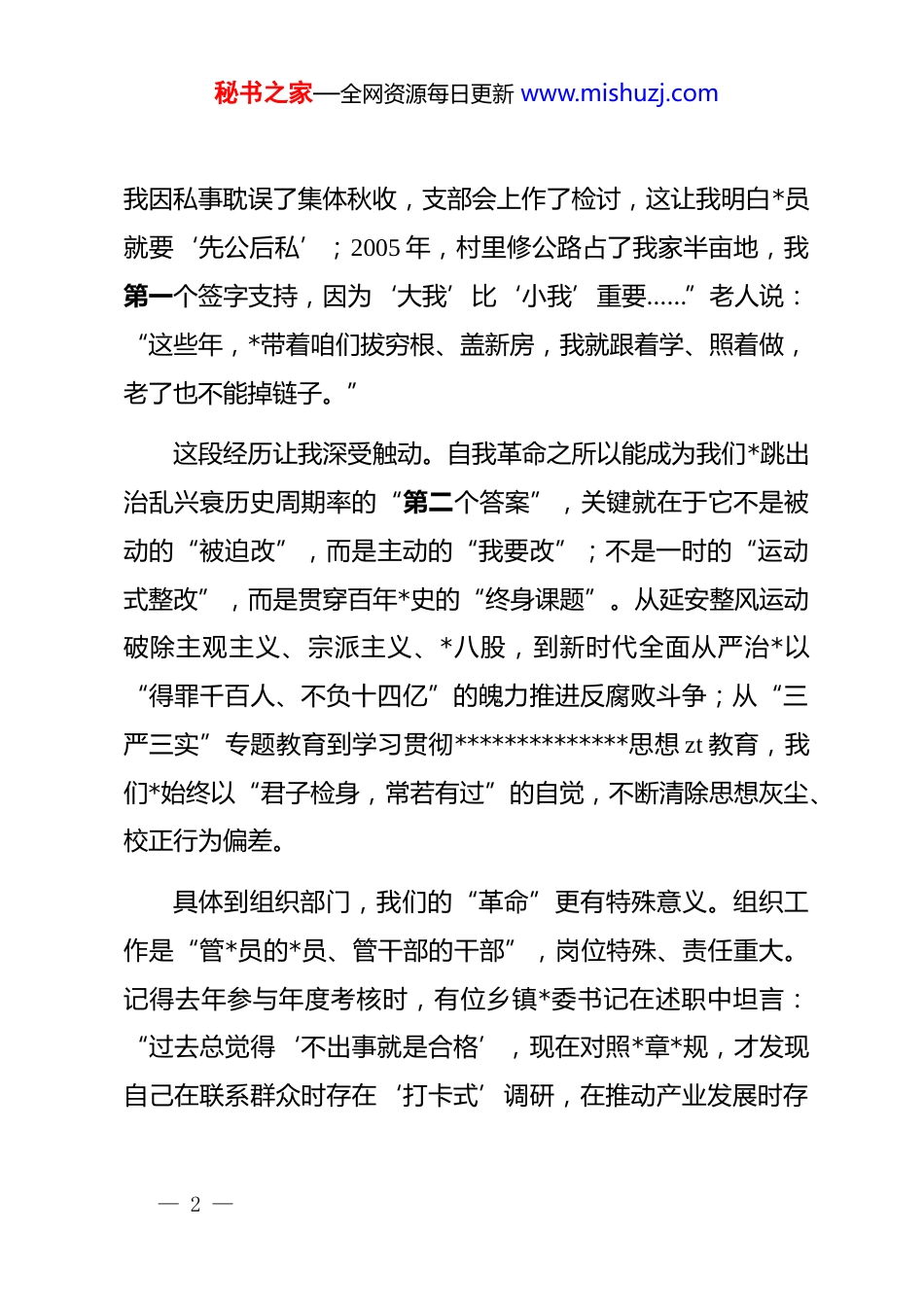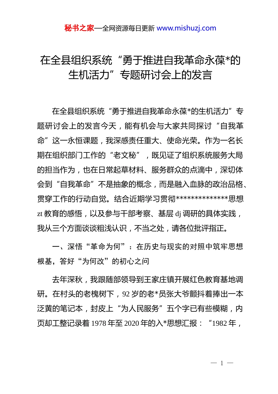 秘书之家—全网资源每日更新 www.mishuzj.com在全县组织系统“勇于推进自我革命永葆*的生机活力”专题研讨会上的发言在全县组织系统“勇于推进自我革命永葆*的生机活力”专题研讨会上的发言今天,能有机会与大家共同探讨“自我革命”这一永恒课题,我深感责任重大、使命光荣。作为一名长期在组织部门工作的“老文秘”,既见证了组织系统服务大局的担当作为,也在日常起草材料、服务群众的点滴中,深切体会到“自我革命”不是抽象的概念,而是融入血脉的政治品格、贯穿工作的行动自觉。结合近期学习贯彻**************思想zt 教育的感悟,以及参与干部考察、基层 dj 调研的具体实践,我从三个方面谈谈粗浅认识,不当之处,请各位批评指正。一、深悟“革命为何”:在历史与现实的对照中筑牢思想根基,答好“为何改”的初心之问去年深秋,我跟随部领导到王家庄镇开展红色教育基地调研。在村头的老槐树下,92 岁的老*员张大爷颤抖着捧出一本泛黄的笔记本,封皮上“为人民服务”五个字已有些模糊,内页却工整记录着 1978 年至 2020 年的入*思想汇报:“1982 年,— 1 —秘书之家—全网资源每日更新 www.mishuzj.com我因私事耽误了集体秋收,支部会上作了检讨,这让我明白*员就要‘先公后私’;2005 年,村里修公路占了我家半亩地,我第一个签字支持,因为‘大我’比‘小我’重要……”老人说:“这些年,*带着咱们拔穷根、盖新房,我就跟着学、照着做,老了也不能掉链子。”这段经历让我深受触动。自我革命之所以能成为我们*跳出治乱兴衰历史周期率的“第二个答案”,关键就在于它不是被动的“被迫改”,而是主动的“我要改”;不是一时的“运动式整改”,而是贯穿百年*史的“终身课题”。从延安整风运动破除主观主义、宗派主义、*八股,到新时代全面从严治*以“得罪千百人、不负十四亿”的魄力推进反腐败斗争;从“三严三实”专题教育到学习贯彻**************思想 zt 教育,我们*始终以“君子检身,常若有过”的自觉,不断清除思想灰尘、校正行为偏差。具体到组织部门,我们的“革命”更有特殊意义。组织工作是“管*员的*员、管干部的干部”,岗位特殊、责任重大。记得去年参与年度考核时,有位乡镇*委书记在述职中坦言:“过去总觉得‘不出事就是合格’,现在对照*章*规,才发现自己在联系群众时存在‘打卡式’调研,在推动产业发展时存— 2 —秘书之家—全网资源每日更新 www.mishuzj.com在‘等靠要’思想。”这句话点醒了我——组织部门不仅要“识人”,更要“育人”;不仅要“管干部”,更要“带队伍”;不仅要当“参谋助手”,更要当“自我革命的标杆”。如果组工干部自身思想“生锈”、作风“跑偏”,又何谈为*和人民选贤任能?二、细查“改些什么”:在问题与靶心的聚焦中找准实践路径,破解“改什么”的现实之困今年 3 月,部里开展“组工干部下基层蹲点月”活动,我被分到李庄乡刘庄村。在与村“两委”成员、*员群众的朝夕相处中,我发现了一些值得深思的现象:村*支部虽能按时开“三会一课”,但学习内容多是“照本宣科”,老*员反映“听着亲切,用着发懵”;*员先锋队名义上“全覆盖”,但真正参与矛盾调解、环境整治的只有 10 余人;村集体合作社流转了 200 亩土地种大棚蔬菜,却因管理粗放、销路不畅,半年就亏损 15 万元……这些问题的背后,折射出的是组织工作的“短板”:理论武装与实践需求“两张皮”、*员作用与群众期待“不对等”、基层 dj 与产业发展“相脱节”。******强调,“自我革命关键要有正视问题的自觉和刀刃向内的勇气”。对我们而言,就是— 3 —秘书之家—全网资源每日更新 www.mishuzj.com要坚持问题导向,把“改什么”具体化、精准化。第一,改“本领恐慌”,让理论武装从“入眼”到“入心”。针对基层*员学习“虚化”问题,我们探索“田间课堂”“院坝*课”等新形式,邀请农业专家、致富能手结合产业讲政策,用“方言土语”代替“文件套话”。比如在刘庄村,我们联合县农业农村局技术员,把*的二十大报告中“发展乡村特色产业”的论述,转化为“如何选品种、找销路、算收益”的实操指南,老*员王大姐听完后说:“...