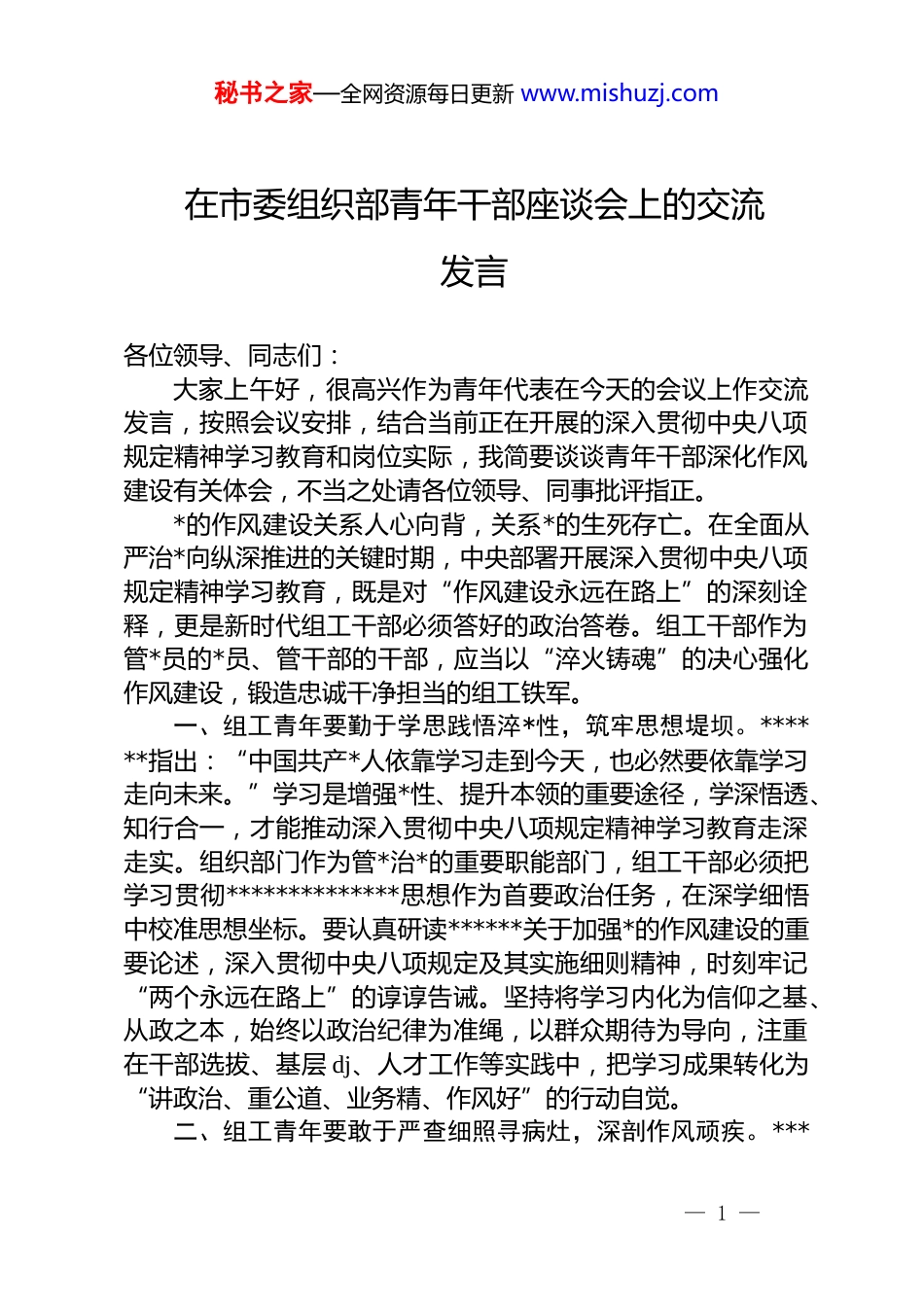 秘书之家—全网资源每日更新 www.mishuzj.com在市委组织部青年干部座谈会上的交流发言各位领导、同志们:大家上午好,很高兴作为青年代表在今天的会议上作交流发言,按照会议安排,结合当前正在开展的深入贯彻中央八项规定精神学习教育和岗位实际,我简要谈谈青年干部深化作风建设有关体会,不当之处请各位领导、同事批评指正。*的作风建设关系人心向背,关系*的生死存亡。在全面从严治*向纵深推进的关键时期,中央部署开展深入贯彻中央八项规定精神学习教育,既是对“作风建设永远在路上”的深刻诠释,更是新时代组工干部必须答好的政治答卷。组工干部作为管*员的*员、管干部的干部,应当以“淬火铸魂”的决心强化作风建设,锻造忠诚干净担当的组工铁军。一、组工青年要勤于学思践悟淬*性,筑牢思想堤坝。******指出:“中国共产*人依靠学习走到今天,也必然要依靠学习走向未来。”学习是增强*性、提升本领的重要途径,学深悟透、知行合一,才能推动深入贯彻中央八项规定精神学习教育走深走实。组织部门作为管*治*的重要职能部门,组工干部必须把学习贯彻**************思想作为首要政治任务,在深学细悟中校准思想坐标。要认真研读******关于加强*的作风建设的重要论述,深入贯彻中央八项规定及其实施细则精神,时刻牢记“两个永远在路上”的谆谆告诫。坚持将学习内化为信仰之基、从政之本,始终以政治纪律为准绳,以群众期待为导向,注重在干部选拔、基层 dj、人才工作等实践中,把学习成果转化为“讲政治、重公道、业务精、作风好”的行动自觉。二、组工青年要敢于严查细照寻病灶,深剖作风顽疾。***— 1 —秘书之家—全网资源每日更新 www.mishuzj.com***强调:“敢于直面问题、勇于修正错误,是我们*的显著特点和优势。”这为查摆问题提供了根本遵循。组工干部必须坚持问题导向,以正视问题的自觉和刀刃向内的勇气深挖细查作风顽疾。要聚焦“三个是否”深入检视,看服务基层时是否存在“衙门习气”,干部考察中是否存在“好人主义”,日常工作中是否存在“精致利己”,全面深入查找在落实中央八项规定及其实施细则精神方面的不足,注重剖析问题根源。唯有把自己、职责、工作摆进去,从思想深处查根源、从政治高度找不足,才能揪出“四风”新表现,破除“中梗阻”“微腐败”,避免“小问题”积累成“大隐患”。三、组工青年要坚持立行立改见真章,整治沉疴宿疾。深入贯彻中央八项规定精神,关键在“改”、要害在“实”。******强调,要以踏石留印、抓铁有痕的劲头抓下去,善始善终、善作善成,防止虎头蛇尾,让全*全体人民来监督,让人民群众不断看到实实在在的成效和变化。组工干部必须以“破釜沉舟”的决心推进集中整治,做到“当下改”与“长久立”相结合。在整改落实中,要突出“靶向治疗”,针对调研中的“走过场”问题,建立“带着问题去、揣着答案回”的闭环机制,让基层群众成为“阅卷人”;针对干部工作中的“唯分数唯资历”倾向,完善“日常考核+专项考核+民主测评”的立体评价体系,将严管厚爱贯穿干部选育管用全过程;针对形式主义、官僚主义新变种,通过精简会议文件、规范督查检查等为基层松绑减负。同时,注重从制度层面固化成果,将中央八项规定精神融入组织工作规章制度,建立“负面清单”、开展“作风体检”,推动组织部门成为“讲*性、重品行、作表率”的标杆。四、组工青年要善于问计于民强根基,检验作风成色。人民群众是*的执政之基、力量之源、胜利之本。******强调:“加强和改进*的作风建设,核心问题是保持*同人民群众的血肉联系。”组工干部践行中央八项规定精神,必须把“开门教— 2 —秘书之家—全网资源每日更新 www.mishuzj.com育”贯穿始终,将群众满意度作为“试金石”。要主动走出机关,深入基层问需于民,看干部选拔是否公道、基层*组织建设是否有力、人才政策制定是否精准。要把解决群众的急难愁盼作为干部考核的重要指标,让作风建设成果经得起历史和人民的检验。各位青年朋友,作为新时代青年干部,生逢伟大时代、肩负光荣使命,我们要深入学习贯彻******关于作风建设的重要论述和指示批示精神,以扎实作风埋头苦干、奋蹄争先...