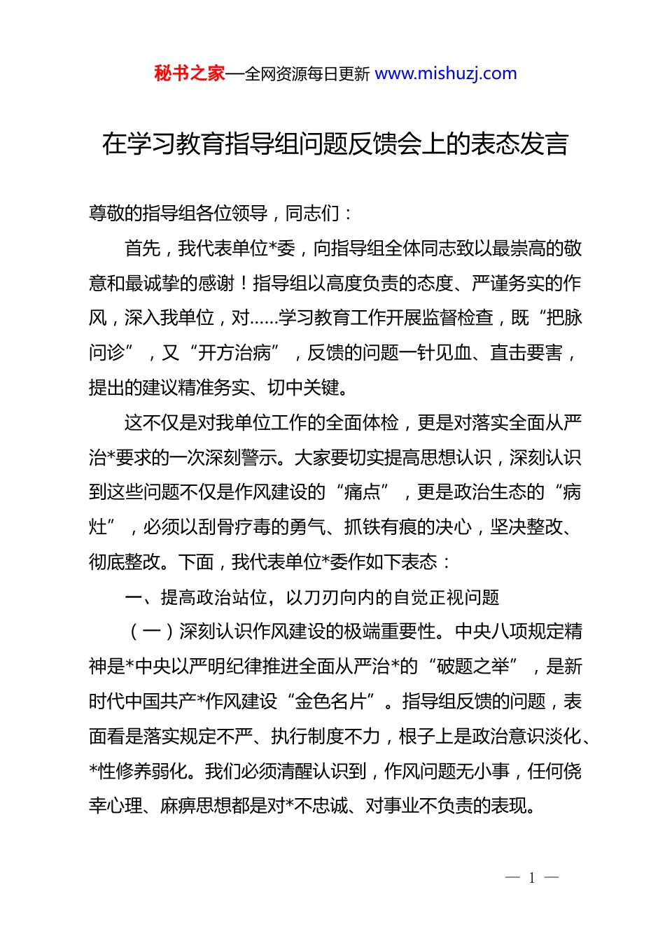 秘书之家—全网资源每日更新 www.mishuzj.com在学习教育指导组问题反馈会上的表态发言尊敬的指导组各位领导,同志们:首先,我代表单位*委,向指导组全体同志致以最崇高的敬意和最诚挚的感谢!指导组以高度负责的态度、严谨务实的作风,深入我单位,对……学习教育工作开展监督检查,既“把脉问诊”,又“开方治病”,反馈的问题一针见血、直击要害,提出的建议精准务实、切中关键。这不仅是对我单位工作的全面体检,更是对落实全面从严治*要求的一次深刻警示。大家要切实提高思想认识,深刻认识到这些问题不仅是作风建设的“痛点”,更是政治生态的“病灶”,必须以刮骨疗毒的勇气、抓铁有痕的决心,坚决整改、彻底整改。下面,我代表单位*委作如下表态:一、提高政治站位,以刀刃向内的自觉正视问题(一)深刻认识作风建设的极端重要性。中央八项规定精神是*中央以严明纪律推进全面从严治*的“破题之举”,是新时代中国共产*作风建设“金色名片”。指导组反馈的问题,表面看是落实规定不严、执行制度不力,根子上是政治意识淡化、*性修养弱化。我们必须清醒认识到,作风问题无小事,任何侥幸心理、麻痹思想都是对*不忠诚、对事业不负责的表现。— 1 —秘书之家—全网资源每日更新 www.mishuzj.com(二)坚决扛起“两个维护”的政治责任。落实中央八项规定精神,是检验“四个意识”“两个维护”的试金石。指导组指出的问题,暴露出我们在贯彻落实*中央决策部署上还存在“温差”“落差”。我们要以此次整改为契机,把作风建设与学习贯彻*的二十大精神结合起来,与开展 zt 教育结合起来,以实际行动践行“两个维护”。(三)以思想破冰引领行动突围。作风问题背后是思想问题。各*组织要行动起来,积极组织开展“作风建设大家谈”活动,组织全体干部职工对照问题清单,深入剖析“我是谁、为了谁、依靠谁”的根本问题。通过*委理论学习中心组学习、专题*课、警示教育大会等形式,引导*员干部破除“惯性思维”“特权思想”,树牢“人民至上”理念,从思想上筑牢拒腐防变的防线。二、抓实问题整改,以标本兼治的举措推动落实将整改工作与中心工作深度融合,以作风转变促效能提升。(一)压实领导责任。成立由我任组长的整改工作领导小组,下设综合协调、督查督办、宣传报道 3 个专班,确保整改工作“有人抓、有人管、有落实”。(二)压实部门责任。针对指导组反馈的 x 类问题,逐一明确牵头部门、配合单位和完成时限,建立“问题清单—任务— 2 —秘书之家—全网资源每日更新 www.mishuzj.com清单—责任清单”三张清单,实行“销号式”管理。(三)压实监督责任。纪委监委将整改工作纳入政治监督日常监督重点内容,对整改不力、敷衍塞责的部门和个人,严肃追责问责,典型案例通报曝光。三、强化作风建设,以久久为功的韧劲巩固成果作风建设永远在路上。我们将以整改为起点,推动中央八项规定精神化风成俗。(一)领导带头作表率。从*委班子做起,严格落实“一岗双责”,带头执行廉洁自律各项规定,带头反对特权思想和特权行为,以“关键少数”带动“绝大多数”。(二)深入基层转作风。建立*委成员联系基层制度,定期开展调研,聚焦群众急难愁盼问题,坚决纠治“文山会海”“过度留痕”等形式主义、官僚主义问题,切实为基层减负赋能。(三)常态长效抓监督。整合纪检、审计、财务等监督力量,构建“大监督”格局,常态化开展明察暗访和专项检查,对顶风违纪行为“零容忍”,持续释放“越往后越严”的强烈信号。同志们,抓好中央八项规定精神落实,是政治责任,更是使命担当。单位*委将以此次整改为新起点,以更高标准、更严— 3 —秘书之家—全网资源每日更新 www.mishuzj.com要求、更实举措推进作风建设,以整改的实际成效推动单位高质量发展,向指导组和全体干部职工交上一份满意答卷!谢谢大家!✂— 4 —