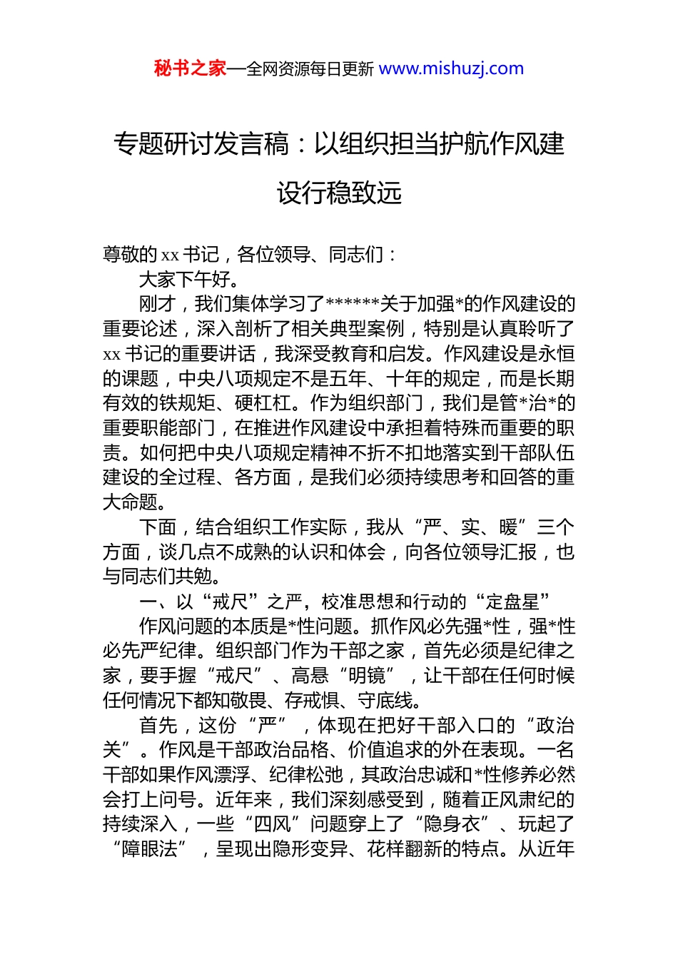 秘书之家—全网资源每日更新 www.mishuzj.com专题研讨发言稿:以组织担当护航作风建设行稳致远尊敬的 xx 书记,各位领导、同志们:大家下午好。刚才,我们集体学习了******关于加强*的作风建设的重要论述,深入剖析了相关典型案例,特别是认真聆听了xx 书记的重要讲话,我深受教育和启发。作风建设是永恒的课题,中央八项规定不是五年、十年的规定,而是长期有效的铁规矩、硬杠杠。作为组织部门,我们是管*治*的重要职能部门,在推进作风建设中承担着特殊而重要的职责。如何把中央八项规定精神不折不扣地落实到干部队伍建设的全过程、各方面,是我们必须持续思考和回答的重大命题。下面,结合组织工作实际,我从“严、实、暖”三个方面,谈几点不成熟的认识和体会,向各位领导汇报,也与同志们共勉。一、以“戒尺”之严,校准思想和行动的“定盘星”作风问题的本质是*性问题。抓作风必先强*性,强*性必先严纪律。组织部门作为干部之家,首先必须是纪律之家,要手握“戒尺”、高悬“明镜”,让干部在任何时候任何情况下都知敬畏、存戒惧、守底线。首先,这份“严”,体现在把好干部入口的“政治关”。作风是干部政治品格、价值追求的外在表现。一名干部如果作风漂浮、纪律松弛,其政治忠诚和*性修养必然会打上问号。近年来,我们深刻感受到,随着正风肃纪的持续深入,一些“四风”问题穿上了“隐身衣”、玩起了“障眼法”,呈现出隐形变异、花样翻新的特点。从近年秘书之家—全网资源每日更新 www.mishuzj.com区纪委监委查处的一些案件看,从违规收送土特产、电子红包,到“不吃公款吃老板”的“老板食堂”,再到以考察学习为名绕道公款旅游,形式更加隐蔽,也更具迷惑性这警示我们,在选人用人上,必须把作风建设的要求嵌入到动议、民主推荐、考察、讨论决定、任职等各个环节。我们要用“显微镜”审视干部的日常言行,用“放大镜”检视干部的“社交圈”“生活圈”,不仅要看他“八小时内”干了什么,也要了解他“八小时外”在干什么;不仅要听他怎么说,更要看他怎么做。对那些作风不实、口碑不佳、有“硬伤”的干部,坚决挡在门外,绝不让“带病”之身混入组织,从源头上净化干部队伍的“肌体”。其次,这份“严”,体现在用好案例剖析的“活教材”。每一个案例都是一部触及灵魂的教科书。前段时间我们都学习了关于信阳 10 名干部违规吃喝问题的通报,这些发生在身边的案例,教训尤为深刻。组织部门要配合纪检监察机关,把警示教育做在日常、抓在经常。要推动建立常态化的警示教育机制,不仅要在民主生活会、组织生活会上对照检查,更要把典型案例融入到干部教育培训的课堂中,让各级干部特别是年轻干部,从踏入仕途的第一天起,就系好廉洁从政的“第一粒扣子”。就像我们今天这次学习研讨会,通过以案为鉴、以案明纪,让大家在思想上再紧一扣,在行动上再紧一寸,真正让铁规矩、硬杠杠成为带电的“高压线”,而不是可有可无的“稻草人”。二、以“秤砣”之实,称量担当与作为的“含金量”xx 书记刚才强调,要树立和践行正确政绩观,牢固树立重实干、重实绩、重担当的鲜明导向。我认为,这是破解形式主义、官僚主义这一作风顽疾的治本之策。组织部门作为干部工作的“指挥棒”和“风向标”,我们的评价标准、用人导向直接影响着干部的行为选择。如果评价体系失之于宽、失之于虚,就可能导致一些干部做表面文章搞花拳绣腿。秘书之家—全网资源每日更新 www.mishuzj.com为此,我们必须推动干部考核“求实、求准”。如何精准地为干部的“实干”与“实绩”称重?我们一直在探索。过去,我们可能更侧重于看材料、听汇报,但这容易产生信息失真。现在,我们正努力构建“政治标准+实绩导向+多维印证”的考核模型。一方面,我们坚持分类考核,根据不同层级、不同岗位的特点,设置差异化的考核指标,既看经济发展的“硬指标”,也看民生改善、安全稳定、生态保护的“软任务”;既看当前成效的“显绩”也看打基础、利长远的“潜绩”。我们力求让考核指标更加精准地反映岗位职责和中心任务。另一方面,我们坚持把考核的“探头”更多地伸到一线。干部的实绩怎么样,群众最有发言权,...