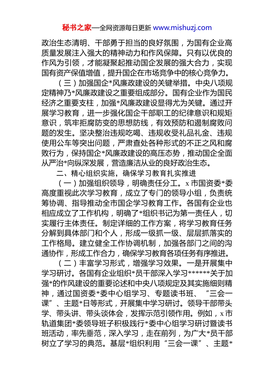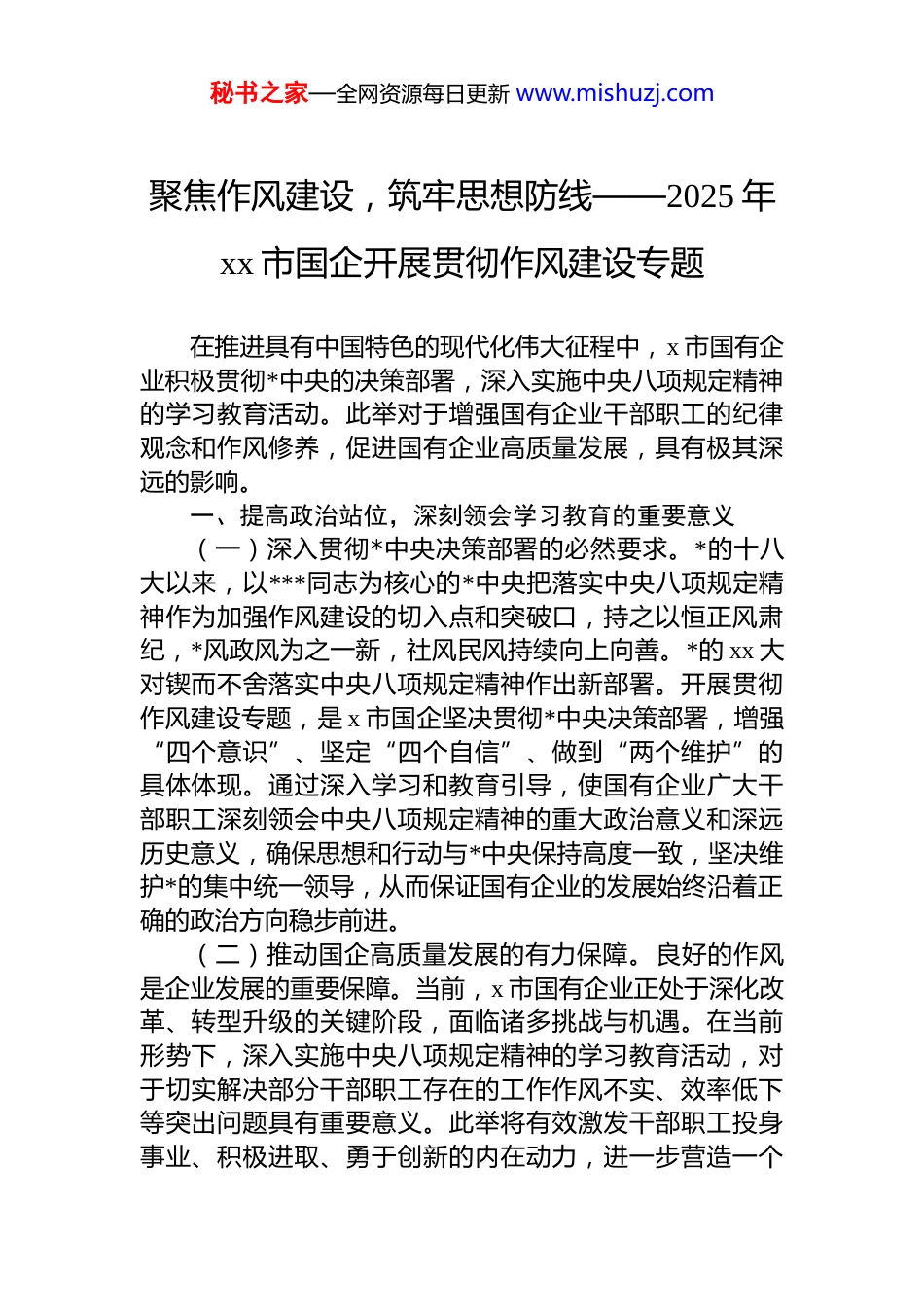 秘书之家—全网资源每日更新 www.mishuzj.com聚焦作风建设,筑牢思想防线——2025 年xx 市国企开展贯彻作风建设专题在推进具有中国特色的现代化伟大征程中,x 市国有企业积极贯彻*中央的决策部署,深入实施中央八项规定精神的学习教育活动。此举对于增强国有企业干部职工的纪律观念和作风修养,促进国有企业高质量发展,具有极其深远的影响。一、提高政治站位,深刻领会学习教育的重要意义(一)深入贯彻*中央决策部署的必然要求。*的十八大以来,以***同志为核心的*中央把落实中央八项规定精神作为加强作风建设的切入点和突破口,持之以恒正风肃纪,*风政风为之一新,社风民风持续向上向善。*的 xx 大对锲而不舍落实中央八项规定精神作出新部署。开展贯彻作风建设专题,是 x 市国企坚决贯彻*中央决策部署,增强“四个意识”、坚定“四个自信”、做到“两个维护”的具体体现。通过深入学习和教育引导,使国有企业广大干部职工深刻领会中央八项规定精神的重大政治意义和深远历史意义,确保思想和行动与*中央保持高度一致,坚决维护*的集中统一领导,从而保证国有企业的发展始终沿着正确的政治方向稳步前进。(二)推动国企高质量发展的有力保障。良好的作风是企业发展的重要保障。当前,x 市国有企业正处于深化改革、转型升级的关键阶段,面临诸多挑战与机遇。在当前形势下,深入实施中央八项规定精神的学习教育活动,对于切实解决部分干部职工存在的工作作风不实、效率低下等突出问题具有重要意义。此举将有效激发干部职工投身事业、积极进取、勇于创新的内在动力,进一步营造一个秘书之家—全网资源每日更新 www.mishuzj.com政治生态清明、干部勇于担当的良好氛围,为国有企业高质量发展注入强大的精神动力和作风保障。只有以优良的作风为引领,才能凝聚起推动国企发展的强大合力,实现国有资产保值增值,提升国企在市场竞争中的核心竞争力。(三)加强国企*风廉政建设的关键举措。中央八项规定精神乃*风廉政建设之重要组成部分。国有企业作为国民经济之重要支柱,加强*风廉政建设显得尤为关键。通过开展学习教育,进一步强化国企干部职工的纪律意识和规矩意识,筑牢拒腐防变的思想防线,有效预防和遏制腐败问题的发生。坚决整治违规吃喝、违规收受礼品礼金、违规使用公车等突出问题,严肃查处各种形式的不正之风和腐败行为,保持国企*风廉政建设的高压态势,推动国企全面从严治*向纵深发展,营造廉洁从业的良好政治生态。二、精心组织实施,确保学习教育扎实推进(一)加强组织领导,明确责任分工。x 市国资委*委高度重视此次学习教育,成立了专门的领导小组,负责统筹协调、指导推动全市国企学习教育工作。各国有企业也相应成立了工作机构,明确了*组织书记为第一责任人,切实履行主体责任。制定详细的工作方案,将学习教育任务分解到具体部门和个人,形成一级抓一级、层层抓落实的工作格局。建立健全工作协调机制,加强各部门之间的沟通协作,形成工作合力,确保学习教育各项任务有序推进。(二)丰富学习形式,增强学习效果。一是开展集中学习研讨。各国有企业组织*员干部深入学习******关于加强*的作风建设的重要论述和中央八项规定及其实施细则精神,通过国资委*委中心组学习、专题读书班、“三会一课”、主题*日等形式,开展集中学习研讨。领导干部带头学、带头讲、带头谈体会,发挥示范引领作用。例如,x 市轨道集团*委领导班子积极践行*委中心组学习研讨暨读书班活动,率先垂范,深入学习,走在前列,为广大*员干部树立了学习的典范。基层*组织利用“三会一课”、主题*秘书之家—全网资源每日更新 www.mishuzj.com日等抓紧抓实学习,确保学习教育有效覆盖到每一名*员。二是加强教育培训工作。积极邀请专家学者及纪检监察干部开展专题讲座,深入解读中央八项规定精神的深刻内涵与具体要求,通过剖析典型案例,进一步增强*员干部的纪律观念和法治观念。同时,利用线上学习平台、微信公众号等新媒体手段,推送学习资料、发布学习动态,方便*员干部随时随地进行学习。例如,x 市公交集团通过举办*委理论学习中心组集体学习暨学习教育读书班,邀请专家进行授课...