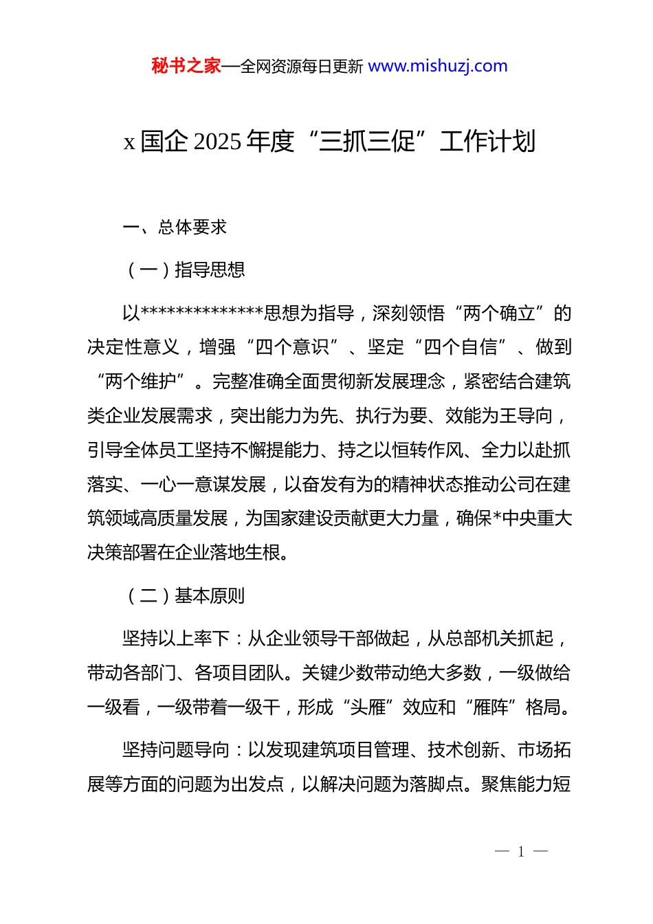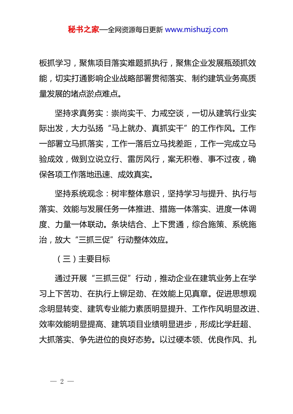 秘书之家—全网资源每日更新 www.mishuzj.comx 国企 2025 年度“三抓三促”工作计划一、总体要求(一)指导思想以**************思想为指导,深刻领悟“两个确立”的决定性意义,增强“四个意识”、坚定“四个自信”、做到“两个维护”。完整准确全面贯彻新发展理念,紧密结合建筑类企业发展需求,突出能力为先、执行为要、效能为王导向,引导全体员工坚持不懈提能力、持之以恒转作风、全力以赴抓落实、一心一意谋发展,以奋发有为的精神状态推动公司在建筑领域高质量发展,为国家建设贡献更大力量,确保*中央重大决策部署在企业落地生根。(二)基本原则坚持以上率下:从企业领导干部做起,从总部机关抓起,带动各部门、各项目团队。关键少数带动绝大多数,一级做给一级看,一级带着一级干,形成“头雁”效应和“雁阵”格局。坚持问题导向:以发现建筑项目管理、技术创新、市场拓展等方面的问题为出发点,以解决问题为落脚点。聚焦能力短— 1 —秘书之家—全网资源每日更新 www.mishuzj.com板抓学习,聚焦项目落实难题抓执行,聚焦企业发展瓶颈抓效能,切实打通影响企业战略部署贯彻落实、制约建筑业务高质量发展的堵点淤点难点。坚持求真务实:崇尚实干、力戒空谈,一切从建筑行业实际出发,大力弘扬“马上就办、真抓实干”的工作作风。工作一部署立马抓落实,工作一落后立马找差距,工作一完成立马验成效,做到立说立行、雷厉风行,案无积卷、事不过夜,确保各项工作落地迅速、成效真实。坚持系统观念:树牢整体意识,坚持学习与提升、执行与落实、效能与发展任务一体推进、措施一体落实、进度一体调度、力量一体联动。条块结合、上下贯通,综合施策、系统施治,放大“三抓三促”行动整体效应。(三)主要目标通过开展“三抓三促”行动,推动企业在建筑业务上在学习上下苦功、在执行上铆足劲、在效能上见真章。促进思想观念明显转变、建筑专业能力素质明显提升、工作作风明显改进、效率效能明显提高、建筑项目业绩明显进步,形成比学赶超、大抓落实、争先进位的良好态势。以过硬本领、优良作风、扎— 2 —秘书之家—全网资源每日更新 www.mishuzj.com实成效为企业在建筑市场竞争中赋能,构建富有特色的现代化建筑企业运营体系。二、主要任务(一)抓学习促提升存在问题及表现:理论武装不深:对**************思想和*中央关于建筑行业的重大决策部署学习不深入、不系统,学习内容片面化、碎片化,运用贯穿其中的立场观点方法研判建筑市场形势、解决项目实际问题的能力不足。知识储备不足:对建筑工程相关的新技术、新工艺、新材料了解不够,对建筑行业的政策法规、标准规范吃得不透、钻得不深。知识结构单一,缺乏跨学科的复合型思维,把握建筑市场机遇、创造性谋划推动项目的综合能力不足。在项目方案拟定、招投标文件编制等工作中缺乏深入学习研究,存在借鉴抄袭现象,开展项目工作缺乏科学依据。学用结合不紧:为学而学、机械教条、囫囵吞枣,学用“两张皮”。联系建筑项目实际不紧,将学习成果转化为实际项目操作的能力不足,无法有效指导解决项目建设过程中的实— 3 —秘书之家—全网资源每日更新 www.mishuzj.com际问题。目标:对标******“在学习上下一番真功夫、实功夫、苦功夫”****要求,组织开展政治理论、建筑法规、业务技术学习,填补“老办法不管用、新办法不会用”的本领赤字,化解“遇到项目问题无计可施、面对建筑难题束手无策”的能力危机,全面提升员工的综合素质和业务能力,增强在建筑市场竞争中的拼劲干劲,争做建筑领域抓项目、谋发展、促创新的行家里手。措施:开展“思想要提升,我该懂什么”专题学习。持续深学细悟**************思想,完整、准确、全面理解把握*的最新精神。通过邀请*校专家、建筑行业资深学者宣讲阐释,举办专题读书班,开展学习分享、交流研讨,及时跟进学习******关于建筑行业发展、基础设施建设等方面的最新重要讲话****批示精神。紧密结合建筑企业工作实际,紧密结合国内建筑市场改革发展和企业面临的重大项目问题,坚持好、运用好贯穿其中的立场观点方法,提高谋划推动建筑项目的科学性、严密性、有效性。— 4...