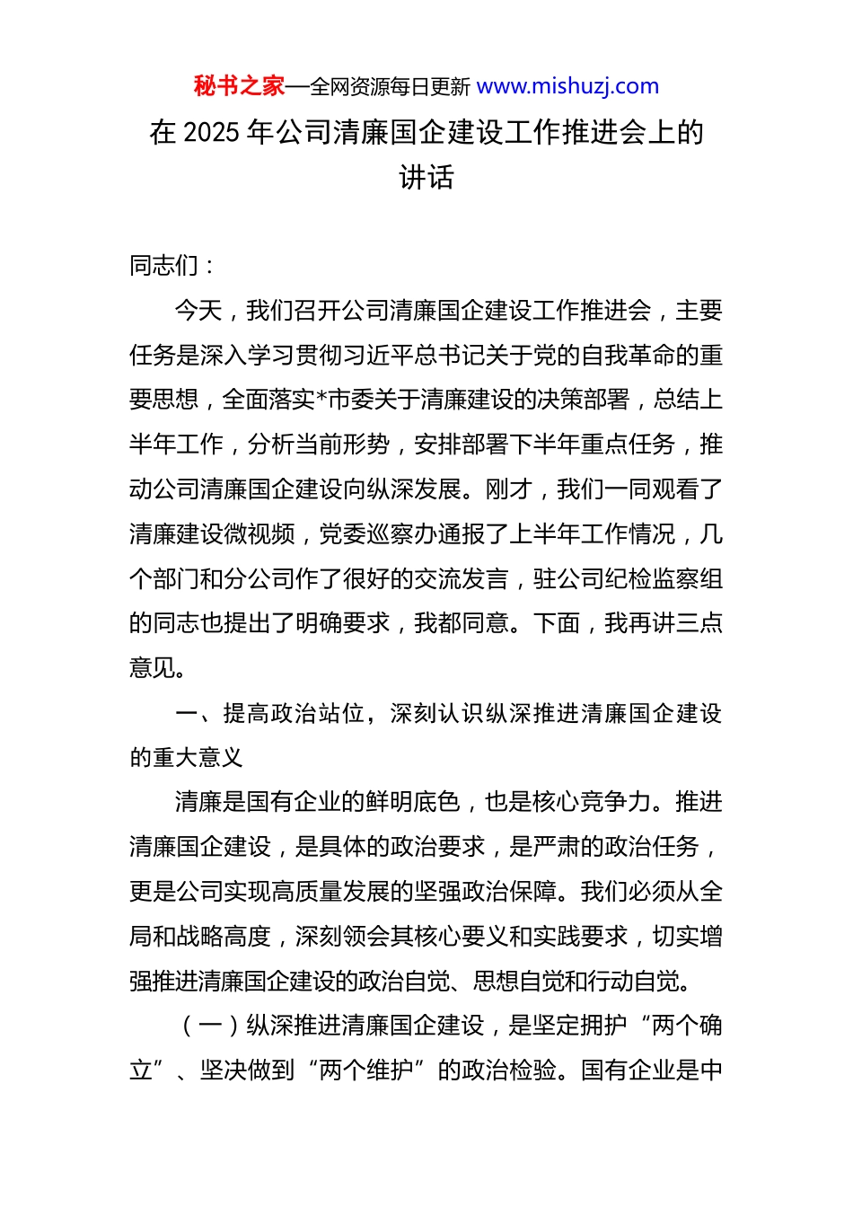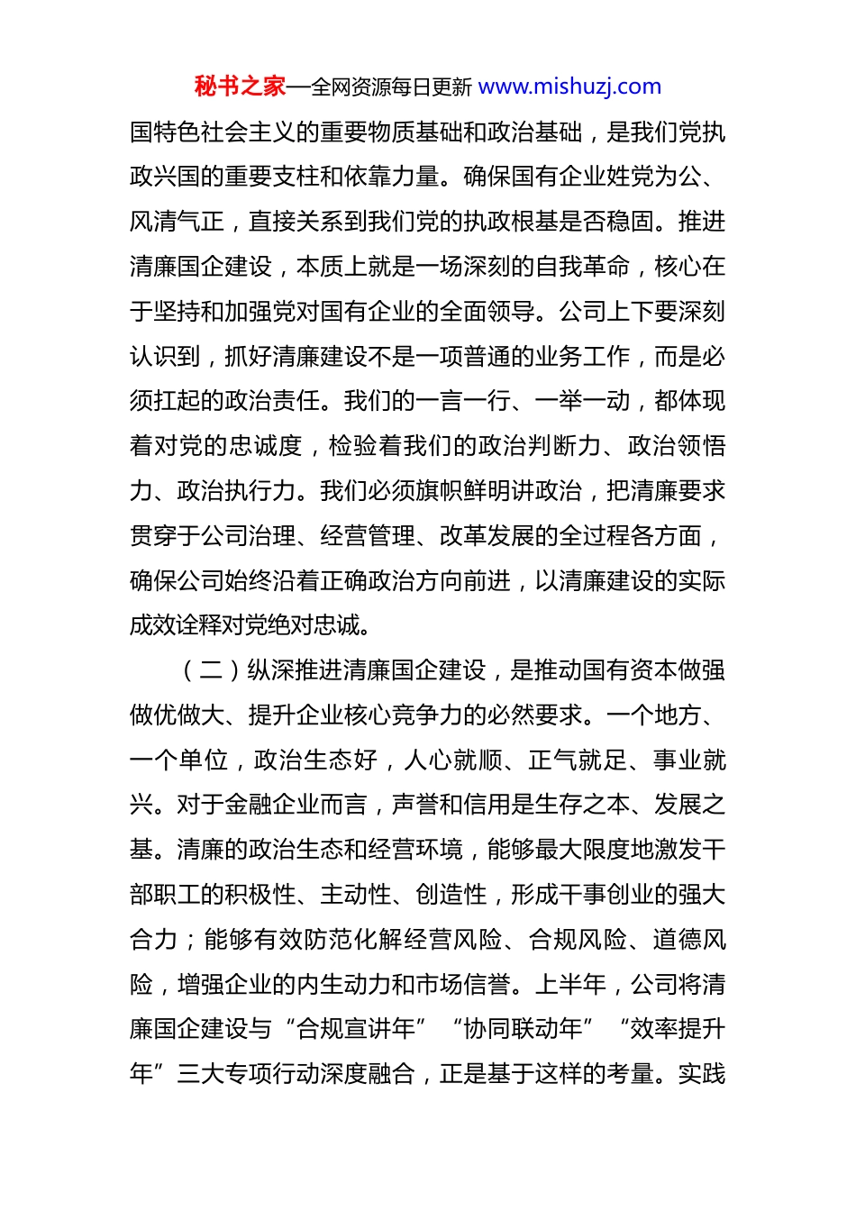 秘书之家—全网资源每日更新 www.mishuzj.com在 2025 年公司清廉国企建设工作推进会上的讲话 同志们:今天,我们召开公司清廉国企建设工作推进会,主要任务是深入学习贯彻习近平总书记关于党的自我革命的重要思想,全面落实*市委关于清廉建设的决策部署,总结上半年工作,分析当前形势,安排部署下半年重点任务,推动公司清廉国企建设向纵深发展。刚才,我们一同观看了清廉建设微视频,党委巡察办通报了上半年工作情况,几个部门和分公司作了很好的交流发言,驻公司纪检监察组的同志也提出了明确要求,我都同意。下面,我再讲三点意见。一、提高政治站位,深刻认识纵深推进清廉国企建设的重大意义清廉是国有企业的鲜明底色,也是核心竞争力。推进清廉国企建设,是具体的政治要求,是严肃的政治任务,更是公司实现高质量发展的坚强政治保障。我们必须从全局和战略高度,深刻领会其核心要义和实践要求,切实增强推进清廉国企建设的政治自觉、思想自觉和行动自觉。(一)纵深推进清廉国企建设,是坚定拥护“两个确立”、坚决做到“两个维护”的政治检验。国有企业是中秘书之家—全网资源每日更新 www.mishuzj.com国特色社会主义的重要物质基础和政治基础,是我们党执政兴国的重要支柱和依靠力量。确保国有企业姓党为公、风清气正,直接关系到我们党的执政根基是否稳固。推进清廉国企建设,本质上就是一场深刻的自我革命,核心在于坚持和加强党对国有企业的全面领导。公司上下要深刻认识到,抓好清廉建设不是一项普通的业务工作,而是必须扛起的政治责任。我们的一言一行、一举一动,都体现着对党的忠诚度,检验着我们的政治判断力、政治领悟力、政治执行力。我们必须旗帜鲜明讲政治,把清廉要求贯穿于公司治理、经营管理、改革发展的全过程各方面,确保公司始终沿着正确政治方向前进,以清廉建设的实际成效诠释对党绝对忠诚。(二)纵深推进清廉国企建设,是推动国有资本做强做优做大、提升企业核心竞争力的必然要求。一个地方、一个单位,政治生态好,人心就顺、正气就足、事业就兴。对于金融企业而言,声誉和信用是生存之本、发展之基。清廉的政治生态和经营环境,能够最大限度地激发干部职工的积极性、主动性、创造性,形成干事创业的强大合力;能够有效防范化解经营风险、合规风险、道德风险,增强企业的内生动力和市场信誉。上半年,公司将清廉国企建设与“合规宣讲年”“协同联动年”“效率提升年”三大专项行动深度融合,正是基于这样的考量。实践秘书之家—全网资源每日更新 www.mishuzj.com证明,抓好清廉建设,就能营造出唯实争先的良好氛围,就能增强企业的生命力、提升企业的竞争力。我们必须把清廉建设作为一项固本培元、赋能增效的基础性工程来抓,通过激浊扬清、正本清源,为公司的高质量发展注入源源不断的“廉动力”。(三)纵深推进清廉国企建设,是深入推进全面从严治党、一体推进“三不腐”方针方略的战略举措。党的十八大以来,以习近平同志为核心的党中央以前所未有的决心和力度正风肃纪反腐,开辟了百年大党自我革命的新境界。清廉国企建设,作为全面从严治党体系的重要组成部分,是“三不腐”一体推进在国企领域的具体化、实践化。我们必须清醒地认识到,金融领域的反腐败斗争形势依然严峻复杂,廉洁风险无处不在。稍有不慎,就可能陷入“围猎”的陷阱,给国家和企业造成难以挽回的损失。我们必须坚持严的基调不动摇,以系统施治、标本兼治的理念正风肃纪,持续强化“不敢腐”的震慑,扎牢“不能腐”的笼子,增强“不想腐”的自觉,将严密的制度、严格的执行、严厉的惩处和深入骨髓的廉洁教育结合起来,打好反腐败斗争的攻坚战、持久战。二、坚持问题导向,清醒认识当前清廉国企建设存在的短板弱项上半年,在公司党委的坚强领导和驻公司纪检监察组秘书之家—全网资源每日更新 www.mishuzj.com的有力监督下,在全体干部职工的共同努力下,公司清廉国企建设取得了阶段性成效。我们的政治引领更加有力,管党治党责任进一步压实;我们探索形成了具有*公司特色的发展路径,在服务地方经济、市属国企和上市公司方面实现了更广覆盖;我们的数字化转型和协同联...