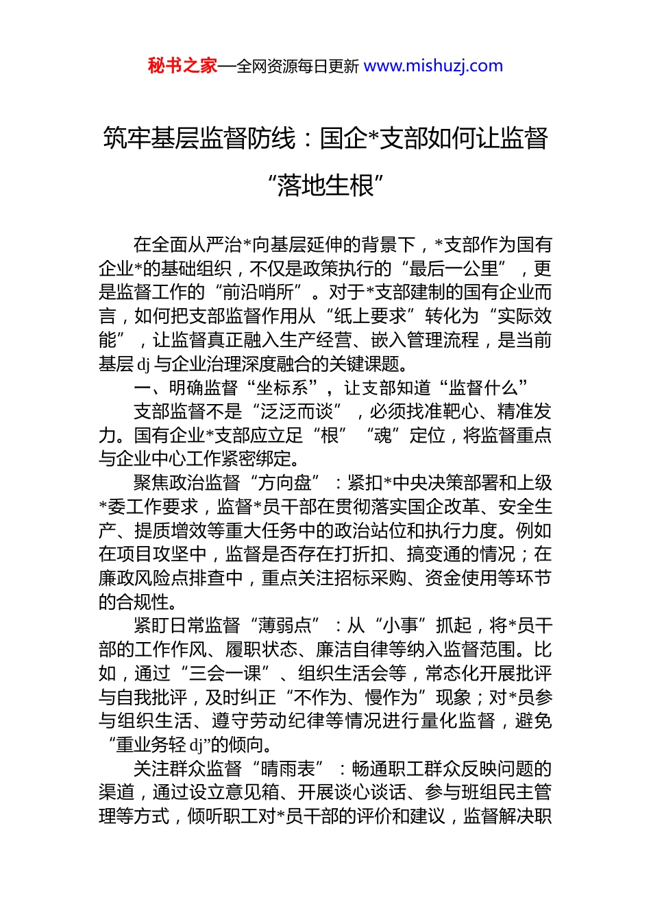 秘书之家—全网资源每日更新 www.mishuzj.com筑牢基层监督防线:国企*支部如何让监督“落地生根”在全面从严治*向基层延伸的背景下,*支部作为国有企业*的基础组织,不仅是政策执行的“最后一公里”,更是监督工作的“前沿哨所”。对于*支部建制的国有企业而言,如何把支部监督作用从“纸上要求”转化为“实际效能”,让监督真正融入生产经营、嵌入管理流程,是当前基层 dj 与企业治理深度融合的关键课题。一、明确监督“坐标系”,让支部知道“监督什么”支部监督不是“泛泛而谈”,必须找准靶心、精准发力。国有企业*支部应立足“根”“魂”定位,将监督重点与企业中心工作紧密绑定。聚焦政治监督“方向盘”:紧扣*中央决策部署和上级*委工作要求,监督*员干部在贯彻落实国企改革、安全生产、提质增效等重大任务中的政治站位和执行力度。例如在项目攻坚中,监督是否存在打折扣、搞变通的情况;在廉政风险点排查中,重点关注招标采购、资金使用等环节的合规性。紧盯日常监督“薄弱点”:从“小事”抓起,将*员干部的工作作风、履职状态、廉洁自律等纳入监督范围。比如,通过“三会一课”、组织生活会等,常态化开展批评与自我批评,及时纠正“不作为、慢作为”现象;对*员参与组织生活、遵守劳动纪律等情况进行量化监督,避免“重业务轻 dj”的倾向。关注群众监督“晴雨表”:畅通职工群众反映问题的渠道,通过设立意见箱、开展谈心谈话、参与班组民主管理等方式,倾听职工对*员干部的评价和建议,监督解决职秘书之家—全网资源每日更新 www.mishuzj.com工关心的“急难愁盼”问题,让监督带着“温度”落地。二、搭建监督“连心桥”,让支部掌握“怎么监督”监督不能“单打独斗”,需要构建上下联动、内外协同的机制,让支部监督有方法、有抓手、有力度。激活“神经末梢”,压实监督责任:明确支部委员、*小组长的监督职责,形成“支部书记负总责、支委分片包联、*员互相监督”的网格化监督体系。例如,支委成员每人联系 1-2 个*小组,定期参与小组活动,指导监督工作;*小组长负责日常提醒,对苗头性问题及时“咬耳扯袖”,把问题解决在萌芽状态。用好“制度武器”,规范监督流程:结合企业实际制定《支部监督工作细则》,明确监督的程序、方式和结果运用。比如,对发现的问题实行“清单化管理”,建立“发现问题—提出整改—跟踪问效—验收销号”的闭环机制;将监督结果与*员评议、绩效考核、评优评先挂钩,让“软监督”产生“硬约束”。创新“数字赋能”,提升监督效能:利用企业内部管理系统、dj 信息化平台等,实现监督数据的实时共享和动态跟踪。例如,通过线上打卡、流程留痕等功能,监督*员参与学习、完成工作任务的情况;对高风险业务环节设置“电子预警”,一旦出现异常操作,及时推送支部介入监督,让科技为监督“提效增速”。三、凝聚监督“向心力”,让支部确保“监督有效”监督的生命力在于“常”“长”二字,需要通过强化保障、营造氛围,让*员干部习惯在监督下工作和生活。强化教育引导,筑牢思想防线:通过廉政*课、案例警示教育、红色教育基地参观等,让*员干部深刻认识“监督是保护不是约束”,主动接受监督、习惯被监督。例如,组织观看国企领域腐败案例纪录片,结合身边人身边事开展讨论,增强拒腐防变的自觉。鼓励大胆监督,消除“怕得罪人”顾虑:支部书记要秘书之家—全网资源每日更新 www.mishuzj.com带头接受监督、带头开展监督,为委员和*员“撑腰鼓劲”。在组织生活会上,明确“批评不是找茬,监督不是添乱”的导向,引导*员放下思想包袱,对违规违纪行为“零容忍”,让监督成为*内政治生活的常态。注重成果转化,彰显监督价值:将监督中发现的问题、总结的经验,转化为改进工作的具体举措。比如,针对监督中发现的管理漏洞,推动修订企业规章制度;针对*员作风问题,开展专项整治行动,让职工群众感受到“监督不是走过场,整改不是喊口号”,以实实在在的成效提升支部监督的公信力。国有企业*支部监督作用的发挥,既是全面从严治*的必然要求,也是企业健康发展的重要保障。唯有将监督融入日常、做在经常,让每个支部都成为“监督堡垒”,每...