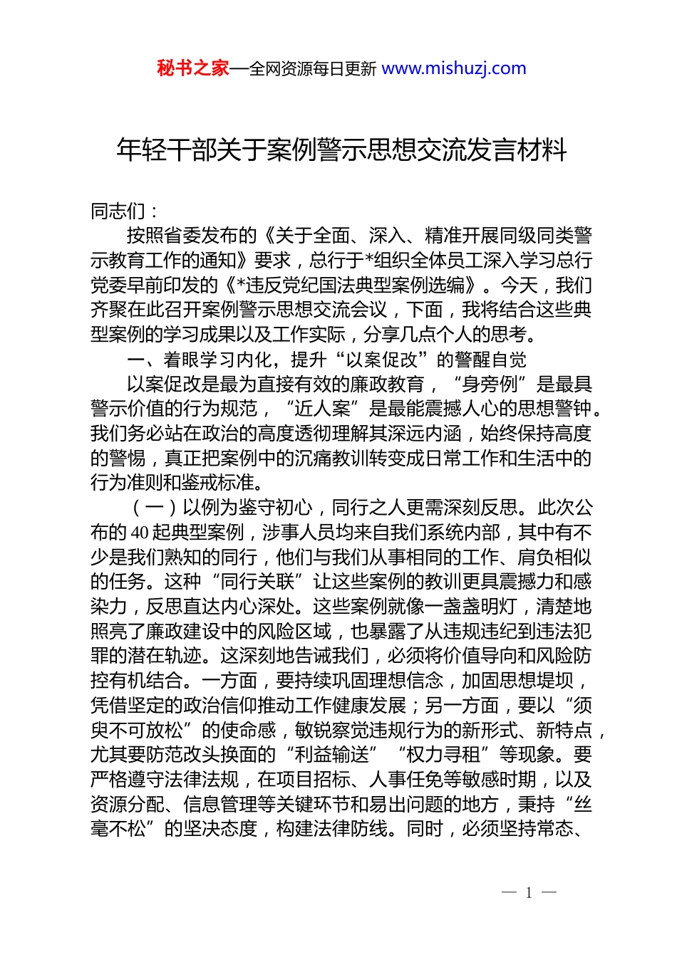 秘书之家—全网资源每日更新 www.mishuzj.com年轻干部关于案例警示思想交流发言材料同志们:按照省委发布的《关于全面、深入、精准开展同级同类警示教育工作的通知》要求,总行于*组织全体员工深入学习总行党委早前印发的《*违反党纪国法典型案例选编》。今天,我们齐聚在此召开案例警示思想交流会议,下面,我将结合这些典型案例的学习成果以及工作实际,分享几点个人的思考。一、着眼学习内化,提升“以案促改”的警醒自觉以案促改是最为直接有效的廉政教育,“身旁例”是最具警示价值的行为规范,“近人案”是最能震撼人心的思想警钟。我们务必站在政治的高度透彻理解其深远内涵,始终保持高度的警惕,真正把案例中的沉痛教训转变成日常工作和生活中的行为准则和鉴戒标准。(一)以例为鉴守初心,同行之人更需深刻反思。此次公布的 40 起典型案例,涉事人员均来自我们系统内部,其中有不少是我们熟知的同行,他们与我们从事相同的工作、肩负相似的任务。这种“同行关联”让这些案例的教训更具震撼力和感染力,反思直达内心深处。这些案例就像一盏盏明灯,清楚地照亮了廉政建设中的风险区域,也暴露了从违规违纪到违法犯罪的潜在轨迹。这深刻地告诫我们,必须将价值导向和风险防控有机结合。一方面,要持续巩固理想信念,加固思想堤坝,凭借坚定的政治信仰推动工作健康发展;另一方面,要以“须臾不可放松”的使命感,敏锐察觉违规行为的新形式、新特点,尤其要防范改头换面的“利益输送”“权力寻租”等现象。要严格遵守法律法规,在项目招标、人事任免等敏感时期,以及资源分配、信息管理等关键环节和易出问题的地方,秉持“丝毫不松”的坚决态度,构建法律防线。同时,必须坚持常态、— 1 —秘书之家—全网资源每日更新 www.mishuzj.com早防、小处着手,从经费预算管理、办公用品采购等细小事务抓起,常存对法律规章的敬重之感,常保持清正廉洁的行为操守,避免小疏忽发展成大灾祸,以同行的不幸遭遇时刻提醒自己,做到警笛长鸣、自省自律。(二)自查自纠强党性,用信念坚定抵御侵蚀。案例中的当事人,很多都是在思想上出现了松动,党性修养出现了滑坡,才逐渐陷入违规违纪的泥沼。我们要以他们为反面教材,进行深刻的自查自纠。审视自己在面对各种利益诱惑时,是否能坚守党性原则;在工作决策中,是否能秉持公正公平公开;在与他人交往中,是否能保持清正廉洁的界限。通过这种自我反思,进一步强化党性锻炼,让党性成为抵御各种不良侵蚀的坚强堡垒。要加强政治理论学习,用先进的思想武装自己的头脑,不断提高政治判断力、政治领悟力、政治执行力。只有信念如磐,才能在复杂的工作环境和社会环境中,坚守正道,不被歪风邪气所左右。二、立足工作实际,强化“以案治本”的行动自觉(一)健全制度,堵塞漏洞。从这些典型案例可以看出,很多问题的产生是由于制度存在漏洞或者执行不到位。我们要以案例为依据,对现有的各项制度进行全面梳理。在财务管理制度方面,要进一步明确经费使用的标准和审批流程,防止出现违规报销、挪用公款等现象;在业务操作流程方面,要细化每个环节的操作规范,避免因操作不规范而引发的风险;在内部监督制度方面,要强化监督的力度和频率,确保权力在阳光下运行。同时,要建立制度执行的长效机制,加强对制度执行情况的检查和考核,对违反制度的行为要严肃问责,使制度真正成为带电的“高压线”。(二)加强监督,防微杜渐。监督是防止腐败滋生的重要防线。我们要建立健全全方位、多层次的监督体系。在内部监督上,要充分发挥纪检国家监察委员会门的职能作用,加强对— 2 —秘书之家—全网资源每日更新 www.mishuzj.com党员干部的日常监督,特别是对关键岗位、重要人员的监督。通过开展廉政谈话、专项检查等方式,及时发现问题并加以纠正。在外部监督上,要拓宽监督渠道,主动接受群众监督、社会监督。设立举报信箱、举报电话等,鼓励广大员工和社会群众对违规违纪行为进行举报。同时,要运用现代信息技术手段,加强对业务数据的监控和分析,及时发现异常情况,做到早发现、早预防。(三)强化教育,涵养文化。警示教育不能只是一时之举...