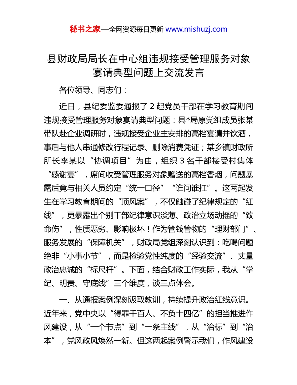 秘书之家—全网资源每日更新 www.mishuzj.com县财政局局长在中心组违规接受管理服务对象宴请典型问题上交流发言各位领导、同志们:近日,县纪委监委通报了 2 起党员干部在学习教育期间违规接受管理服务对象宴请典型问题:县*局原党组成员张某带队赴企业调研时,违规接受企业主安排的高档宴请并饮酒,事后与他人串通修改行程记录、删除消费凭证;某乡镇财政所所长李某以“协调项目”为由,组织 3 名干部接受村集体“感谢宴”,席间收受管理服务对象赠送的高档香烟,问题暴露后竟与相关人员约定“统一口径”“谁问谁扛”。这两起发生在学习教育期间的“顶风案”,不仅触碰了纪律规定的“红线”,更暴露出个别干部纪律意识淡薄、政治立场动摇的“致命伤”,性质恶劣、影响极坏!作为管钱管物的“理财部门”、服务发展的“保障机关”,财政局党组深刻认识到:吃喝问题绝非“小事小节”,而是检验党性纯度的“经验交流”、丈量政治忠诚的“标尺杆”。下面,结合财政工作实际,我从“学纪、明责、守底线”三个维度,谈三点体会。一、从通报案例深刻汲取教训,持续提升政治红线意识。近年来,党中央以“得罪千百人、不负十四亿”的担当推进作风建设,从“一个节点”到“一条主线”,从“治标”到“治本”,党风政风焕然一新。但这两起案例警示我们,作风建设秘书之家—全网资源每日更新 www.mishuzj.com永远在路上,稍有松懈就可能反弹回潮。张某、李某等人身为党员干部,本应带头遵守党纪党规,却在学习教育中搞“上有政策、下有对策”——或删除关键信息“隐痕”,或私下约定“封口”,或审核放水“护短”。这种“学归学、做归做”的阳奉阴违,本质上是把纪律规定当“纸老虎”“稻草人”,把组织纪律当“橡皮筋”。历史和现实反复证明:纪律是带电的高压线,触碰必遭惩戒;规矩是不可逾越的红线,跨越必受严惩。二、从舌尖腐败审视党性之亏,深刻领会作风问题本质。吃喝问题,表面看是“管不住嘴”,根子上是“守不住心”。张某、李某等人借“调研”“协调”之名搞“酒杯外交”,背后藏着三重“政治病”:其一,对党不忠诚。把学习教育当“走过场”,把组织要求当“耳旁风”,甚至与相关人员串供,是典型的“两面人”做派;其二,对人民不敬畏。把公权力异化为“私权”,用管理服务对象的“宴请”置换“人情”,用财政资金“买单”换取“便利”,是对群众利益的直接侵害;其三,对责任不担当。作为财政系统干部,本应把“过紧日子”要求贯穿资金管理全过程,却因“抹不开面子”“拉不下面子”放松要求,是失职失责的表现。作风问题无小事,政治问题无侥幸。党员干部若连“舌尖上的防线”都守不住,又何谈守住“政治上的生命线”。秘书之家—全网资源每日更新 www.mishuzj.com三、从破立并举强化责任担当,严格筑牢财政清风屏障。习近平总书记强调:“公款姓公,一分一厘都不能乱花;公权为民,一丝一毫都不能私用。”结合财政工作实际,我们要以“三个坚决”抓好整改落实:一是坚决以“零容忍”态度严查违纪行为。针对财政系统可能存在的“酒桌审批”“饭局报销”“利益输送”等问题,开展“吃拿卡要”专项整治,对顶风违纪的“露头就打”,对隐形变异的“深挖细查”,对包庇纵容的“连带追责”,坚决斩断“酒杯—订单—利益”的链条,让“想搞歪门邪道的人”不敢伸手、不能伸手。二是坚决以“制度铁笼”规范权力运行。聚焦财政资金分配、项目审批、政府采购等关键环节,修订《局机关公务接待管理办法》《财政资金审批“十不准”》等制度,推行“阳光财政”,重大项目实行“三重一大”集体决策,惠民资金实行“全流程公示”,公务接待实行“无公函不接待、超标准不报销”,真正把权力关进制度的“笼子”。三是以“关键少数”带动“绝大多数”。班子成员要带头签订《严守纪律规定承诺书》,在“管嘴”上作表率——不该吃的饭坚决不吃,不该喝的酒坚决不喝;在“用权”上树标杆——把每一笔钱都用在“刀刃上”“紧要处”,坚决杜绝“形象工程”“面子工程”。同时,加强对干部职工的日常监督,对苗头性、倾向性问题早提醒、早纠正,坚决防止“小错酿成大祸”。秘书之家—全网资源每...