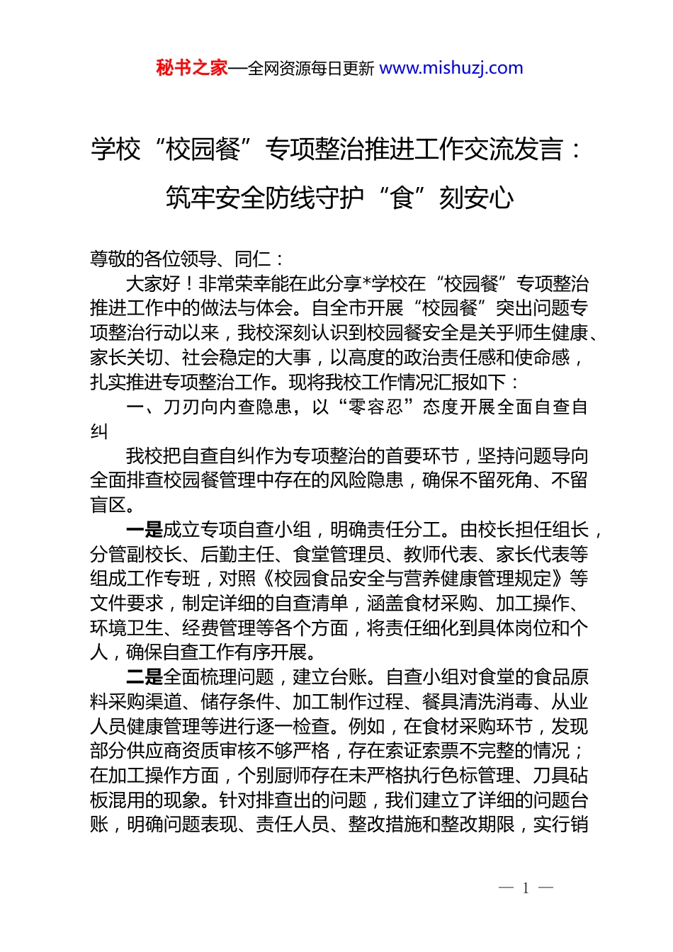 秘书之家—全网资源每日更新 www.mishuzj.com学校“校园餐”专项整治推进工作交流发言:筑牢安全防线守护“食”刻安心尊敬的各位领导、同仁:大家好!非常荣幸能在此分享*学校在“校园餐”专项整治推进工作中的做法与体会。自全市开展“校园餐”突出问题专项整治行动以来,我校深刻认识到校园餐安全是关乎师生健康、家长关切、社会稳定的大事,以高度的政治责任感和使命感,扎实推进专项整治工作。现将我校工作情况汇报如下:一、刀刃向内查隐患,以“零容忍”态度开展全面自查自纠我校把自查自纠作为专项整治的首要环节,坚持问题导向全面排查校园餐管理中存在的风险隐患,确保不留死角、不留盲区。一是成立专项自查小组,明确责任分工。由校长担任组长,分管副校长、后勤主任、食堂管理员、教师代表、家长代表等组成工作专班,对照《校园食品安全与营养健康管理规定》等文件要求,制定详细的自查清单,涵盖食材采购、加工操作、环境卫生、经费管理等各个方面,将责任细化到具体岗位和个人,确保自查工作有序开展。二是全面梳理问题,建立台账。自查小组对食堂的食品原料采购渠道、储存条件、加工制作过程、餐具清洗消毒、从业人员健康管理等进行逐一检查。例如,在食材采购环节,发现部分供应商资质审核不够严格,存在索证索票不完整的情况;在加工操作方面,个别厨师存在未严格执行色标管理、刀具砧板混用的现象。针对排查出的问题,我们建立了详细的问题台账,明确问题表现、责任人员、整改措施和整改期限,实行销— 1 —秘书之家—全网资源每日更新 www.mishuzj.com号管理,确保问题整改到位。三是广泛征求意见,主动接受监督。通过召开家长座谈会、发放调查问卷、设立意见箱等方式,广泛征求师生、家长对校园餐的意见和建议。共收集到关于菜品口味、营养搭配、就餐环境等方面的意见建议 50 余条,为后续整改工作提供了重要参考。二、靶向施策抓整改,以“钉钉子”精神推动问题彻底解决针对自查和征求意见过程中发现的问题,我校制定了切实可行的整改方案,采取有力措施,确保问题整改取得实效。一是严格规范食材采购管理。我们建立了严格的供应商准入和退出机制,对现有供应商进行重新审核,淘汰了 3 家资质不全、信誉不佳的供应商。同时,引入优质供应商,与本地大型农产品生产基地、正规食品企业建立长期合作关系,确保食材源头可追溯、质量有保障。在采购流程上,严格执行索证索票制度,要求供应商提供每批次食材的检验检疫合格证明、进货票据等,做到“来源可查、去向可追”。此外,我们还实行了食材验收双人负责制,由食堂管理员和教师代表共同对采购的食材进行验收,确保食材质量符合标准。二是强化加工操作规范。组织食堂从业人员参加食品安全知识培训和技能考核,邀请市场监管部门的专家进行现场指导,进一步提升从业人员的食品安全意识和操作技能水平。修订完善了《食堂操作规范手册》,细化了各岗位操作流程和标准,明确了 28 个关键控制点,并严格落实色标管理、生熟分开、烧熟煮透等要求。例如,我们为不同用途的刀具、砧板、容器等标注了不同颜色的标识,有效避免了交叉污染;对每餐次的食品成品进行留样,留样时间不少于 48 小时,并做好详细记录。三是加强经费管理和信息公开。建立了膳食经费专账管理制度,严格执行“零利润”要求,确保每一分钱都用在学生餐— 2 —秘书之家—全网资源每日更新 www.mishuzj.com食上。通过“校园一卡通”系统实时公示食堂收支明细、食材采购价格、学生餐费使用情况等信息,让师生和家长清楚了解经费去向。同时,定期组织家长代表参与食堂成本核算和监督,增强经费使用的透明度和公信力。三、健全机制促长效,以“常态化”管理巩固整治成果校园餐安全是一项长期工作,我校注重建立健全长效管理机制,将专项整治工作与日常管理相结合,持续提升校园餐管理水平。一是完善制度体系。在原有制度的基础上,进一步修订完善了《校园食堂食品安全管理制度》《从业人员健康管理制度》《食品安全事故应急预案》等一系列制度,形成了一套完整的校园餐管理制度体系,为校园餐管理工作提供了制度保障。二是加强监督考核。建...
